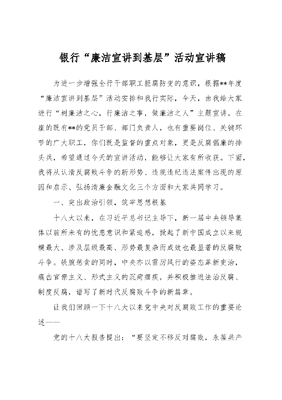 银行廉洁宣讲到基层活动宣讲稿为进一步增强全行干部职工拒腐防变的意识,根据**年度廉洁宣讲到基层活动安排和我行实际,今天,由我给大家进行树廉洁之心,行廉洁之事,做廉洁之人主题宣讲。在座的既有**的党员干部、部门负责人,也有重要岗位、关键环节的广大职工,你们既是监督的重点对象,更是反腐倡廉的排头兵,希望通过今天的宣讲活动,能够让大家有所收获。下面,我将从认清反腐败斗争的新形势、违规违纪违法案件出现的原因和启示、弘扬清廉金融文化三个方面和大家共同学习。一、突出政治引领,筑牢思想根基十八大以来,在习近平总书记主导下,新一届中央领导集体以前所未有的忧患意识和紧迫感,掀起了新中国成立以来规模最大、涉及层级最高、形势最复杂而成效也最显著的反腐败斗争。铁腕惩贪的同时,中央亦以雷厉风行的姿态革新吏治,痛击官僚主义、形式主义的沉疴痼疾,并积极推进法治反腐、制度反腐,谱写了新时代反腐败斗争的新篇章。让我们回顾一下十八大以来党中央对反腐败工作的重要论述——党的十八大报告提出:要坚定不移反对腐败,永葆共产党人清正廉洁的政治本色。反对腐败、建设廉洁政治,是党一贯坚持的鲜明政治立场,是人民关注的重大政治问题。这个问题解决不好,就会对党造成致命伤害,甚至亡党亡国。党的十九大报告提出:当前,反腐败斗争形势依然严峻复杂,夺取压倒性胜利的决心必须坚如磐石。十九届中央纪委三次全会提出:取得全面从严治党更大战略性成果,巩固发展反腐败斗争压倒性胜利。十九届中央纪委五次全会提出:坚定不移推进反腐败斗争,不断实现不敢腐、不能腐、不想腐一体推进战略目标。党的二十大提出:腐败是危害党的生命力和战斗力的最大毒瘤,反腐败是最彻底的自我革命。只要存在腐败问题产生的土壤和条件,反腐败斗争就一刻不能停,必须永远吹冲锋号,坚持不敢腐、不能腐、不想腐一体推进,以零容忍态度反腐惩恶,决不姑息。习近平总书记在二十届中央纪委二次全会上再次强调,反腐败斗争形势依然严峻复杂,遏制增量、清除存量的任务依然艰巨。二十届中央纪委二次全会对坚决打赢反腐败斗争攻坚战持久战作出部署,要求严查重点问题,突出重点领域,紧盯重点对象,强调坚持不敢腐、不能腐、不想腐一体推进,更加有力遏制增量,更加有效清除存量。这些深刻的论断,从战略和全局的高度进一步阐明了党风廉政建设和反腐倡廉斗争的极端重要性和紧迫性。由此我们不难看出,党中央坚持打击腐败的决心没有变,对腐败问题零容忍的态度没有变,对腐败的高压态势没有变。我们必须牢记清廉是福、贪欲是祸,经常对照党的理论和路线方针政策、对照党章党规党纪、对照初心使命,时刻自重自省、紧跟时代步伐、积极响应号召,真正承担起新时代的历史使命,做反腐倡廉的生力军,营造浓厚的清廉金融文化氛围,全面提升防控金融风险质效。二、多思贪欲之害,常怀律己之心近年来,党中央在反腐倡廉工作上决心和力度空前强大,取得了明显成效,但是,不可否认的是一些重点领域如金融行业腐败现象仍然存在,且具有以下三个特征:一是心存侥幸,在金钱的诱惑下底线失守;二是作案手法隐蔽,以貌似合法的形式掩盖违法行为;三是利用职权违规决策、违规操作,造成资产严重损失。究其根本原因,其实可以归纳为三条,即理想信念动摇、内部治理失衡、监督体系失效。如果说金融是经济的血脉,农信社和农商行则是联系三农的金融纽带,基层农信中一旦出现违规违纪违法案件,不但会对自身、对行业造成恶劣影响,更会伤害农信社与农民群体之间的深厚情感,影响农村经济的平稳运行。在**违纪违法案件警示录中我们可以看到,部分**的工作人员私欲膨胀、信念动摇、行为失范,最终在道德约束、行业规范、法律底线面前完全失守,锒铛入狱。下面我分享几个发生在银行系统中的典型案例,与大家共诫共勉——〔案例一〕**信托有限公司原党委书记、董事长**违规收受礼品、礼金,接受可能影响公正执行公务的宴请和旅游安排问题。2015年中秋至2022年春节,赵卫华先后违规收受礼金、消费卡共计45万元和20箱茅台酒等。2015年春节至2021年春节,赵卫华多次接受私营企业主付某等人宴请。2015年7月,赵卫华及亲属接受管理服务对象仪某安排,前往马尔代夫旅游。赵卫华还存在其他严重违纪违法问题。2022年7月,赵卫华被开除党籍、开除公职,违纪违法所得予以收缴,其涉嫌犯罪问题被移送检察机关依法审查起诉。〔案例二〕**县农村信用合作社联社原主任、理事长**违规收受礼品、礼金。2013年至2021年春节期间,辛洪军多次违规收受管理和服务对象赠送的礼品、礼金,合计67700元。辛洪军还存在其他违纪违法问题。2022年8月,辛洪军被开除党籍,并被**农村商业银行股份有限公司开除,其涉嫌犯罪问题被移送检察机关依法审查起诉。〔案例三〕**省农村信用社联合社原党委书记、理事长**先后利用其担任**省农村