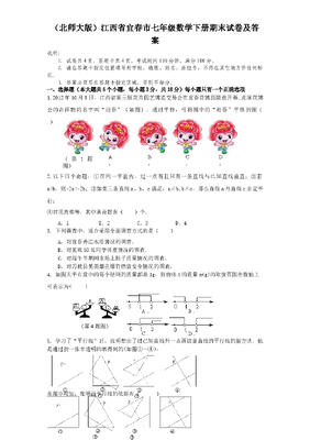 AAA.B.C.D.(第4题图)(北师大版)江西省宜春市七年级数学下册期末试卷及答案 说明:1.试卷共4页,答题卡共4页。考试时间100分钟,满分100分。2.请在答题卡指定位置填写好学校、班级、姓名、座位号,不得在其它地方作任何标记。3.答案必须写在答题卡指定区域,否则不给分。一、选择题(本大题共6个小题,每小题3分,共18分)每小题只有一个正确选项1.2012年10月8日,江西省第三届花卉园艺博览交易会在宜春花博园隆重开幕,此届花博会的吉祥物的名字叫迎春(如图).通过平移,可将图中的迎春平移到图( )2.以下四个命题:①在同一平面内,过一点有且只有一条直线与已知直线垂直;②若a>b,则-2a>-2b;③如果三条直线a、b、c满足:a∥b,b∥c,那么直线a与直线c必定平行;④对顶角相等,其中真命题有()个. A.1 B.2C.3D.43. 下列调查中,适合采用全面调查方式的是()A.对宜春秀江水质情况的调查. B.对某班50名同学体重情况的调查.C. 对端午节期间市场上粽子质量情况的调查.D.对万载县某类烟花爆竹燃放安全情况的调查.4. 如图天平右盘中的每个砝码的质量都是1g,则物体A的质量m(g)的取值范围在数轴上可表示为( ) 5.学习了平行线后,张明想出了过己知直线外一点画这条直线的平行线的新方法,他是通过折一张半透明的纸得到的(如图①~④):从图中可知,张明画平行线的依据有()A.B.C.D.(第1题图)①② ① ③①④①② ① ③①④ACFDEBG(第14题图)(1) 两直线平行,同位角相等; (2) 两直线平行,内错角相等;(3) 同位角相等,两直线平行; (4) 内错角相等,两直线平行.A.(1) (2) B.(2) (3) C.(1) (4) D.(3) (4)6. 关于x、y的二元一次方程组ayxayx13313的解满足不等式yx>0,则a的取值范围是()A.a<-1B.a<1 C.a>-1 D.a>1 二、填空题(本大题共8个小题,每小题3分,共24分)7.2013的算术平方根是 .来源:http://www.bcjy123.com/tiku/8.下列实数中:36,0,113,0.1010010001…(每两个1之间多一个0),, 7,-3.14,无理数有 个.9.已知点P(a,b)在第四象限,则点Q(b,-a)在第______象限.10.如图,直线AB与直线CD相交于点O,OE垂直AB,∠EOD=30°,则∠BOC=.11.请写出一个以x,y为未知数的二元一次方程组,且同时满足下列两个条件:①由两个二元一次方程组成;②方程组的解为21yx,这样的方程组可以是____________.12.如图,将一个宽度相等的纸条沿AB折叠一下, 如果∠1=130º,那么∠2=.13.某种药品的说明书上注明:口服,每天30~60mg,分2~3次服用.这种药品一次服用的剂量范围是_____mg~_____mg.14.将直角三角形ABC沿CB方向平移BE的距离后,得到直角三角形DEF.已知AG=4,BE=6,DE=12,则阴影部分的面积为 .三、(本大题共4个小题,每小题5分,共20分)15.计算:4189316.解方程组:3231yxyx17. x取哪些非负整数时,325x的值大于213x与1的差.ABCDEO(第10题图)AB12(第12题图)18. 解不等式组37522735xxxx ,并将解集在数轴上表示出来. 四、(本大题共3个小题,每小题7分,共21分) 来源:http://www.bcjy123.com/tiku/19. 如图,∠B=42°,∠1=∠2+10°,∠ACD=64°,∠ACD的平分线与BA的延长线相交于点E.(1)请你判断BF与CD的位置关系,并说明理由.(2)求∠3的度数.20. 方格纸中每个小方格都是边长为1个单位长度的正方形,在平面直角坐标系中,已知点A(-4,3)、B(-2,-3).(1)描出A、B两点的位置,并连结AB、AO、BO.(2)△AOB的面积是__________.(3)把△AOB向右平移4个单位,再向上平移2个单位得到ABO,在图中画出ABO,并写出点A、B、O的坐标.21.暑假期间,学校布置了综合实践活动任务,王涛小组四人负责调查本村的500户农民的家庭