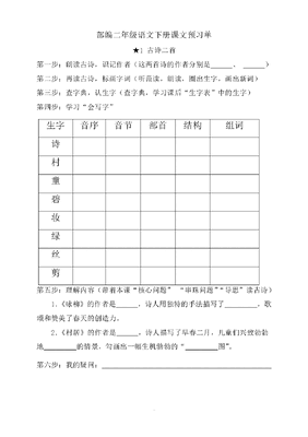 ..部编二年级语文下册课文预习单★1古诗二首第一步:朗读古诗,识记作者(这两首诗的作者分别是、)第二步:再读古诗,标画字词(听范读,朗读,圈出生字,画出新词)第三步:查字典,认生字(查字典,学习课后生字表中的生字)第四步:学习会写字第五步:理解内容(带着本课核心问题串珠问题导思读古诗)1.《咏柳》的作者是,诗人用独特的手法描写了,歌颂和赞美了春天的创造力。2.《村居》的作者是,诗人描写了早春二月,儿童们兴致勃勃地的情景,勾画出一幅生机勃勃的图。第六步:我的疑问:生字音序音节部首结构组词诗村童碧妆绿丝剪..★2找春天第一步:朗读课文,标自然段(本课共有自然段)第二步:再读课文,标画字词(听范读,朗读,圈出生字,画出新词)第三步:查字典,认生字(查字典,学习课后生字表中的生字)第四步:学习会写字第五步:根据课文内容填空。本文把春天比作。她,所以遮遮掩掩,躲躲藏藏;她,有着嫩绿的秀眉和色彩斑斓的眼睛;她,快乐地荡着秋千,兴奋地叫着、笑着……第六步:我的疑问:生字音序音节部首结构组词冲寻姑娘吐柳荡桃杏..★3开满鲜花的小路第一步:朗读课文,标自然段(本课共有自然段)第二步:再读课文,标画字词(听范读,朗读,圈出生字,画出新词)第三步:查字典,认生字(查字典,学习课后生字表中的生字)第四步:学习会写字*帮你学生字。邮:左右结构,右边的阝不要写成卩。递:半包围结构,书写时注意辶的写法。原:半包围结构,由厂+白+小组成。第五步:根据课文内容填空。本文是一个充满儿童情趣的故事,它运用的手法,讲述了长颈鹿大叔寄来包裹,鼹鼠先生不小心把包裹里的小颗粒漏在路上,春天的时候,通往松鼠太太家的路上开满了鲜花的故事。生字音序音节部首结构组词鲜邮递员原叔局堆礼..第六步:我的疑问:★4邓小平爷爷植树第一步:朗读课文,标自然段(本课共有自然段)第二步:再读课文,标画字词(听范读,朗读,圈出生字,画出新词)第三步:查字典,认生字(查字典,学习课后生字表中的生字)第四步:学习会写字第五步:根据课文内容填空。本文写的是1987年4月5日,83岁高龄的爷爷在北京天坛公园亲手栽种柏树的经过。如今,这棵柏树已成了天坛公园一处美丽的风景。第六步:我的疑问:生字音序音节部首结构组词邓植格引注满休息..★5雷锋叔叔,你在哪里第一步:朗读课文,标节序(本诗共有小节)第二步:再读课文,标画字词(听范读,朗读,圈出生字,画出新词)第三步:查字典,认生字(查字典,学习课后生字表中的生字)第四步:学习会写字【读读记记】曾经蒙蒙泥泞顺路迈进踏步荆棘花瓣晶莹寻觅需要奉献第五步:根据诗歌内容填空。本文是一首________,读完这首诗,我们明白了人们寻找雷锋,呼唤雷锋,其实就是寻找______________,号召大家向雷锋同志学习。第六步:我的疑问:生字音序音节部首结构组词锋昨冒留弯背洒温暖..★6千人糕第一步:朗读课文,标自然段(本课共有自然段)第二步:再读课文,标画字词(听范读,朗读,圈出生字,画出新词)第三步:查字典,认生字(查字典,学习课后生字表中的生字)第四步:学习会写字【读读记记】雪糕特别好嘛买卖面粉糖水甘蔗果汁青菜熬夜计算劳动销售的确第五步:根据课文内容填空。千人糕就是______________________,它是把______________做的,______是农民种的稻子加工出来的,农民种稻子需要__________、农具、肥料、__________……第六步:我的疑问:生字音序音节部首结构组词能桌味买具甘甜菜劳..7一匹出色的马第一步:朗读课文,标自然段(本课共有自然段)第二步:再读课文,标画字词(听范读,朗读,圈出生字,画出新词)第三步:查字典,认生字(查字典,学习课后生字表中的生字)第四步:学习会写字【读读记记】郊外广泛波纹大葱柔软地毯异常恋恋不舍要求一株拾起骑马跨越第五步:根据课文内容填空。本文写的是我们一家人在傍晚去散步,往回走的时候,妹妹累了,要妈妈、爸爸抱,爸爸想了个办法:从路旁拾起一根__________的柳条,告诉她这是______________,结果妹妹很快回到家的故事。第六步:我的疑问:生字音序音节部首结构组词匹妹波纹像景恋舍求.★识字1神舟谣第一步:朗读诗歌,标节序(本课共有个小节)第二步:再读诗歌,标画字词(听范读,朗读,圈出生字,画出新词)第三步:查字典,认生字(查字典,学习课后生字表中的生字)第四步:学习会写字【读读记记】繁荣奋发涌动山峰耸立港湾隔开海峡陆地友谊浓密神州与其整齐第五步:根据课文内容填空。本文主要学了关于神州的几个词语:__________、__________、__________、珠峰和__________