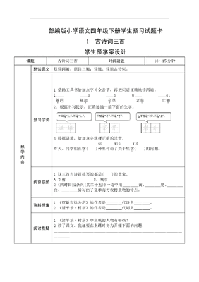 部编版小学语文四年级下册学生预习试题卡1古诗词三首学生预学案设计课题古诗词三首时间建议10~15分钟预学内容熟读课文默读两遍,朗读三遍,读通、读顺古诗词。预习字词1.借助工具书给加点字补全音节,再把词语正确地读两遍。l________ū____áw________ài篱.笆稀疏.杂.草老翁.亡赖.2.根据书写提示,正确地描一描下面的生字。3.根据语境,给加点字选择正确的读音。sùxiùxiǔ昨天,同学们在宿.()舍里讨论了关于星宿.()的问题。内容感知1.这三首古诗词描写的都是()的景象。A.农村B.城市2.《四时田园杂兴(其二十五)》一诗中用________黄、________肥、________白、________稀写出了夏季南方农村景物的特点。资料搜集1.《宿新市徐公店》的作者是________代诗人________。2.《清平乐·村居》的作者是________代词人________。阅读质疑1.《清平乐·村居》中出现的人物有哪些?2.读了课文,我还要在上课时努力弄懂下面的问题:________________________________________________________________________2乡下人家学生预学案设计课题乡下人家时间建议10~15分钟预学内容熟读课文1.课文共有()个自然段。2.默读一遍,朗读两遍,读通、读顺课文。预习字词1.把词语中的加点字的音节补全。p____h________iéf________ǎng朴.素绘.成和谐.附.近倘.若2.根据书写提示,工整地描一描下面的生字。3.借助工具书或联系上下文理解下列词语,并选词填空。照例装饰时令天高地阔上面的词语中,有按照惯例,按照常情的意思的词语是____________,有季节的意思的词语是____________。内容感知《乡下人家》这篇课文给我们描绘了七幅图,分别是:______________、______________、______________、______________、______________、______________、______________。资料搜集搜集关于本文作者陈醉云的资料。阅读质疑1.本文最后一个自然段在文中起什么作用?2.读了课文,我还要在上课时努力弄懂下面的问题:________________________________________________________________________3天窗学生预学案设计课题天窗时间建议10~15分钟预学内容熟读课文1.课文共有()个自然段。2.默读一遍,朗读两遍,读通、读顺课文。预习字词1.借助工具书给加点字补全音节,再把词语正确地读两遍。r____t________uò____àngb____锐.利河滩.闪烁.帐.子霸.气2.工整地抄写本课的生字,并写出读音。慰藉蝙蝠鹰3.借助工具书或联系上下文理解下列词语,并选词填空。慰藉唯一掠过阔达锐利(1)小燕子时而()水面,时而飞上天空。(2)永不放弃是梦想实现的()秘诀。内容感知在屋顶开一个小方洞,装一块玻璃,叫作__________。小小的__________给孩子们带来了无穷的__________,让孩子们的童年充满了__________。资料搜集茅盾,字________,浙江桐乡人,代表作品有《____________》《____________》。阅读质疑1.文中为什么两次提到天窗是孩子们唯一的慰藉?2.读了课文,我还要在上课时努力弄懂下面的问题:______________________________________________________________________4*三月桃花水学生预学案设计课题三月桃花水时间建议10~15分钟预学内容熟读课文1.课文共有()个自然段。2.带着对桃花水的喜爱和赞美之情朗读课文三遍。预习字词1.根据本课生字判断,对的打√,错的打×。(1)绮的读音是qí,可以组词为绮丽。()(2)谈是左右结构的字,读音是tán。()(3)和是多音字,在应和中读hè。()2.选一选,在能组成词语的字后面的括号里画√。3.借助工具书或联系上下文理解下列词语,并口头造句。纤细:____________________________________________沉醉:____________________________________________内容感知本文写了三月桃花水是春天的________,演奏着一曲悠扬和谐的乐章;三月桃花水是春天的________,映照出一派生机盎然的景象。本文赞美了春水的美好。资料搜集搜集关于本文作者刘湛秋的资料。阅读质疑1.看到这么美的三月桃花水,作者会是