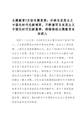 主题教育7月份专题党课:开辟马克思主义中国化时代化新境界不断谱写马克思主义中国化时代化新篇章持续推动主题教育走向深入.docx