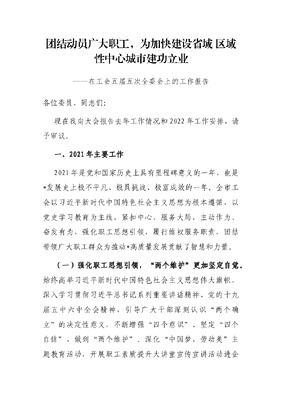 团结动员广大职工,为加快建设省域 区域性中心城市建功立业——在工会五届五次全委会上的工作报告.docx
