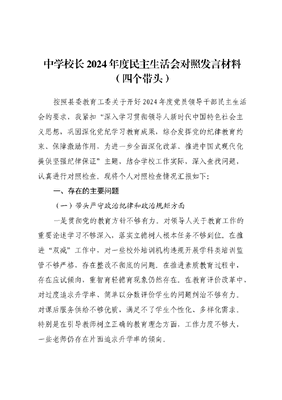中学校长2024年度民主生活会对照发言材料(四个带头).docx