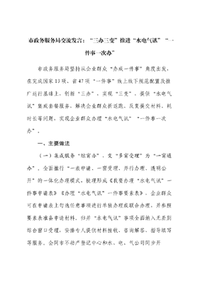 市政务服务局交流发言:“三办三变”推进“水电气讯”“一件事一次办”.docx
