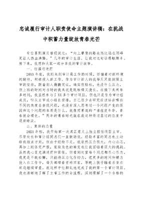 忠诚履行审计人职责使命主题演讲稿:在挑战中积蓄力量绽放青春光芒.docx
