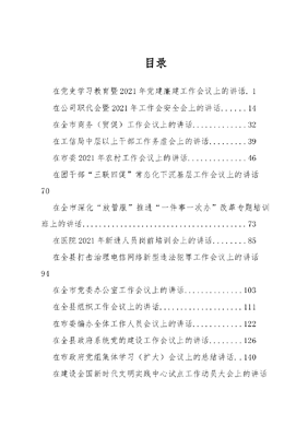 目录在党史学习教育暨2021年党建廉建工作会议上的讲话.1在公司职代会暨2021年工作会安全会上的讲话14在全市商务(贸促)工作会议上的讲话.32在工信局中层以上干部工作务虚会上的讲话39在市委2021年农村工作会议上的讲话..46在团干部三联四促常态化下沉基层工作会议上的讲话70在全市深化放管服推进一件事一次办改革专题培训班上的讲话73在医院2021年新进人员岗前培训会上的讲话..85在全县打击治理电信网络新型违法犯罪工作会议上的讲话94在全市党委办公室工作会议上的讲话..103在全县组织工作会议上的讲话..111在市委编办全体工作人员会议上的讲话122在全县政府系统党的建设工作会议上的讲话..126在市政府党组集体学习(扩大)会议上的总结讲话..140在建设全国新时代文明实践中心试点工作动员大会上的讲话142在县委全会暨县委经济工作会议闭幕式上的讲话.157市委宣传部部长在机关支部专题组织生活会上的讲话163在全市村(社区)党组织书记专题培训班上的讲话..168在全县民政工作会议上的讲话..178在区生活垃圾分类工作推进会议上的讲话.187在全区民政工作大会上的讲话..192在政府系统办公室主任会议上的讲话..200在全县奋进争先、勇创新局大会上的讲话210在机关党建工作推进会议上的讲话.228在党史学习教育暨2021年党建廉建工作会议上的讲话同志们:过去的一年,XXXX在水利部党组和XX省XX坚强有力的领导下,坚持以习近平新时代中国特色社会主义思想为指导,坚决有力应对新冠疫情,科学有序防御流域洪水,凝心聚力推进改革发展,XX事业和XXXX改革发展写下了浓墨重彩的篇章。这一切成果的取得,根本得益于党的坚强领导,得益于全XX各级党组织和全体党员作用的充分发挥,得益于广大干部职工的奋力拼搏,得益于政治建XX的正确引领,为XX兴XX高质量发展提供了坚强保障。2021年是一个具有里程碑意义的时间节点,两个大局在此交织,两个百年在此交汇,两个五年在此交接,中国共产党迎来百年华诞,党史学习教育正当其时,抓好党的建设任务艰巨,意义重大。今天XXXX党史学习教育暨2021年党建廉建工作会议内容很丰富,XXX同志作了工作报告,对今年我XX党建和党风廉政建设重点工作任务作了详细工作部署,XXX同志对全XX纪检工作提出了明确工作要求,我都赞同,请全XX各级党组织认真贯彻落实。下面,我就开展好党史学习教育,确保今年党建廉建工作取得扎实成效,讲四点意见,供大家参考。一、扎实开展党史学习教育在全党开展党史学习教育,是党中央立足党的百年历史新起点、统筹中华民族伟大复兴战略全局和世界百年未有之大变局、为动员全党全国满怀信心投身全面建设社会主义现代化国家而作出的重大决策。X月XX日,习近平总书记在党史学习教育动员大会上发表重要讲话,为我们开展好党史学习教育指明了方向。在X月X日水利部党组召开党史学习教育动员部署暨2021年党的工作会议之后,XX党组对有关工作进行了具体安排,开展党史学习教育的实施方案已于会前下发。我们要深入学习领会中央和水利部党组、XX省XX有关会议精神,以饱满的政治热情把党史学习教育抓实抓好。一要深刻认识重大意义。习近平总书记将党史学习教育的意义归纳为三个必然要求:一是牢记初心使命、推进中华民族伟大复兴历史伟业的必然要求,二是坚定信仰信念、在新时代坚持和发展中国特色社会主义的必然要求,三是推进党的自我革命、永葆党的生机活力的必然要求。我体会,可以从三个方面去理解:第一,人民性。这次党史学习教育,是党的十八大以来第X次党内集中教育,在不忘初心、牢记使命主题教育之后接续开展,是对共产党人初心使命的再感悟、再强化。按照党中央的要求,要同步开展我为群众办实事实践活动,这就意味着我们学党史,出发点就是为人民谋幸福,这个导向一定不能偏。第二,历史性。这次针对党史的学习教育,不是讲几个故事,听一段见闻那么简单,我们要把握住历史的特点、特性,从中坚定意志、汲取智慧、获得启迪,从而推动各项工作高质量发展。第三,政治性。欲知大道,必先为史,从百年党史中深刻认识中国共产党先进的政治属性、崇高的政治理想、高尚的政治追求,才能透彻理解我们党之所以成为历史选择、人民选择的政治逻辑,从而更加坚定理想