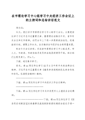 在市理论学习中心组学习中央经济工作会议上的主持词和总结讲话范文同志们:今天,我们召开市委理论学习中心组学习会议,主要是传达学习习近平总书记重要文章、重要理论读物及中央、省市有关会议和文件精神,动员全市上下进一步提高政治站位、把准前进方向、凝聚工作合力,奋力推动全市经济社会高质量发展。参加今天会议的有:在家的市委理论学习中心组成员、市人大、市政府、市政协班子成员和其他县级领导干部,部分部门主要负责人,约x人。下面,进行集中学习。首先,请xx同志传达学习12月6日中共中央政治局会议精神、习近平总书记重要文章《继承和发扬党的优良革命传统和作风,弘扬延安精神》精神;………………………………下面,请xx同志传达学习中央经济工作会议精神;………………………………下面,请xx同志传达学习中共中央党外人士座谈会会议精神;………………………………下面,请xx同志传达学习《国务院应对新型冠状病毒肺炎疫情联防联控机制综合组关于进一步优化落实新冠肺炎疫情防控措施的通知》;………………………………同志们,刚才我们传达学习了习近平总书记重要文章、重要理论读物及中央、省市有关会议和文件精神,希望大家认真学习领会,切实抓好贯彻落实。下面,我结合学习情况,再强调四个方面:一、准确研判当前经济形势,科学系统谋划推进明年经济工作近期,中央先后召开政治局会议、党外人士座谈会、经济工作会议,安排部署2023年经济工作。特别是在12月15日至16日召开的中央经济工作会议上,习近平总书记深刻阐述了做好经济工作的一系列重大理论和实践问题,明确提出了明年工作的总体要求、政策取向和重点任务,讲话总揽全局、胸怀天下,思想深邃、内涵丰富,充分体现了以习近平同志为核心的党中央对国内国际经济形势的深刻洞察和科学把握,充分体现了党中央在复杂多变局面下驾驭经济工作的高超智慧和能力,对于指导我们统一思想、凝聚共识、真抓实干,全力抓好明年经济工作,推动经济社会高质量发展,具有重要而深远的意义。一要认真学习,深刻领会。坚持把学习贯彻习近平总书记在中央政治局会议、党外人士座谈会和中央经济工作会议上的重要讲话精神与学习贯彻党的二十大精神结合起来,深刻领会党中央领导经济工作取得的重大成就,准确把握中央关于经济形势的判断,全面落实中央关于明年经济工作的重点任务,坚持系统观念、守正创新,坚持稳字当头、稳中求进,进一步优化完善我市明年经济发展目标任务,努力把中央和省市各项决策部署转化为做好明年工作的思路举措和具体行动,奋力推动全市经济实现质的有效提升和量的合理增长。二要把握大势,精心谋划。深刻认识和把握六个坚持的重要经验、五大政策的集成优势、六个更好统筹的系统方针和五个方面的重点工作,认真研究我市明年经济发展面临的机遇和挑战,抢抓后疫情时代经济社会发展机遇,紧扣xx发展思路,科学谋划目标任务、重要工作、重大举措、重点项目,着力锻长板、补短板、强弱项,努力实现明年经济发展主要预期目标。三要解放思想,大抓项目。坚决破除思维定势、工作惯性和路径依赖,抢抓国省各类利好政策机遇,围绕民生改善、生态环保、基层治理等领域,主动对接、积极争取,在前期谋划的基础上,再进行一轮过堂式研究、精准式修改、渐进式完善,紧盯时间节点,倒排工期、挂图作战,做实做好项目前期、要素保障等工作,确保项目成型即落地、落地即开工。四要担当实干,狠抓落实。2023年,是全面贯彻落实党的二十大精神的开局之年,是实施十四五规划承上启下的关键之年。做好明年经济工作责任重大、意义深远。全市各级各部门要坚持把推动发展作为第一要务,善于担当、主动作为,紧盯预定目标,精准攻坚、真抓实干,确保明年各项工作起好步、开好局。同时,要统筹抓好重点指标攻坚、安全稳定、疫情防控、保供稳价、年终考核、困难群众关爱等工作,全力打好年底收官战。二、因时因势优化防控措施,更好统筹疫情防控和经济社会发展近三年来,在以习近平同志为核心的党中央坚强领导下,我们不断优化完善疫情防控措施,顶住了一轮又一轮疫情的冲击,以防控战略的稳定性、防控措施的灵活性有效应对了疫情形势的不确定性,统筹疫情防控和经济社会发展取得重大积极成果。当前,疫情防控已进入新阶段,全市各级各部门要准确把握和执行中央、省市各项优化防控措施,坚持第九版、落实二十条、执行新十条,更好统筹疫情防控和经济社会发展,确保疫情防控平稳转段、社会秩序持续稳定、经济发展全面提速。一要加快提升治的能力,统筹各方力量、想尽一切办法,做好发热药品、救治床位、抗原试剂、口罩等物资的储备供应,加强定点医院、亚定点医院改造升级,保障好群众医疗服务和基本购药需求;要进一步摸清特殊人群底数,建立健康档案,实施分级健康管理,精准高效防治感染;要按照应设尽设、应开尽开、24小时开诊的要求,加快发热门诊扩容,统筹