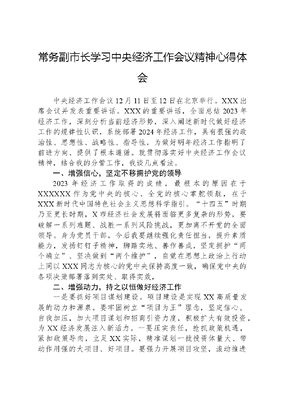 常务副市长学习中央经济工作会议精神心得体会中央经济工作会议12月11日至12日在北京举行。XXX出席会议并发表重要讲话。XXX的重要讲话,全面总结2023年经济工作,深刻分析当前经济形势,深入阐述新时代做好经济工作的规律性认识,系统部署2024年经济工作,具有很强的政治性、思想性、战略性、指导性,为做好明年经济工作指明了前进方向、提供了根本遵循。就贯彻落实好中央经济工作会议精神,结合我的分管工作,我谈几点看法。一、增强信心,坚定不移拥护党的领导2023年经济工作取得的成绩,最根本的原因在于XXXXXX作为党中央的核心、全党的核心掌舵领航,在于XXX新时代中国特色社会主义思想科学指引。十四五时期乃至更长时期,X市经济社会发展将面临更多复杂的形势,要破解一系列难题、战胜一系列风险挑战,更加离不开党的全面领导。身为党员干部,今后我要继续强化责任担当,提升素质能力,发扬钉钉子精神,脚踏实地、善作善成,坚定拥护两个确立、坚决做到两个维护,自觉在思想上政治上行动上同以XXX同志为核心的党中央保持高度一致,确保党中央的各项决策部署落到实处、取得实效,二、增强动力,持之以恒做好经济工作一是要抓好项目谋划建设。项目建设是实现XX高质量发展的动力和源泉。要牢固树立项目为王理念,坚定信心、自我加压,加大项目谋划和招商引资力度,积极扩大有效投资,为XX经济发展注入新活力。一要压实责任,抢抓政策机遇,紧扣政策导向,立足XX实际,精准谋划一批投资体量大、带动作用强的大项目、好项目。要强力开展项目攻坚,滚动推进三个一批,加快形成更多有效投资、有形进度。二要紧盯纳入台账的省、市重点建设项目,创新举措、明确重点、压实责任,坚持一事一议、特事特办,协调解决项目推进中土地、环保、资金、环境等问题,全力做好保障服务和协调推进工作。三要利用国家、省抢抓项目建设的重大机遇,抓紧对接进入国家、省盘子或规划的项目,争取早日开工见效。四要抓好投资纳统工作,发改委要加强与工信交通、住建等部门以及各开发区、镇(街道)对接联系,做好指导项目入库、规上和限上企业入库工作,坚持实事求是原则,做到应统尽统、颗粒归仓。二是要加快产业转型升级。一要加快传统产业结构调整。以先进制造业高质量发展为主攻方向,持续深化三大改造,推动传统产业向绿色化、智能化转型,持续提升传统产业发展能级,锻长长板,做强优势产业。二要强化延链补链强链。加快推进氢能利用示范产业园、汽车用材产业园等项目建设,布局、引进、培育有色金属新材料、电子及储能等未来产业。三是扩大开放招商。深入一线招商,积极引进大型跨境电商龙头企业入驻跨境电子商务产业园,落实扶持政策,推动条件成熟的跨境电商企业积极建设或租用海外仓。进一步扩大外资准入领域,持续加大财政支持力度。三要激发市场主体活力。一要加快推动营商环境提档升级清单化落实一件事一次办有诉即办交房即交证和惠企政策免申即享、审批事项免证可办等5件事,继续发挥好办不成事窗口作用。对标六最目标,着力提升各类软硬件建设水平。二要加大万人助万企工作力度。加大实体经济支持力度,落实企业帮扶各项政策机制,解决好企业面临的深层次突出问题和瓶颈制约,加大问题化解力度,提高企业满意率,切实帮助企业纾困解难。三是持续推动市场主体提质扩量。以四个倍增为抓手,坚决打赢转企升规月新增攻坚任务。三、增强定力,守牢安全发展底线安全生产事关人民福祉、经济发展和社会大局稳定。临近岁末,天气寒冷,用电用暖需求增加,企业生产任务紧张,这些都是我们目前安全领域的不稳定因素。尤其是前段时间的山西吕梁大火事件再度为我们敲响了筑牢安全生产防线的警钟,因此要慎终如始,增强定力,做好安全生产工作。一要牢固树立安全发展理念,紧绷安全之弦,严格落实企业主体责任,建立健全各项安全生产制度,强化检查、夯实责任,筑牢危化品安全生产防线。二要严格落实行业部门监管责任、属地管理责任,扣紧明责、履责、督责和问责的责任链条,全力防范化解重大安全风险,确保安全生产形势稳定。三要扎实开展安全隐患大排查。聚焦产生事故的领域、点位,组织专业人手开展隐患大排查、大治理,强化安全事故应急演练,加强消防宣传教育,确保将事故消除在根源。