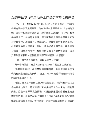 纪委书记学习中央经济工作会议精神心得体会中央经济工作会议12月11日至12日在北京举行,XXXXXX出席会议并发表重要讲话,他在讲话中全面总结2023年经济工作,深刻分析当前经济形势,系统部署2024年经济工作。作为经济开发区,经济的主战场,开发区各级党员干部更要认真学习会议精神,凝心聚力、坚定信心,全面做好明年经济工作,扎实推进中国式现代化,同时,作为纪检监察干部,要全面学习领会、自觉贯彻落实,始终保持奋发有为的精神状态,以有力有效监督护航X这艘经济轮船乘风破浪、持续前行!下面,我从两个方面谈一些自己的学习体会:第一个方面是,充分认识和总结2023年的经济工作经验。总体回升向好,高质量发展扎实推进,全面建设社会主义现代化国家迈出坚实步伐。会上,习XXX是这样回顾即将收官的2023年经济工作。对做好经济工作重要经验及时进行总结,不断深化对经济工作的规律性认识,是新时代以来中央经济工作会议的一项重要内容。回首一年不平凡的历程,中国经济既面对外部环境动荡不安的因素,也承受内部三重压力(2022年会议提出的经济恢复的基础尚不牢固,需求收缩,供给冲击预期转弱)加大的困难。但我们坚持稳字当头、稳中求进,顶住了压力、克服了困难。前三季度,国内生产总值同比增长5.2%,前11个月,全国居民消费价格指数同比上涨0.3%,消费对经济增长的贡献上升,在国内大循环中的主体作用增强,国际收支基本平衡。纵向看,我国今年经济社会发展主要指标比去年都有明显改善;横向看,我国经济增长在世界主要经济体中居于前列,仍是全球经济增长最大引擎。在以XXX同志为核心的党中央坚强领导下,在XXX经济思想科学指引下,全党全国各族人民团结拼搏、迎难而上,我国经济社会发展成绩得来极为不易,必须倍加珍惜。对经济工作的深刻总结,会议进一步深化了新时代做好经济工作的规律性认识,令人瞩目地提出五个必须:必须把坚持高质量发展作为新时代的硬道理,牢牢把握高质量发展这个首要任务,是当前和今后一个时期确定发展思路、制定经济政策、推进经济工作的根本遵循;必须坚持深化供给侧结构性改革和着力扩大有效需求协同发力,着眼于构建新发展格局,使国内大循环建立在内需主动力的基础上,提升国际循环质量和水平;必须坚持依靠改革开放增强发展内生动力,统筹推进深层次改革和高水平开放,不断解放和发展社会生产力、激发和增强社会活力;必须坚持高质量发展和高水平安全良性互动,既要增强忧患意识、居安思危,也要努力实现二者的动态平衡;必须把推进中国式现代化作为最大的政治,以最大的政治为统领,强调聚焦以经济建设为中心、推动高质量发展,是中国式现代化的题中之义。这五个必须,进一步丰富和发展了XXX经济思想,为以中国式现代化全面推进强国建设、民族复兴伟业指明了前进方向。而就做好2024年经济工作,会议提出了要坚持稳中求进、以进促稳、先立后破的12个字工作要求,突出了对稳与进、立和破辩证关系的深刻把握,体现了巩固和增强经济回升向好态势,持续推动经济实现质的有效提升和量的合理增长的深切考量。我们牢牢把握高质量发展这一首要任务,坚持稳是大局和基础进是方向和动力的思想,坚持要先立后破,而不能未立先破的指引,坚定不移推进高质量发展,加快构建新发展格局,把党中央的战略意图贯彻到位。第二个方面是,作为纪检监察机关,如何围绕四个抓落实扎实做好精准监督。习XXX在讲话中强调,要坚持和加强党的全面领导,深入贯彻落实党中央关于经济工作的决策部署,并围绕抓落实提出了要不折不扣抓落实要雷厉风行抓落实要求真务实抓落实要敢作善为抓落实四个方面的行动指南。四个抓落实掷地有声,具有很强的思想性、针对性和指导性。一分部署,九分落实。抓落实历来都是习XXX提出的工作要求,它是领导工作中一个极为重要的环节,是党的政治路线、思想路线、群众路线的根本要求,也是衡量党员干部世界观正确与否和党性强不强的一个重要标志。聚焦中央经济工作会议部署的2024年经济工作既定目标,聚焦监督主责主业,纪检监察机关最根本的就是要抓落实,扎实做好精准监督。不折不扣抓落实,聚焦准字。抓落实不讲条件、不打折扣、不搞变通。这是党员干部执行党中央和习XXX决策部署的基本要求。党中央对经济工作的重大决策部署,需要广大党员干部心领神会,完整、准确、全面抓落实。作为纪检监察机关,要立足岗位实际,聚焦重点领域和关键岗位,充分发挥好监督职能作用,精准推进各单位各部门因地、因时、因事制宜,全面深入贯彻落实党中央的重大决策部署,不打折扣、不搞变通,创造出得到群众认可、经得起实践和历史检验的实绩。今年1至11月,围绕贯彻落实党中央重大决策部署和省、市委、开发区党工委工作要求,开展