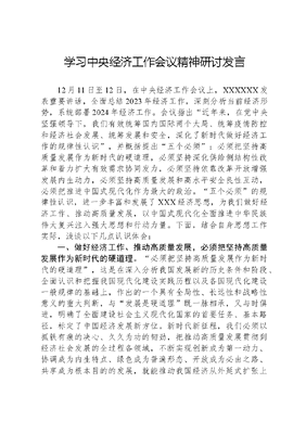 学习中央经济工作会议精神研讨发言12月11日至12日,在中央经济工作会议上,XXXXXX发表重要讲话,全面总结2023年经济工作,深刻分析当前经济形势,系统部署2024年经济工作。会议指出近年来,在党中央坚强领导下,我们有效统筹国内国际两个大局、统筹疫情防控和经济社会发展、统筹发展和安全,深化了新时代做好经济工作的规律性认识,并概括提出五个必须:必须把坚持高质量发展作为新时代的硬道理,必须坚持深化供给侧结构性改革和着力扩大有效需求协同发力,必须坚持依靠改革开放增强发展内生动力,必须坚持高质量发展和高水平安全良性互动,必须把推进中国式现代化作为最大的政治。五个必须的规律性认识,进一步丰富和发展了XXX经济思想,为我们做好经济工作、推动高质量发展,以中国式现代化全面推进中华民族伟大复兴注入强大思想和行动力量。下面,结合自身思想工作实际,浅谈以下几点认识体会:一、做好经济工作、推动高质量发展,必须把坚持高质量发展作为新时代的硬道理。必须把坚持高质量发展作为新时代的硬道理,这是在深入分析我国发展新的历史条件和阶段、全面认识和把握我国现代化建设实践历程以及各国现代化建设一般规律的基础上,作出的一个具有全局性、长远性和战略性意义的重大判断,与发展是硬道理既一脉相承,又与时俱进,明确了全面建设社会主义现代化国家的首要任务、基本路径,标定了中国经济发展新方位。新时代新征程,我们必须以抓铁有痕的决心、久久为功的韧劲,把推动高质量发展贯彻到经济社会发展的全过程各领域,不断实现创新成为第一动力、协调成为内生特点、绿色成为普遍形态、开放成为必由之路、共享成为根本目的的发展,就能推动我国经济从外延式扩张上升为内涵式发展,牢牢掌握发展的主动权。二、做好经济工作、推动高质量发展,必须坚持深化供给侧结构性改革和着力扩大有效需求协同发力。坚持深化供给侧结构性改革和着力扩大有效需求协同发力,发挥超大规模市场和强大生产能力的优势,不仅是实现高质量发展、构建新发展格局、全面建成社会主义现代化强国的必然之举,也是应对外部冲击,破解发展难题,巩固和增强经济回升向好态势,增强我国生存力、竞争力、发展力、持续力的有效手段。这要求我们坚持系统观念,在政策实施上强化协同联动、放大组合效应,找准深化供给侧结构性改革和着力扩大有效需求协同发力的有机结合点,释放两者协同发力的巨大潜力,形成需求牵引供给、供给创造需求的更高水平动态平衡,实现国民经济良性循环。三、做好经济工作、推动高质量发展,必须坚持依靠改革开放增强发展内生动力。坚持依靠改革开放增强发展内生动力,统筹推进深层次改革和高水平开放,不断解放和发展社会生产力、激发和增强社会活力,才能为推动高质量发展、加快中国式现代化建设持续注入强大动力。这要求我们,一方面从制约高质量发展的突出问题和关键环节入手,谋划进一步全面深化改革重大举措,行改革之道、革烦苛之弊、开创新之门,不断增强社会主义现代化建设的动力和活力。另一方面,坚持推进高水平对外开放,稳步扩大规则、规制、管理、标准等制度型开放,建设更高水平开放型经济新体制,将为中国打开更大发展空间,不断以中国新发展为世界提供新机遇。四、做好经济工作、推动高质量发展,必须坚持高质量发展和高水平安全良性互动。只有坚持高质量发展,推动经济实现质的有效提升和量的合理增长,才能为高水平安全提供坚实的物质基础;只有在发展中更多考虑安全因素,才能营造有利于经济社会发展的安全环境,牢牢把握发展主动权。XXXXXX指出:要贯彻总体国家安全观,坚持底线思维,统筹好发展和安全,盯住关系国家和区域安全的科技、产业、金融等领域和重大基础设施,加强风险防控体系和能力建设,夯实安全发展的基础。新征程上,坚持统筹发展和安全,强化底线思维,注重补短板、堵漏洞、强弱项,下好先手棋、打好主动仗,以高质量发展提升维护高水平安全的能力,以高水平安全为实现高质量发展保驾护航,中国号巨轮必能越激流、过险滩,驶向更加壮阔的前程。五、做好经济工作、推动高质量发展,必须把推进中国式现代化作为最大的政治。全面建设社会主义现代化国家、全面推进中华民族伟大复兴,是新时代新征程中国共产党的使命任务。实现这个奋斗目标、完成这个使命任务的途径,就是中国式现代化。中国式现代化是亿万人民自己的事业,人民是中国式现代化的主体。我们要在党的统一领导下,紧紧依靠人民,尊重人民创造精神,汇集全体人民的智慧和力量,聚焦经济建设这一中心工作和高质量发展这一首要任务,坚定信心、开拓奋进,主动作为、真抓实干,我们必将把中国式现代化宏伟蓝图一步步变成美好现实,共同铸就强国建设、民族复兴伟业的新辉煌。