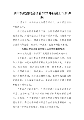 从中央政治局会议看2025年经济工作新动向12月9日,中共中央政治局召开会议,分析研究2025年经济工作。会议总结分析今年经济工作,全面客观研判当前经济发展形势,对明年经济工作作出一系列部署,必将进一步坚定各方发展信心,积极主动应对困难挑战,巩固增强经济回升向好态势,为实现十五五良好开局打牢基础。一、今年经济社会发展主要目标任务将顺利完成2024年是实现十四五规划目标任务的关键一年。今年以来,面对更加错综复杂的国际国内环境,以领导人为核心的党中央团结带领全党全国各族人民,沉着应变、综合施策,经济运行总体平稳、稳中有进。会议认为,我国经济实力、科技实力、综合国力持续增强。新质生产力稳步发展,改革开放持续深化,重点领域风险化解有序有效,民生保障扎实有力,全年经济社会发展主要目标任务将顺利完成。复杂严峻的形势下,今年的经济社会发展成绩来之不易,充分印证了党中央对形势判断和决策部署的正确性、预见性。中国宏观经济研究院经济研究所副所长郭丽岩表示,会议对今年经济形势作出的系列重要判断,有助于进一步坚定发展信心,更好稳定发展预期。当前,我国发展面临许多不确定性和挑战。做好明年经济工作,必须坚定必胜信心。进一步全面深化改革扩大高水平对外开放实施更加积极有为的宏观政策扩大国内需求稳住楼市股市……针对明年经济工作,中央政治局会议作出一系列重要部署。会议作出的系列工作部
