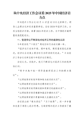 从中央经济工作会议看2025年中国经济着力点中央经济工作会议12月11日至12日在北京举行。领导人出席会议并发表重要讲话,总结2024年经济工作,分析当前经济形势,部署2025年经济工作,为中国经济高质量发展把舵定向。一、坚定信心不断深化对经济工作的规律性认识今年是实现十四五规划目标任务的关键一年。经济运行总体平稳、稳中有进,高质量发展扎实推进,经济社会发展主要目标任务即将顺利完成。中央经济工作会议这样总结今年经济运行情况。会议认为,实践中,我们不断深化对经济工作的规律性认识:党中央集中统一领导是做好经济工作的根本保证;必须统筹好有效市场和有为政府的关系;必须统筹好总供给和总需求的关系;必须统筹好培育新动能和更新旧动能的关系;必须统筹好做优增量和盘活存量的关系;必须统筹好提升质量和做大总量的关系。会议提出的根本保证五个统筹,进一步丰富和发展了领导人经济思想,为做好明年经济工作提供了根本遵循。这些规律性认识,既是应对当前困难挑战、巩固经济回升向好态势的重要着力点,也是促进经济结构转型升级、推动高质量发展的科学方法论。国家发展改革委经济研究所副所长郭丽岩说。南方科技大学副校长金李认为:深化对经济工作的规律性认识,科学分析当前经济形势,有助于我们采取更加有效举措,有力破解发展难题,稳定发展预期,提振社会信心,充分调动各方面积极性,凝聚推动高质