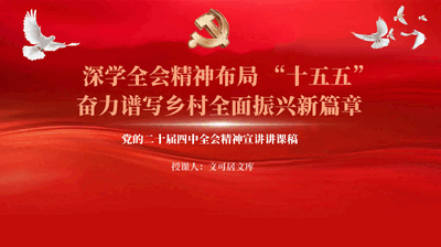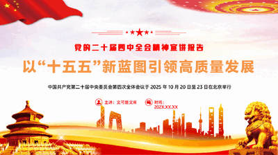 以十五五新蓝图引领高质量发展主讲:文可居文库时间:202X.XX.XX党的二十届四中全会精神宣讲报告中国共产党第二十届中央委员会第四次全体会议于2025年10月20日至23日在北京举行前 言/PREFACE二十届四中全会中国共产党坚持以习近平新时代中国特色社会主义思想为指导,深入学习贯彻党的二十届四中全会精神,全面把握《中共中央关于制定国民经济和社会发展第十五个五年规划的建议》核心要义,结合XX市实际,研究部署贯彻落实举措,动员全市广大党员干部群众,把思想和行动统一到党中央决策部署上来,为谱写中国式现代化XX实践新篇章凝聚强大力量。党的二十届四中全会是在中华人民共和国成立XX周年、实现十四五规划目标任务的关键之年召开的一次重要会议。全会审议通过的《建议》,系统擘画了十五五时期经济社会发展的指导思想、主要目标、重点任务和战略举措,明确了到2035年基本实现社会主义现代化的宏伟蓝图。二十届四中全会中国共产党前 言/PREFACE二十届四中全会中国共产党学习宣传贯彻全会精神,是当前和今后一个时期的重大政治任务。全市各级党组织和广大党员干部必须从政治和全局的高度,深刻认识全会的重大意义,准确把握精神实质,切实把学习成果转化为推动发展的实际行动,确保党中央决策部署在XX落地生根、开花结果。二十届四中全会中国共产党目录——深刻认识全会召开的重大意义与时代价值一、立于全局看大势:把握