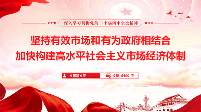 文可居文库文稿 6400 字坚持有效市场和有为政府相结合加快构建高水平社会主义市场经济体制前言在以中国式现代化全面推进中华民族伟大复兴的新征程上,正确处理政府与市场的关系是决定改革成败、影响发展质量的核心命题。从改革开放初期计划经济为主、市场调节为辅的探索,到新时代充分发挥市场在资源配置中的决定性作用,更好发挥政府作用的论断,我们党对这一关系的把握始终与实践同步、与时代同频。前言党的二十届四中全会将坚持有效市场和有为政府相结合确立为十五五时期经济社会发展的重要原则,这不仅是对社会主义市场经济体制改革规律的深刻总结,更是马克思主义政治经济学中国化时代化的最新成果,为新征程上破解发展难题、激发内生动力、实现2035年远景目标提供了根本遵循。只有让政府放得活、管得好,以有为的治理保障市场在资源配置中发挥决定性作用,才能真正释放改革红利,推动高质量发展。前言01准确把握有效市场和有为政府的内涵及关系02深刻理解坚持有效市场和有为政府相结合的重大意义03 推动有效市场和有为政府同频共振04锚定有效市场和有为政府相结合目标,服务中国式现代化第一部分准确把握有效市场和有为政府的内涵及关系01PARTONE一、准确把握有效市场和有为政府的内涵及关系中国共产党对政府与市场关系的探索,是伴随实践不断深化、历经波