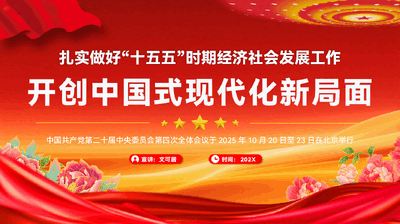 未来五年怎么干?汇报人:通用名党的二十届四中全会擘画发展蓝图2025年10月23日,为期四天的二十届四中全会在北京闭幕。这次全会最重要的一项成果,是审议通过了《中共中央关于制定国民经济和社会发展第十五个五年规划的建议》。从当天发布的全会公报中,可以看到党中央对十五五时期我国经济社会发展作出的战略部署。未来五年要怎么干?前言0203关键时期的宏伟目标举旗定向的鲜明指引01二十届四中全会概况目录04系统全面的发展蓝图二十届四中全会概况第一部分候补委员中国共产党第二十届中央委员会第四次全体会议召开时间:2025年10月20日至23日北京·人民大会堂会期:4天10月20日10月21日10月22日10月23日 开会时间 闭会时间参加会议情况中央委员168人147人全会由中央政治局主持。中央委员会总书记XXX作了重要讲话。中央纪律检查委员会常务委员会委员和有关方面负责同志列席会议。党的二十大代表中部分基层同志和专家学者也列席了会议。10月October23二十届四中全会概况二十届四中全会概况审议文件《中共中央关于制定国民经济和社会发展第十五个五年规划的建议》全会号召全党全军全国各族人民要更加紧密地团结在以XXX同志为核心的党中央周围,为基本实现社会主义现代化而共同奋斗,不断开创以中国式现代化全面推进强国建设、民族复兴伟业新局面;关键时期的宏伟目标第二部分关键时期的宏伟目标听取和讨论XXX总