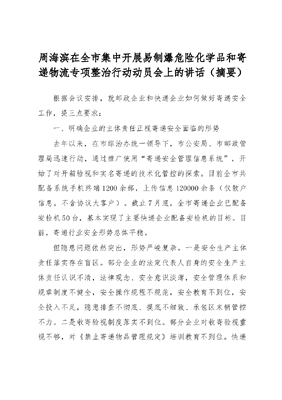 周海滨在全市集中开展易制爆危险化学品和寄递物流专项整治行动动员会上的讲话(摘要)根据会议安排,就邮政企业和快递企业如何做好寄递安全工作,提三点要求:一、明确企业的主体责任正视寄递安全面临的形势去年以来,在市综治办统一领导下,市公安局、市邮政管理局迅速行动,通过推广使用寄递安全管理信息系统,开始了对开箱验视和实名寄递的技术化管控的探索。目前全市共配备系统手机终端1200余部,上传信息120000余条(仅散户信息,不含协议大客户)。截止7月底,全市寄递企业已配备安检机50台,基本实现了主要快递企业配备安检机的目标。目前,寄递行业安全形势总体平稳。但隐患问题依然突出,形势严峻复杂。一是安全生产主体责任落实存在盲区。部分企业的法定代表人自身的安全生产主体责任认识不清,法律观念、安全意识淡薄,安全管理体系和规章制度不健全,安全操作规程不规范,安全教育不到位,安全投入不足,隐患排查不彻底、摸底不细致、承包区末梢管控不力。二是收寄验视制度落实不到位。部分企业对收寄验视重视不够,对《禁止寄递物品管理规定》培训教育不到位。快递员对用户交寄的物品查验不细,甚至流于形式,导致危险化学品等违禁品流入寄递渠道。三是实名收寄制度落实不到位。个别企业总部实名收寄信息系统建设缓慢,实名信息采集操作未进入生产作业流程。个别加盟企业仍持有观望态度,抱有侥幸心理;有的基层营业网点还不能熟练掌握实名收寄信息系统使用。四是安检机配备使用不符合规范。部分企业片面强调客观原因,一味观望等靠,安全投入严重不足。部分企业安检机配而不用,安检机配置使用流于形式。五是安全应急处置能力不足。部分企业安全应急预案照搬照抄、脱离了企业实际,安全应急队伍流于形式,安全应急演练敷衍了事、走过场,安全培训制度、档案不健全,安全理念和安全操作知识难以真正落实到一线快递员和营业员的身上。二、全面落实三项制度和市县公安、综治等相关部门对寄递安全工作的要求根据这次会议和赵市长的要求,下半年是专项整治行动的实施阶段,是全市寄递行业三项制度落实最关键、最艰难、最具决定性的时期,希望各寄递企业要有清醒的认识,要将危爆物品寄递管控作为寄递安全不可逾越的红线、不可触碰的底线,深入组织开展寄递渠道涉恐隐患排查整治。寄递企业要切实履行安全主体责任,严格执行相关规定,严禁收寄危险化学品等禁寄物品。要加强源头管控,严防危险化学品等流入寄递渠道。市邮政管理局将按照会议部署,以坚决遏制重特大事故为重点,坚持全面检查与严格执法相结合、企业自查与政府督查相结合,对企业安全生产管理责任落实、安全管理制度建立和执行、安全风险管控、应急管理等情况集中开展大检查,对违法违规行为坚持零容忍态度,始终保持高压态势。在收寄验视方面,突出教育培训和验视流程。市邮政管理局将与公安机关开展多种形式的安全教育和培训工作。一是强化《快递安全生产操作规范》培训。主要内容是从揽收到投递各环节的基本要求,从业人员必须认真学习,熟练掌握。二是开展各类寄递安全的宣传教育活动。对所有寄递从业人员开展教育,确保熟知熟记,能够对常见的各类禁寄物品进行检查、鉴别。三是开展入职从业人员安全培训工作。考虑到寄递行业从业人员的工作特点,市邮政管理局联合市公安局等相关部门及时开展新录用人员安全培训。在实名收寄方面,严抓实名寄递系统使用。按照中综办、公安部、国家邮政局《关于加快全国邮件快件实名收寄信息系统推广应用工作的实施方案要求》和这次会议要求,全市寄递企业要严格使用国家邮政局发布的安易递实名收寄系统或者我市公安部门开发的寄递宝,以实现实名收寄的信息化采集工作。从省局反馈的情况来看,我市实名率达42.85%,基本符合上级要求。但从深层次分析,实名率提升的原因主要是企业系统做到了协议大客户的批量上传,但散单客户并未做到真正100%实名录入。从以往寄递安全事故来看,散单客户才是真正的危险源。今后,我局将会同市公安部门对所有寄递企业和从业人员使用实名收寄系统的情况特别是散单客户的录入开展专项督导,定期通报,对实名收寄制度落实不力的企业和个人依法予以行政处罚。此外,对于冒充协议客户发件的个人,各寄递企业要坚决阻止。在过机安检方面,严格落实应检必检的要求。当前,我市主要品牌企业已基本上解决了安检设备有没有的问题。下半年,将重点解决怎么用、怎么管的问题。各企业要按照《邮件快件微剂量X射线安全检查设备配置管理办法(试行)》的要求,建立安检设备操作使用办法,建立定人、定机、定岗、定责制度,做到谁收寄、谁安检、谁负责。对于如何操作安检设备,前期我们已与滨州学院机场学院达成初步共识,将对全市所有寄递企业安检设备操作员进行统一培训。同时,我们将继续督导全市各企业及时配备安检机,在9月底前尚未配备的企业,市邮政管理局将会同公安机关依法处理。三、严格执法认