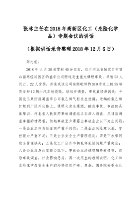 张林主任在2018年高新区化工(危险化学品)专题会议的讲话(根据讲话录音整理2018年12月6日)同志们:2018年11月28日零时40分左右,位于河北省张家口市望山循环经济园区的盛华公司附近发生重大爆燃事故,导致23人死亡、22人受伤,并造成该公司南侧毗邻的310省道上的38辆货车和12辆小汽车被烧毁。经初步调查,事故直接原因是:中国化工集团所属盛华公司氯乙烯气柜发生泄漏,泄漏的氯乙烯扩散到厂区外公路上,遇明火发生爆燃,酿成事故。事故的具体原因,河北省人民政府事故调查组正在深入调查,从目前调查掌握的情况看,该起事故至少暴露出事故企业以下突出问题:一是企业主体责任落实严重不到位;二是企业风险意识差,管控能力严重不足;三是企业安全生产管理混乱;四是下水管网安全管理缺失;五是化工厂区外车辆乱停乱放问题严重突出;六是企业应急处置能力低下。事故企业涉嫌隐瞒事故情节,误导事故调查,社会影响恶劣,再一次用血的教训表明:化工和危险化学品安全生产的形势依然严峻、复杂。国务院安委会已对该起事故的调查处理实施挂牌督办。为深刻吸取事故教训,举一反三,深入贯彻落实全国、全省、全市危化品安全生产专题视频会议精神,坚决遏制重特大生产安全事故发生,结合钒钛高新区工作实际,我强调三点意见:一、切实提高对化工(危险化学品)安全生产工作严峻形势重要性的认识钒钛高新区内化工、危险化学品企业及危险品罐区相对集中,等待装卸的危险化学品运输车辆也相对集中,一旦发生事故,瞬间易发生连环爆炸。特别是易燃易爆、有毒有害危险化学品导致的事故灾害,救援难、影响广、后果严重。各行业主管部门、各企业要切实提高对危险品安全监管工作重要性的认识,落实监管主体责任,健全完善安全生产监管工作机制,加强高新区危险品罐区及道路运输危险化学品安全监管的工作措施,狠抓落实,推动化工和危险品安全生产形势稳定好转。二、全力抓好化工(危险化学品)事故风险管控和隐患排查治理工作一是深刻吸取事故教训。各企业立即组织学习11·28爆燃事故情况,深入开展警示教育,深刻吸取事故教训,立即对照国家应急管理部的通报情况开展安全隐患自查自改。化工企业和危险化学品生产、储存企业要根据实际,科学规划建设危险化学品及原材料运输车辆专用停车场,引导进出本企业的车辆有序停放;将危险化学品运输车辆排队等候拥堵纳入重大安全风险研判,专题研究防范措施,对排队等候装卸超过3辆危险化学品运输车辆的要指定专门的停车区域,对排队等候装卸超过5辆的要落实巡查机制,规范危险化学品运输车辆管理。夜间等待装卸车的车辆要做到人车分离,远离工厂危险源。运输企业要加大危险化学品安全知识宣传教育,提高司机和押运员的安全意识,严禁在危险货物车辆附近生火取暖等危险行为。二是持续开展安全生产专项整治。各有关部门要深刻吸取11·28爆燃事故教训,迅速组织开展化工(危险化学品)安全生产大检查。按照管行业必须管安全、管业务必须管安全,管生产经营必须管安全的要求,切实把安全责任落实到岗位、落实到人头。公安分局:加大化工、危险化学品企业周边车辆停放专项整治。加强危险货物运输车辆的道路交通安全管理和驾驶员管理,严格管控危险货物道路运输路线。完善道路安全通行措施,提高管控水平,严格管控公路路面通行停靠秩序;加大加油站停放社会车辆专项整治,加大高新区内通行的各类交通违法违章行为的处罚力度,严查严纠危险货物运输车辆在公路上违法变道、超速超员、疲劳驾驶、驾驶证与准驾车型不符等各类严重交通违法行为,落实巡查责任。建设交通局:加强对危险货物道路运输企业的日常安全监管。严厉整治安全管理责任不落实、无证经营、包而不管、以包代管、违规转载等非法运输危化品行为。完善高新区道路硬件设施,增设和完善交通警示标识等安全基础设施。严肃查处托运人不向承运人说明所托运的危险化学品的种类、数量、危险特性以及发生危险情况的应急处置措施等行为。经济运行局:结合全市化工行业安全生产隐患大排查专项治理行动,加大对化工、冶金、机械、建材等行业安全生产主体责任落实情况的监督检查,督促企业开展安全风险辨识和隐患排查治理,加大对油气输送管道的监督检查。安监分局:督促危险化学品生产、储存和经营企业加强安全管理,落实全员安全责任制,加强风险辨识和隐患排查,落实好安全风险研判与公告承诺制度,严格管控风险,严防安全生产事故的发生。督促企业及时修订危险品事故应急预案,进一步完善重点岗位和关键装置的应急处置措施,并定期组织演练,不断提高员工应急处置和自我防护能力。质监分局:重点对石油化工行业和涉危险化学品领域特种设备,尤其是易造成群死群伤特种设备事故的盛装易燃、易爆、有毒、有腐蚀性介质的压力容器、压力管道进行一次深入检查,同时也要对压力容器、压力管道安装维修单位进行专项抽查。金江镇:要会同相关业务主管部门加强对瓶装燃气经营市场