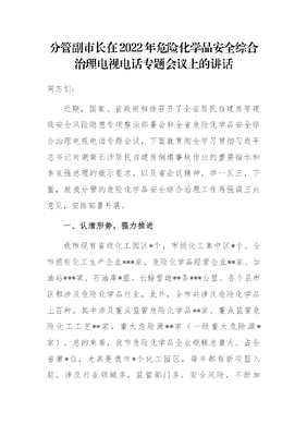 分管副市长在2022年危险化学品安全综合治理电视电话专题会议上的讲话同志们:近期,国家、省政府相继召开了全省居民自建房等建筑安全风险隐患专项整治部署会和全省危险化学品安全综合治理电视电话专题会议,下面就贯彻全学习贯彻习近平总书记对湖南长沙居民自建房倒塌事故作出的重要指示和李克强总理的批示要求,以及省会议精神,举一反三,下面,就我分管的危险化学品安全综合治理工作再强调三点意见,安排部署开展。一、认清形势,强力推进我市现有省级化工园区*个,市级化工集中区*个。全市拥有化工生产企业家,危险化学品经营企业**家、加油站家、石油库*座。长输管道**条公里。各个县市区都涉及危险化学品行业,此外,全市共涉及危险化学品上百种,其中涉及重点监管危险化学品**家,重点监管危险化工工艺**家,重大危险源**家(一级重大危险源*家)。总的来看,我市危险化学品企业规模总量大,占全省第*位,尤其是我市*个化工园区,每年都有新项目入驻。涉及行业领域多,监管部门多,安全风险,不断加大。危化品出事就是大事!群死群伤。这些都要求我们必须高度重视危化品综合治理工作,尤其是*个化工园区所在地,特别是定远、来安更要高度重视。另外,除生产企业以外,我们也同样有危化品运输企业,挂靠现象也同样存在。刚才,**厅长说某市*辆危化品运输车辆,本地仅有辆,挂靠在外的*余辆。据了解我市危险化学品运输车辆挂靠现象也比较严重,这些企业只收取挂靠费,平日车辆找不到,车况差,一旦出了事谁来负责?企业只为了赚钱,没有落实安全生产主体责任,没有安全管理责任意识,这些现象相当危险。市交通运输局正在开展专项治理,希望这一次整治行动,要彻查,不失职,不渎职。绝对不能走过场,要开展地毯式排查,要搞清楚我市危货运输企业的基本情况,全面进行整治。原则上不再新批危化品运输企业,确要增加车辆要严格把关,主要为我市化工企业运输必要的才能允许,严格监管。市委、市政府历来高度重视危化品安全生产工作。特别是国务院办公厅、省政府办公厅有关危险化学品安全综合治理实施方案印发后,**市长作了重要批示,市政府结合实际下发了我市综合治理方案。同时4月8日,市安委会办还专题组织相关成员单位及各县(市、区)召开了部署会议,解读了文件,部署了工作,分解落实了**项工作任务,从反馈情况来看,目前只有凤阳县、市环保局、市交通局等地区和部门上报了具体实施方案,其他都没有,这也充分说明,危化安全生产工作大部分地区和部门还没有引起高度重视,压力和责任还没有传导和压实,必须要引起我们一些地区和部门的高度警觉。没有上报方案的县市区、部门务必在5月底前上报,否则通报批评。前天召开的全市安全生产工作暨市安委会第一次全体会议上,**市长对抓好危险化学品安全生产工作又作了特别强调,各地各部门一定要狠抓落实。这次全国性开展危险化学品综合治理是贯彻落实党中央、国务院关于安全生产系列决策部署的关键性举措,是危化品领域强化红线意识、夯实安全发展基础的制度性安排。各地、各部门、各单位务必要统一思想认识,把握大势全局,深刻认识开展危化品综合治理工作的重要性紧迫性,进一步增强责任感使命感紧迫感,准确理解工作任务目标要求,明确责任分工,强化四个意识,不折不扣的抓好贯彻落实。二、突出重点,攻坚克难这次危化品综合治理分三个阶段,部署阶段、整治阶段、总结阶段。时间从2022年5月至2024年11月,时间跨度大,历时近三年,覆盖了危化品从生产到废弃处置的全过程,涉及多领域、多部门、周期长、任务重、要求高。贯彻落实好综合治理方案,准确把握重点与难点是关键、是前提,主线是遏制事故,核心是推动企业落实主体责任,难点是落实行业监管责任和提升监管能力。我们必须坚持问题与目标导向,统筹当前与长远,在全面深入总结分析危化品安全生产工作现状、问题、挑战的基础上,注重继承与深化、巩固与创新。我市《实施方案》提出了**个方面**项具体工作任务,涵盖了危险化学品安全风险评估、重大危险源管控、行业主管部门责任落实等**多个方面的工作,任务繁重,难点交错,只有攻坚克难,强力推进,才会有力推动工作。才能实现危化品综合治理工作的预期目标。也就是全市危化品企业安全生产主体责任、部门监管责任、政府属地责任得到有效落实,涉及危险化学品的各行业安全风险和重大危险源得到重点管控,园区外危化企业搬迁工程启动,危化产业布局更趋合理。刚才,副省长强调,不再新设立化工集中区,各地不要再上报设立申请。现有化工集中区不符合要求的,要开展整治,所有化工建设项目都要进入化工集中区,不在集中区的企业要有序开展搬迁入园工作。油气管道安全隐患整改攻坚战成果得到巩固。三、明晰任务,压实责任(一)加强领导,强化责任。各县市区、市有关部门要立即成立以政府和部门主要负责人任组长的综合治理工作领导小组。