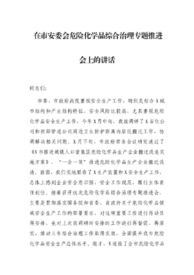 在市安委会危险化学品综合治理专题推进会上的讲话同志们:市委、市政府高度重视安全生产工作,特别是结合X城市结构和产业结构特征,安全风险比较高,尤其重视危险化学品安全生产工作,今年X月中旬,我就调研了X石化公司和西部管道公司周边卫生防护距离内居民搬迁工作,协调解决相关问题。X月下旬,市政府常务会议研究通过了《X市推进城镇人口密集区危险化学品生产企业搬迁改造实施方案》,一企一策推进危险化学品生产企业搬迁改造。前面,我们实地察看了X生产装置和X安全生产工作,总体上感到企业安全意识强,安全工作规范,履行主体责任到位。接着召开这次危险化学品综合治理专题推进会,主要是贯彻落实国务院和省委、省政府关于危险化学品领域安全生产工作的部署要求,对这项重要工作进行再动员再安排,也对上次我调研时安排的工作进行再督促、再落实,推动三年综合治理工作取得实效,全面提升我市危险化学品安全生产总体水平。刚才,X通报了全市危险化学品综合治理工作进展情况,对一些重点任务和难点问题进行了详细安排。下面,我就推动综合治理工作落实,讲三个方面的意见。一、提高政治站位,准确把握危险化学品安全生产形势开展危险化学品安全综合治理,既是新时代贯彻落实习近平总书记关于危险化学品应急管理和安全生产工作重要指示要求的关键性举措,也是强化红线意识、标本兼治、夯实安全发展基础的系统性安排,意义特殊,责任重大。各区县、各部门要进一步统一思想、提高认识,深刻把握开展综合治理工作的重要性和紧迫性。一要客观看待我市危险化学品领域现状。危险化学品安全是安全生产工作的重点,涉及企业数量多、行业领域多监管部门多、潜在安全风险大,近年来新问题、新挑战和新风险点不断出现,安全生产形势严峻复杂。我市作为建国初期重点布局的化工基地,石油化工产业相对聚集,石油化工行业在为我市经济社会发展做出积极贡献的同时,也给城市公共安全带来风险。我市现有危险化学品企业X户,涉及两重点一重大(重点监管危险化学品、重点监管危险化工工艺和危险化学品重大危险源)企业X户,危险化学品重大危险源X个,城市建成区内原油、成品油储罐容积逾400万立方米,危险货物运输企业X户、车辆X辆,长输油气管线X条、总里程X公里。任何一个企业、一个环节、一段管道、一辆运输车发生事故,都会产生严重影响,可能造成重大生命财产损失和严重环境污染。二要正确看待影响我市危险化学品安全生产的短板。从企业层面来看,危险化学品相关企业负责人普遍重视安全安全生产意识比较强烈,但因部分管理人员专业水平不够想要安全和抓好安全之间还存在能力上的差距,一些管理环节上还存在薄弱点和隐患点。从监管层面来看危险化学品由生到灭,涉及生产、经营、储存、运输、使用、废弃处置等环节,分布于农业、林业、建设、教育、卫生、医药、化工、商贸等多个行业,融入城市的各个领域,隶属于不同的行业管理部门,但个别领域监管还没有跟上,部分行业监管和属地管理责任落实不够有力,对辖区、行业涉危情况底数不清、情况不明,容易形成监管漏洞。三要准确看待危险化学品对城市发展构成新的风险点。随着城市快速发展和产业结构转型调整步伐加快,危险化学品安全面临新的形势,许多隐患和问题发生在以前认不清、想不到、管不到的领域。比如:高校、科研机构实验室使用的危险化学品试剂,医院使用的液氧、氧气,冷库使用的液氨,建筑工地使用的油漆、柴油,船舶使用的柴油,餐饮场所使用的醇基液体燃料等,均是以往监管的薄弱环节,不同程度存在监管盲区。四要辩证看待危险化学品的重要作用。危险化学品虽然存在有毒有害、易燃易爆等危险特性,但也是重要的能源和原材料,化工行业是国民经济不可缺少的行业门类和国防工业的重要支撑,还是我市重要的支柱产业。X的经济结构中,油、烟、钢占到经济总量的半壁江山,严重依赖石化产业。对化工行业,我们既不能漠视其存在的安全风险也不能把化工行业妖魔化,一禁了之,要在科学认识其危险特性、全面分析其安全风险、严格落实风险管控措施的基础上,引导化工行业安全发展、健康发展,服务全市经济社会发展。二、突出着力重点,扎实推进危险化学品安全综合治理工作这次综合治理工作覆盖了危险化学品从生产到废弃处置全过程,涉及领域广、单位多、周期长、任务重、要求高各区县、各部门要高度重视、深入研究,把综合治理作为安全生产重点工作来抓,结合实际,通盘考虑,综合施策标本兼治。这里,我着重强调几项重点任务:一要积极做好危险化学品产业发展规划。立足全市化工产业发展和现代化中心城市建设的需要,充分利用第五版城市规划编制时机,规划化工园区,为人口密集区危险化学品企业搬迁和化工产业发展创造条件,有效降低城市运行风险。市规划、国土、工信、安监、环保等部门和相关区县要协同配合,做好人口密集区危险化学品生产企业搬迁改造、证照注销、废弃危险化学品及装置无害处理、园区规划及用地手续