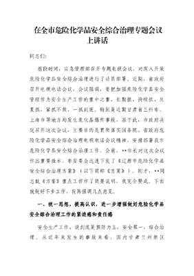 在全市危险化学品安全综合治理专题会议上讲话同志们:前段时间,应急管理部召开专题电视会议,对深入开展危险化学品安全综合治理进行了动员部署。近期,省政府召开电视电话会议,会议强调,要把加强危险化学品安全管理作为安全生产工作的重中之重,长期抓、持续抓、反复抓,紧抓不放、一抓到底。特别是近期甘肃省兰州市、上海市等地方均发生危化品爆炸事故,基于此,市政府决定召开这次会议,主要目的是贯彻落实国务院、省政府危险化学品安全综合治理电视电话会议精神,安排部署我市危险化学品安全综合治理工作。会前,**市长对这次会议作出重要批示,市安委会迅速下发了《辽源市危险化学品安全综合治理方案》(以下简称《方案》)。刚才,**同志就《方案》重点工作作了简要说明,我完全赞成。下面就做好下步工作,我再强调几点意见。一、统一思想,提高认识,进一步增强做好危险化学品安全综合治理工作的紧迫感和责任感安全生产工作,说到底是预防为主,安全第一,综合治理。从近年来发生的事故来看,国内甘肃兰州新区6.16 车间爆炸、6.18上海石化起火事故等事故,教训极其深刻。从我市危化企业情况看,全市危险化学品生产企业*家(停产*家);危险化学品使用企业*家;危险化学品经营企业家(加油站**家)。企业规模总量虽不大,但涉及行业领域多,监管部门多,安全风险增高。另外,除危化品生产使用、经营企业外,我市也同样具有危化品运输企业,挂靠现象不同程度存在。因此,抓好危险化学品安全生产工作,不仅能对为期3年的综合治理打下良好基础,更是确保今年危险化学品安全生产形势稳定。各县区、各部门要认清形势,统一思想,切实增强紧迫感和责任感,牢固树立四个意识,从政治和全局的高度,进一步凝心聚力,全力落实好危险化学品安全综合治理的各项任务。二、突出重点,明确任务,全力推进危险化学品综合治理工作这次危化品综合治理共分三个阶段,部署阶段、整治阶段、总结阶段,时间从2022年7月至2023年底,时间跨度大,历时近三年,覆盖危化品生产到废弃处置全过程,领域杂、部门多、周期长、任务重、要求高。工作中,要充分考虑综合治理工作的系统性、复杂性,远近结合,分阶段推进,要按照市政府统一部署,统筹安排,狠抓落实,坚决完成综合治理工作。今年,要着力做好以下几项重点工作:(一)排查摸底,全面掌握情况。全面排查摸底危险化学品安全风险,是综合治理工作基础中的基础。要按照《方案》要求,全面排查摸清本辖区、本行业涉及危险化学品企业底数。安监部门负责生产、经营企业的排查摸底工信部门负责民爆等企业的排查摸底;发改部门负责油气输送管道、运输工具加气站等的排查摸底;交通部门负责危险化学品运输企业的车辆、货场的排查摸底;生态环境部门负责废弃处置等企业的排查摸底。教育、公安、水利农业、卫健、住建等部门,都要各司其职,认真组织好排查摸底工作。要全面摸清涉及的危险化学品品种和主要安全风险,在此基础上,按行业、按区域形成危险化学品安全风险、重大危险源和高危化学品分布情况档案。(二)重点管控,防范重特大事故。防范遏制重特大事故是安全生产工作的牛鼻子。要加强事故规律研究,加强双重预防体系建设,强化源头管控和源头治理。要紧盯易发生事故的危险化学品重点区域,紧盯危险化学品生产、存储、运输、使用等重点环节,紧盯危险化学品罐区仓库等重点部位,彻查事故隐患,堵塞管理漏洞,确保各项措施落实到位。同时,进一步摸清城市人口密集区危险化学品生产企业底数,进一步加快搬迁进度,逐级落实搬迁责任。(三)强化执法,推动主体责任落实。分析近年来一些重特大事故,绝大多数事故都是违章违规,不执行安全管理规定产生的,主要原因是相当一些企业对安全生产不重视,管理不严,主体责任不落实,违法成本低,压力不够大,必须通过严格的执法来改变这种状况。各县区、各部门要以风险管控和隐患排查治理两个体系建设标准为主要检查内容,突出抓好危险化学品领域的专项执法工作。坚持凡检查必执法,切实加大依法处罚力度,对违法违规生产经营建设行为,要发现一起、查处一起。要加强企业安全生产诚信体系建设,建立完善危险化学品企业安全生产不良记录黑名单制度,严格按规定落实失信惩戒措施。通过严格的执法和失信惩戒,推动企业安全生产主体责任的落实。(四)夯实基础,提升安全保障能力。一要强化危险化学品安全监管能力建设。通过招录、遴选等方式选拔化工专业人才充实到各级危险化学品安全监管队伍中。要创新监管方式,加强中介机构力量的培育,利用政府购买服务等方式,充分发挥行业协会、安全生产服务机构等社会力量的作用,助力危险化学品安全监管。二要加快危险化学品安全监管信息化建设。建立危险化学品生产、储存、使用、经营、运输和废弃处置企业数据库,要充分利用物联网、云计算、大数据等先进技术,探索实施易燃易爆有毒危险化学品电子追踪标识制度,实现危险化学