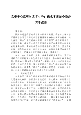 公司党委中心组研讨发言材料:强化学用结合坚持实干担当同志们:按照公司党委理论学习中心组学习安排,会前本人深入学习研读了学习习近平总书记重要讲话精神和全国两会精神。通过重温两会盛况视频和利用学习强国平台开展学习,我逐字逐句、原滋原味学习了习近平总书记在全国两会期间发表的重要讲话,深感总书记讲话通篇坚守人民立场、坚定历史自信、彰显使命担当、指引前进方向,必将激励全国各族人民在强国建设、民族复兴新征程踔厉奋发、勇毅前行。当前,我们正全面、完整、准确理解新发展理念,紧盯公司赋予公司职能定位和改革发展工作要求,全力推动XX业务发展,面临的XX等方面工作任务日趋繁重,作为一名长期奋战在基层一线的党员干部,深入学习领会两会精神的丰富内涵和精神实质,特别是两会中明确的新思想、新举措、新目标,对做好新时期各项事业发展工作极为重要。一、提升政治意识本次全国两会始终高举习近平新时代中国特色社会主义思想伟大旗帜,全面贯彻落实党的XX大精神,审议通过立法法修正草案、国务院机构改革方案,审议批准政府工作报告和其他报告,提出了2023年经济社会发展的总体要求、主要目标政策取向和重点工作,特别是选举产生新一届国家机构和全国政协领导人,习近平总书记再次全票当选中华人民共和国主席、中华人民共和国中央军事委员会主席,充分体现了党的意志、人民意志、国家意志的高度统一,具有重大的政治意义和深远的历史影响。我们要切实增强拥护两个确立、做到两个维护的思想自觉、政治自觉、行动自觉,思想上认同核心、政治上维护核心、组织上服从核心、行动上紧跟核心,把两个确立的政治共识转化为两个维护的行动自觉。二、强化学用结合学习宣传贯彻全国两会精神,是当前和今后一个时期的重要政治任务。特别要把学习贯彻习近平总书记在全国两会期间的重要讲话精神作为重中之重,坚持不懈用习近平新时代中国特色社会主义思想武装头脑、指导实践、推动工作,不断从必由之路中汲取前进力量,自觉做两个确立的坚定信仰者和忠实实践者,更加坚定忠诚核心、拥戴核心、维护核心、捍卫核心,始终沿着总书记指引的方向奋进新征程。学习过程中,我们要强化系统全面学习,把学习全国两会精神作为党员干部教育培训的重要内容,迅速掀起学习宣传贯彻全国两会精神的热潮。要强化融会贯通学,把学习全国两会精神与学习党XX大精神贯通起来,做到系统领会把握、一体推动落实。要强化立足实际学,对标对表总书记最新指示要求,以及政府工作报告对全年工作的有关部署,紧密结合公司年度工作会议各项目标任务和重点工作,切实把全国两会精神转化为公司高质量发展的务实举措。三、坚持实干担当我们靠实干创造了辉煌的过去,还要靠实干开创更加美好的未来。习近平总书记在2023年春节团拜会上的话语,鼓舞人心、催人奋进。全国两会吹响了奋进号角,我们要坚持实干担当、求真务实,牢记公司初心使命,正确看待发展路上遇到的困难和挫折,坚定不移地沿着既定目标前进。具体来说,我们要以拼的精神、闯的劲头、实的干劲,紧紧围绕年度公司下达的各项目标任务,全力以赴拼经营、拼业绩、拼发展,立足岗位主责主业,找准事业发展和企业改革创新的切入点和着力点,一体谋划、一体推进,扎扎实实、一步一个脚印地把发展进步的命运牢牢掌握在自己手中,扎实做好全年工作,确保如期实现全年目标任务,以实干担当奋力开创更加美好的未来。