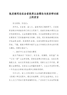 耿庆海同志在全省政府立法理论与实务研讨班上的发言各位领导、同志们:多年来,在省委、省人大、省政府的正确领导下,在省政府法制办和省直各部门的大力支持下,我省住房城乡建设立法步伐持续加快,立法质量稳步提高,为全省建设事业又好又快发展提供了坚实基础和有力保障。目前,现行有效的建设类地方性法规16部、政府规章18部,全省住建系统法律体系基本形成。下面,我就今明两年我厅立法工作情况以及存在的问题与建议,简要汇报如下:一、2017年立法工作基本情况我厅严格执行定班子、定任务、定期限、保质量的三定一保立法责任制,坚持站在群众角度立法、站在全局角度立法、站在求实角度立法的原则,创新立法工作手段,增强立法透明度,在保证立法质量的前提下,立法工作成果丰硕,一年内出台2部地方性法规和2部政府规章。今年5月,省人大审议通过《山东省风景名胜区条例》。《条例》审议过程中,通过实地调研、召开立法咨询会,在山东人大门户网站刊登草案稿等形式,广泛征求了社会各界的意见建议,回应了群众关切,凝聚了社会各界智慧,是一部广泛集中民智、充分反映民意的法规。《条例》结合我省实际,突出问题导向,在风景名胜区规划管理、建设项目选址核准、安全管理等方面均有所创新。今年9月,省人大审议通过《山东省建设工程抗震设防条例》。这是我省第一部专门规范建设工程抗震设防工作的地方性法规,在总结我省建设工程抗震设防工作经验的基础上,及时吸收了建设工程抗震设防方面的新标准、新经验、新要求,为我省建设工程抗震设防管理提供了法制保障。《条例》立法项目涉及面广、专业技术性强,由我厅与省地震局两部门共同起草。部门联合起草立法草案,这在我省地方立法工作中尚属首次。联合起草是丰富法案起草方式、落实科学民主立法、建立多方参与的联合起草机制的有效实践,有利于克服单一部门立法的弊端,切实提高立法质量。在立法工程中,我厅与省地震局顾全大局,密切协作,在顺利完成立法任务的同时,也为部门联合起草立法草案创造了成功经验。今年5月,《山东省工程建设标准化管理办法》及《山东省房屋建筑和市政工程质量监督管理办法》相继出台。《山东省工程建设标准化管理办法》创新规定了工程项目地方标准分类,规范了地方标准编制,强化标准设计的应用,有助于加强我省工程建设标准化管理,让标准成为对质量的硬约束,填补了我省建设领域立法空白。《山东省房屋建筑和市政工程质量监督管理办法》注重制度创新,按照工程建设时序,对工程参建各方的质量责任和主管部门的职责提出了明确要求,还对城市限额以下工程的监管作了规定,实现了工程建设全领域、全过程的质量监管覆盖。按照全省统一部署,我厅认真开展地方性法规、政府规章的清理工作,经对我厅现行有效的全部法规规章进行逐件审核,审慎论证,逐条提出了修改14件地方性法规、11件政府规章,废止3件政府规章的建议以及修改依据。在全面梳理的基础上,结合我省放管服改革及生态文明建设要求,进行了专项清理,目前,8件地方性法规、7件政府规章的修改意见已完成部门会签。二、2018年立法工作安排今年住房城乡建设立法任务依然繁重。省政府2018年地方立法计划目前已征求意见,我厅有20件立法项目列入计划,其中,《山东省历史文化名城名镇名村条例》列为地方性法规一类项目,《山东省绿色建筑促进办法》列为政府规章一类项目。山东是历史文化大省,是中华文明重要发祥地之一,为充分保护好历史文化遗产,早在1997年,第人大就出台了《山东省历史文化名城保护条例》,《条例》实施以来,对加强历史文化名城保护,避免历史文化名城在城镇快速发展过程中遭受建设性破坏发挥了重要作用,历史建筑、历史文化街区、历史文化名城点、线、面三维一体的保护管理体系初步建立,但仍然存在保护意识不强、保护机构不健全、保护资金不足、保护监管覆盖面不够、追责措施不到位等问题,特别是《条例》与2008年出台的国务院《历史文化名城名镇名村保护条例》,在适用范围上和管理制度上都需要进行调整,衔接。我厅多次召开《山东省历史文化名城名镇名村条例》专题论证会议,开展立法调研,广泛听取各方建议,明确修改方向,目前已形成草案初稿。《山东省绿色建筑促进办法》是今年的政府规章二类项目2018年升为一类项目。我厅成立了《办法》起草组,开展系列基础调研工作,多次召开专题论证会。目前,草案征求意见稿已经数易其稿。2013年国务院办公厅转发国家发展改革委、住房城乡建设部《绿色建筑行动方案》。2015年中共中央、国务院印发《关于加快推进生态文明建设的意见》,要求大力发展绿色建筑,推进绿色生态城区建设。2016年5月,省委、省政府发文强调城市新区全部按照绿色生态城区标准建设,新建工程全面执行建筑节能与绿色建筑标准,完善绿色建筑和绿色建材评价体系。《办法》按照国家和省的工作部署,总结多年全省工作经验,就扩大绿色建筑建设范围,