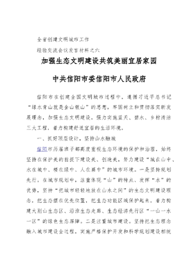 全省创建文明城市工作经验交流会议发言材料之六加强生态文明建设共筑美丽宜居家园中共信阳市委信阳市人民政府信阳市在创建全国文明城市过程中,遵循习近平总书记绿水青山就是金山银山的思想,牢固树立和贯彻落实新发展理念,加强生态文明建设,强力实施蓝天、碧水、乡村清洁三大工程,着力构建舒适宜居的生活环境。一、抓好顶层设计,坚持山水融城信阳市历届班子都高度重视生态环境的保护和治理,始终坚持在保护美的前提下建设美、创造美,努力建设城在山中、水在城中、楼在绿中、人在画中的城市环境。一是坚持规划先行。在城市规划中,注重体现山的特点、发挥水的优势,坚持把城市轻轻地放在山水之间的生态文明建设理念,把生态摆在优先位置,把生态功能区域保护起来,着力构建大别山生态区、沿淮生态走廊、生态经济先行区一山一水一区的绿色生态屏障。二是注重城市建设。坚持把生态理念融入城市建设全过程,实施严格保护开发和科学规划建设相统一,严禁破坏山体、植被、水系,在中心城区规划建设贤山、龟山、震雷山、金牛山、龙飞山、羊山等六山公园,总占地1657公顷,进一步促进了山、水、林、城一体融合发展,提升了山水信阳、休闲茶都的城市品牌。三是治防建管结合。坚持硬起手腕治,狠抓源头防,着眼长远建,完善机制管,在省内率先成立了以市委书记、市长全权负责的双组长制及覆盖发改、环保等30多个部门一把手为成员的生态文明建设领导小组,建立包含三类26个文件的生态文明建设制度体系,一月一调度、一季一督查、半年一考核、全年一考评,形成了有力有序有效的推进机制。二、抓好生态保护,留住碧水蓝天近年来,随着机动车辆大量增加、城镇化快速发展,城市大气污染、黑臭水体和农村环境脏乱差现象出现反弹。为防治环境污染,市委、市政府强力实施三大工程。一是实施蓝天工程。强力实施城市扬尘、燃煤、机动车、油气、工业、农业大气六项污染防治;全面实施工地100%围挡、物料堆放100%覆盖、车辆100%冲洗、路面100%硬化、拆迁作业100%喷淋、渣土车辆100%密闭六个百分之百;坚持高标准建绿,中心城区绿化覆盖率达42.46%,建成区绿地率达36.99%,人均公园绿地面积达14.14平方米。2016年优良天数达到247天,空气质量全省第一。二是实施碧水工程。2009年,争取省人大通过《信阳南湾水库饮用水水源保护条例》,这是全省保护地方饮用水水源的第一部地方法规。积极实施水源地保护行动,在南湾水库汇水区建设公益林41.9万亩,全市水源地水质达标率100%。突出黑臭水体治理,建立辖区为主、部门配合、社会参与的治理机制,全年消除湖、塘、堰黑臭水体30处,建设污水处理厂12座,污水处理规模达到47万立方米/日,出水合格率达到100%。实施淮河源国家重点生态功能区保护与建设,项目面积1.59万平方公里,为建设生态宜居城市提供了有力支撑。三是实施乡村清洁工程。通过财政以奖代补、项目资金整合、文明单位帮扶、社会资本参与等方式,构建多元化资金投入机制。2015年以来用于改善农村人居环境资金15.6亿元,持续13年开展清洁家园行动,引导农民改水、改厕、改路、改厨、改圈。组建村级卫生队2288支,绿化美化道路1200多公里,修建水冲式厕所1.2万多座、垃圾池3100多个,省级以上生态乡镇村156个,美丽乡村示范点300多个。三、抓好资源利用,打造生态产业在建设好、保护好绿水青山的同时,我们积极发挥生态优势,突出发展生态经济,努力变绿水青山为金山银山。一是壮大茶产业。信阳毛尖是信阳的响亮名片。近年来,我们大力发展绿色、无公害有机茶,提高茶产量,提升茶效益,做活茶经济。目前全市茶园面积达210多万亩,茶叶产量达5.95万吨,总产值超百亿元,茶叶从业人员超过120万人,人均种茶年收入超过5000元,信阳毛尖品牌价值上升到59.91亿元,居全国第二。二是发展绿色食品。以建设生产基地、发展龙头企业、提高农产品精深加工能力为重点,建设中部地区重要的绿色食品供应基地。全市农业龙头企业372家,无公害农产品69个,绿色食品36个,农产品基地369万亩,带动农户62万户,完成产值308亿元,实现利润61.6亿元。三是发展全域旅游。对信阳优越自然生态环境进行全景化打造,加快从景点旅游模式向全域旅游模式转变,积极推动旅游与多产业的融合发展,2016年信阳全市旅游综合收入175.6亿元,同比增长21.1%,占全市生产总值的8.7%。生态文明建设让690万信阳人民生活环境越来越美,钱袋子越来越鼓,幸福感越来越强。但是我们深知,创建文明城市,是对一座城市发展的更高要求,下一步,我们将认真贯彻此次会议精神,在文明进步的过程中厚植绿色、保护生态、科学发展,把信阳建设的越来越美!