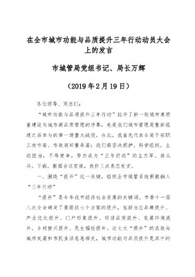 在全市城市功能与品质提升三年行动动员大会上的发言市城管局党组书记、局长万辉(2019年2月19日)各位领导、同志们:城市功能与品质提升三年行动拉开了新一轮城市高质量建设与城市高品质管理的序幕,也是我们城市管理局重新组建之后参与的第一场重大战役。在此,我首先代表全局干部职工向市委、市政府郑重承诺:我们将坚决拥护,科学组织,主动担当,不辱使命,努力成为三年行动的主力军、排头兵。下面,根据会议安排,我作三点表态发言。一、围绕提升这一关键,组织全市城管系统积极融入三年行动提升是今年我市经济社会发展的关键词。市委十一届八次全会确定了要狠抓七个方面的提升,包括生态品牌提升、产业优化提升、门户形象提升、项目品质提升、发展环境提升、乡村振兴提升、民生福祉提升。这七大提升的成效与城市发展和市民生活息息相关,城市功能与品质提升是其中的重要一环,提升也成为了我们城管部门重新组建之后的新目标新方向。通过体制改革,我局在市容、环卫、市政、园林等方面的管理职能将得到重新整合与优化,这要求我们必须在城市管理精细化方面要进一步提升手段、优化机制,在城管执法队伍建设方面要进一步提升素质、优化形象,在服务全市经济社会发展大局方面要进一步提升效率、优化能力。开展城市功能和品质提升三年行动,正是我们实现全市城管系统融入发展的新平台,是我们服务经济、服务社会、服务群众的新载体,我们全市各级城管部门必将全面动员、全力参与、全心投入到三年行动中,真正的把城市管理水平提升到与人民群众对美好生活的向往和需求相一致、相统一的高度。二、围绕问题这一导向,着力开展城市治理系列专项行动根据《九江市城市功能和品质提升三年行动方案》要求,从现在开始的三年左右时间里,我市将全面开展治脏、治乱、治堵、功能修补、生态修复、特色彰显、亮化美化、治理创新等八大行动,共计33项重点任务,其中明确由我局作为责任单位的重点任务有24项。针对这24项任务,我们将认真立足本职、结合实际,科学制定专项工作方案,组织成立专门推进机构,并把每项任务细化分解到基层、到个人,实现层层有人抓、事事有人管,做到人人有责任、件件有落实。2019年是三年行动的启动年,根据全市专项行动计划,我局将着力聚焦脏、乱、差等问题导向,坚持综合治理、依法治理、深度治理,从深入推进占道经营、车辆停放、建筑工地、道路扬尘、餐饮油烟、屋顶广告、违法建设、市政园林等一系列专项治理行动着手,达到治好城市病、美化城市貌的目的,让美丽宜居、整洁文明的城市初现。三、围绕创新这一思路,建立城市管理新机制新秩序开展城市功能和品质提升三年行动,是对城市风貌的新塑造、城市品质的新彰显、城市形象的新展现,这对新时代的城市管理提出了更高的要求,必须打破原有的桎梏、突破旧有的手段。现阶段,城市管理正在逐步向城市治理转变,我们必须向改革要效力,坚决推进落实城管执法体制改革,并结合机构改革进一步下沉执法力量、理顺机制、厘清职责,优化整合市政园林职能,积极构建大城管格局,推进出台提升城市管理精细化、智慧化、规范化水平的新机制,为接下来的城市功能和品质提升三年行动凝聚更大的合力、产生更大的动能。此外,我们还要继续深化环卫市场一体化,全力推进生活垃圾焚烧发电,启动生活垃圾分类和餐厨垃圾处置项目,加快数字城管、智慧城市建设,切实提升市级监督指挥考核的指挥棒和裁判员作用。春风劲吹开新篇,春雷震响励新志。我们将以此次动员大会为新的起点,在市委、市政府的坚强领导下,以绣花功夫抓管理,以人民城管为已任,以文明执法为标准,以打造江西省最干净的城市为目标,团结和带领全市城管系统的广大党员干部在城市功能和品质提升三年行动中作出新贡献、建立新业绩、树立新形象,为全体市民创造更加干净、整洁、漂亮、有序的城市环境,并在推动城市高质量跨越式发展的进程中实现九江城管的高质量跨越式发展。
