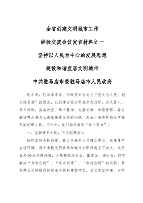 全省创建文明城市工作经验交流会议发言材料之一坚持以人民为中心的发展思想建设和谐宜居文明城市中共驻马店市委驻马店市人民政府近年来,驻马店市委、市政府牢固树立创文为人民、创文促发展的理念,以创建全国文明城市为目标,加大投入、补齐短板,实施攻坚、集中整治,完善机制、加强管理,着力解决群众最关心最直接最现实的问题,走出一条具有驻马店特色的创建之路。工作中,我们始终做到五个坚持:一、坚持情系于民,不忘创建初心始终坚持为民创建,着力在满足人民群众需求、改善生产生活环境、提升市民文明素质和城市文明程度上下功夫,先后召开30余次高规格、大规模的动员会、推进会、培训会,切实解决为谁创建、谁来创建、如何创建的问题。针对群众反映强烈的突出问题和薄弱环节,成立市容环境、文明交通、公益广告、志愿服务、诚信建设等8个专项攻坚行动领导小组,分别由一名市委常委和一名市级领导担任正副组长。四大班子领导分包重点路段和社区,深入一线、靠前指挥。市委市政府督查室、六城联创办、创文办成立联合督查组,加强督促检查,强化奖惩问责,以务实的作风、扎实的措施推进创文工作。二、坚持造福于民,加大民生投入驻马店是一个欠发达的农业大市,基础薄弱、欠账较多。为改变落后现状,我们创新融资模式,加大建设力度。2015年,投资70多亿元,实施100多个基础设施项目;2016年,投入100多亿元,实施300多个重点城建项目;今年又以百城建设提质工程为带动,在中心城区实施7大类338个城建项目,计划投资142亿元。道路交通方面,打通65条断头路,改造940条背街小巷,完成30余条主干道升级改造,实施12条组团连通工程。生态水系方面,对6条河流进行整治,实施4个水系公园建设和水系连通、雨污分流。园林绿化方面,对20多处公共绿地进行改造,新增绿化面积90万平方米,城市绿化率、绿化覆盖率、人均公园绿地面积3项指标均高于国家园林城市标准。环卫设施方面,新改建垃圾中转站47座、公厕288座,改造旱厕近万座。投资2.1亿元,购置1097台先进环卫清扫、清运、洒水、降尘车辆,城区机械化清扫率和高压冲水率达到100%。公共服务方面,市图书馆、博物馆、气象科普馆、群艺馆、体育中心、职工文化活动中心等建成投用,科技馆、青少年宫、杨靖宇纪念馆、会展中心加快建设,城市功能逐步完善,城市面貌明显改观。三、坚持问需于民,开展攻坚行动过去驻马店给人的印象是脏乱差,对外形象差,群众意见大。我们坚持向困难开战,向顽疾亮剑,整合资源、集中整治、全力攻坚。开展市容环境攻坚行动,从群众反映强烈的清运垃圾入手,对老旧社区、无主社区、城中村堆积多年的垃圾集中清运,清运垃圾35万吨,一举消灭困扰群众多年的脏乱差问题。设立12319零星建筑垃圾清运热线,免费清运垃圾8000多吨。投入5000万元,对38个城中村、1100个楼院进行整治,关停限改两小单位490多家,清理转移废品收购站200余户,拆除违章墙体广告3万平方米、门店橱窗广告2400处,粉刷墙体立面65万平方米。开展城市秩序攻坚行动,抽调40名精干警力,成立交警支队机动巡逻大队;招募协管员300人,通过交通违法有奖举报、增加停车位、建立文明交通宣传电子屏、清理占道经营等方式,有效改善市区交通秩序。投入4.19亿元,对13个农贸市场进行标准化升级改造,改造面积8.5万平方米,受到市民广泛称赞。开展规范化建设攻坚行动,对所有办事处、乡镇政府、社区硬件设施进行完善提升,对全市222家窗口单位和116家机关、企事业单位进行集中治理,对公交、出租司机进行专业培训,市区64所中小学校全部达到规范化建设标准。开展文明内涵攻坚行动,广泛深入开展弘扬和践行核心价值观主题活动,努力打造好人之城,选树道德模范、身边好人工作在全省位于前列,2015年中央媒体集中报道了我市公民道德建设工作。投入3000多万元,新增实体公益广告900余处、8万多平方米,更换路牌站牌公益广告3400余块。大力推进诚信建设和志愿服务制度化,加快建设信用信息互联互通、交换共享平台,开展诚信教育实践活动,开展万名文明使者志愿服务市直单位周五志愿服务日志愿服务手牵手活动,各类志愿者近52万人,文明单位干部职工注册志愿者达到95%以上。四、坚持取信于民,健全长效机制为避免群众担心的创建搞形式、一阵风,我们坚持以常态长效的管理巩固创建成果。推行制度化管理。出台市民文明行为规范和中心城区公共厕所、建筑工地文明施工、居住小区、农贸市场、文明交通等管理办法。出台市容管理考核办法,对辖区办事处、职能部门进行严格考核奖惩。推行网格化管理。进一步理顺市、区、办事处、社区、网格职能,以沿街商户和单位为点,落实门前三包责任制;以主次干道为线,实行路长责任制;以行政区域为面,实行三级网格化管理,做到