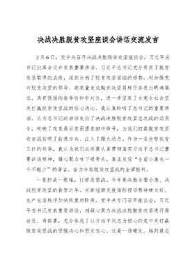 决战决胜脱贫攻坚座谈会讲话交流发言3月6日,党中央召开决战决胜脱贫攻坚座谈会,习近平总书记出席会议并发表重要讲话。习近平总书记充分肯定了脱贫攻坚取得的成绩,深刻分析了脱贫攻坚面临的形势,对加强党对脱贫攻坚的领导、高质量完成脱贫攻坚目标任务提出明确要求,具有很强的指导性和针对性,进一步坚定了全党全社会坚决打赢脱贫攻坚战的信心决心。我认真聆听了总书记的重要讲话,认为总书记的讲话发出了决战决胜脱贫攻坚总攻战的动员令,吹响了攻克最后贫困堡垒的冲锋号,为我们打赢脱贫攻坚收官战指明了前进方向、注入了强大动力。作为一名分管扶贫工作的领导,我认为我们必须要认真贯彻落实习近平总书记重要讲话精神,凝心聚力啃下硬骨头,真正兑现全面小康也一个不能少的诺言,奋力夺取脱贫攻坚战的全面胜利。一要拧成一根绳,打好攻坚战。今年是决胜全面小康、决战脱贫攻坚的收官之年。在新冠肺炎疫情防控形势持续向好、生产生活秩序加快恢复的阶段,党中央专门召开座谈会,习近平总书记发表重要讲话,对凝心聚力决战决胜脱贫攻坚进行再动员、再部署,充分体现了以习近平同志为核心的党中央打赢脱贫攻坚战的坚强决心和坚定信心。这是一场硬仗,越到最后越要紧绷这根弦,不能停顿、不能大意、不能放松。我们要以总书记重要讲话精神为指引,坚持把打赢脱贫攻坚战作为增强四个意识、坚定四个自信、做到两个维护的实际行动,全市上下拧成一根绳,一鼓作气、乘势而上,集中优势力量、发起最后总攻,确保脱贫攻坚再战再胜、连战连胜、决战决胜,奋力夺取脱贫攻坚战的最终胜利。二要铆足一股劲,啃下硬骨头。总书记在讲话中指出,脱贫攻坚战不是轻轻松松一冲锋就能打赢的,从决定性成就到全面胜利,面临的困难和挑战依然艰巨,决不能松劲懈怠。今年是脱贫攻坚最后一年,原本就有不少硬仗要打,收官之年又遭遇疫情影响,各项工作难度更大、任务更重、要求更高。全市上下要铆足一股劲,坚定信心、迎难而上,坚决克服疫情影响,凝心聚力打赢脱贫攻坚战,确保如期完成脱贫攻坚目标任务,确保如期全面建成小康社会。要努力克服疫情影响,严格落实分区分级精准防控策略,优先支持贫困劳动力务工就业,切实解决扶贫农畜牧产品滞销问题,支持扶贫产业恢复生产,加快扶贫项目开工复工,做好对因疫致贫返贫人口的帮扶;要谋划好组织好春风行动,充分利用好春耕生产的有利时机,把蔬菜、茶叶、生态家禽、食用菌、中药材等绿色优质农产品变成产业优势、经济优势;要认真对标对表两不愁三保障要求,用绣花功夫做细各项脱贫工作,确保每一环节都精益求精;要做好啃硬骨头的充分准备,遵循扶贫与扶志、扶智相结合,制定务实细致的脱贫对策;要加强扶贫领域作风建设,坚决反对形式主义、官僚主义,减轻基层负担,做好工作、生活、安全等各方面保障,不断提升群众对脱贫攻坚工作的满意度;要切实做好贫困群众的基本生活保障和因疫致贫人口的帮扶,及时落实兜底保障等帮扶措施,不断增强贫困群众克服困难、摆脱贫困的信心,凝心聚力打赢脱贫攻坚战。三要定下一个调,携手奔小康。当前,我市还有XX贫困人口,这是贫中之贫、困中之困﹔还有XX万脱贫不稳人口和边缘人口,返贫致贫风险不小。我们要定下一个调,真正兑现全面小康也一个不能少的诺言,把准方位航向,聚力解决绝对贫困问题,确保2020年现行标准下农村贫困人口全部脱贫,消除绝对贫困。要改进工作作风,落实奖惩机制,主要领导带头,主动担当,以上率下,带动各级干部提振精气神,以决战决胜姿态打赢打好脱贫攻坚战;要以提高脱贫质量为核心,加大对贫困村内贫困人口的支持,要盯准目标,制定并落实好各项帮扶措施持续发力,坚决提高帮扶措施的针对性与实效性;要健全稳定脱贫长效机制,对已脱贫人口做到脱贫不脱责任、不脱帮扶、不脱政策、不脱项目,确保稳定脱贫不返贫;要夯实具体工作任务,抓紧找差距、补短板、强弱项,切实提高脱贫质量,全面反映脱贫工作效果;要严格考核开展普查,严把退出关,坚决杜绝数字脱贫、虚假脱贫;要统筹推进全面脱贫与乡村振兴有效衔接,理清工作思路,推动减贫战略和工作体系平稳转型,统筹纳入乡村振兴战略,建立长短结合、标本兼治的体制机制。脱贫攻坚工作已经到了攻坚拔寨的冲刺阶段,我们要以更强大的勇气、更扎实的作风、更顽强的干劲,思想要紧起来、力度要大起来、速度要快起来,采取超常规的手段和超常规的力度,全力推进脱贫攻坚各项工作顺利开展,确保脱贫攻坚任务如期全面完成,向党中央、向历史、向全市人民交一份合格答卷。