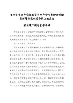 在全省重点行业领域安全生产专项整治行动动员部署电视电话会议上的发言省住建厅副厅长李泰峰按照会议安排,省住建厅按照省委、省政府关于安全生产工作的决策部署,围绕住建领域房屋建筑、市政工程及城镇燃气安全生产专项整治,着力做好以下工作:一、统一思想,提高认识深入开展重点行业领域安全生产专项整治行动,加强建筑施工和城镇燃气为重点的专项整治,是我们今年的重点工作任务。6月份,进入施工旺季,建筑施工安全事故也进入易发期,加强安全监管,落实安全责任,遏制发生重特大安全事故,是各级住建管理部门和工程建设各方主体义不容辞的责任。因此,住建行业各相关单位要牢固树立以人民为中心的安全发展理念,充分认识专项整治行动的重要意义,把思想和行动统一到习近平总书记关于安全生产工作的重要思想和党的十九大精神上来,统一到国务院安委会的工作要求上来,统一到省政府的决策部署上来,坚持依法监管、改革创新、源头防范、系统治理的原则,以防范遏制重特大事故为重点,坚持问题导向,全面加强建筑施工和城镇燃气专项整治,严格落实各项安全责任和措施,努力减少一般事故,防范较大事故,坚决遏制重特大事故,为实现黑龙江全面振兴发展营造良好稳定的安全生产环境。二、精心安排,强化措施各级住建主管部门、各有关单位要严格按照省安委会印发的《黑龙江省建筑施工安全专项治理行动工作方案》、省住建厅制定的《黑龙江省建筑施工和城镇燃气安全专项整治行动工作实施方案》要求,结合当地实际,认真抓好专项整治的各项工作。一要做好动员部署、自查自改工作。各地要按照省实施方案重点任务,结合已有工作部署和地区实际情况,因地制宜制定具体专项整治工作方案,细化工作措施,全面动员部署专项整治行动,将专项整治行动贯彻落实到辖区内每家企业、每个工程项目。要指导、督促工程项目各方主体及城镇燃气企业开展自查、自纠、自行整改。6月底前,对在建工程项目、城镇燃气企业全面排查安全风险隐患点,建立安全隐患清单和整改清单,落实整改责任,消除安全隐患。隐患清单和整改落实情况要进行公布,重大隐患整改情况及时报送当地住建主管部门。二要做好深入检查、集中整治工作。各地住建主管部门在企业和项目自查的基础上,组织检查组,深入开展督查检查,在重点工作时段、重要时间节点、重要施工环节上加大执法检查力度,发现问题要求立即整改,及时消除事故隐患。哈尔滨市要对城市轨道交通、地下综合管廊等重点工程项目实现检查全覆盖。在专项整治工作期间,省住建厅将联合相关部门定期对各地专项整治工作进展情况进行督查。三、加强领导,落实责任(一)落实监管责任。各级住建主管部门主要负责人和分管领导要按照党政同责、一岗双责,齐抓共管的要求,深入一线组织开展大范围、高密度检查和巡查;各级监管部门要突出检查重点、监管重点,强化安全风险管控和隐患排查治理,对存在安全风险的,督促责任单位立即整改,对存在较大事故隐患要责令停止施工。对在专项治理活动中发现有重大事故隐患,不及时整改的,依法严格对负有责任的建设、施工、监理等单位和有关人员进行处理。省住建厅将对违法违规行为查处不力、存在失职渎职行为的,给予通报,并依法依规处理。(二)落实施工企业主体责任。一要加强项目安全生产管理机构建设,健全完善安全管理制度;二要严格施工项目管理人员和从业人员安全教育培训;三要严格深基坑、高支模板、脚手架、起重机械、建筑用电等专项施工方案编制审核;四要严格危险性较大工程施工安全交底;五要严格隐患排查治理。对检查出的隐患要做到责任、措施、资金、时限、方案五落实,确保隐患整改到位;六要严格执行施工现场带班管理和执业人员持证上岗;七要严格应急预案制定,开展应急演练,增强应急救援能力和效果;八要严格城市轨道交通工程、市政管廊工程施工安全风险管控。(三)落实燃气企业主体责任。城镇燃气企业要开展对管道、生产经营场所安全设施的全面排查,严格执行各项规章制度和工作人员持证上岗制度,做好对燃气用户安全使用的宣传教育工作,指导用户按照安全规范要求使用燃气器具,确保燃气安全管理责任落实到位。四、加强舆论宣传,及时上报工作进展情况各地住建主管部门要充分利用报纸、电视、网络等各种新闻媒体,全方位、多渠道宣传报道专项整治行动开展情况。要强化专项整治信息报送,严格按照时间节点要求向上级主管部门报送工作方案、开展情况、阶段性总结。生命至上、安全发展,全省各级住建主管部门和有关单位要按照本次会议和省安委会的要求部署,在专项整治行动中履职尽责、真抓实干,保质保量完成专项整治工作任务,确保全省建筑施工安全生产形势持续稳定健康发展。