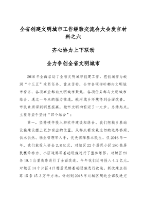 全省创建文明城市工作经验交流会大会发言材料之六齐心协力上下联动全力争创全省文明城市2016年全面启动了全省文明城市创建工作,把创城作为蛟河十三五攻坚任务、重点目标,全市各项指标都向文明城市看齐,各项事业都向文明城市聚焦,各项任务都与文明城市结合,通过一年来的强力推进,蛟河城乡环境得到全面改善,市民素质得到明显提高,城市文明向前迈了一大步。总结起来,主要得益于坚持四个结合:第一,坚持硬件投入和软件建设相结合。我们把城乡基础设施建设摆上更加突出的位置,从群众需求最迫切的道路桥梁、供水供热、物业管理等入手,优先保障基本民生。仅2016年一年,我们就投入资金2.8亿元,对城区22个居民小区280栋居民楼给排水、小区道路等基础设施进行了整体维修,对城区23条19.1公里街路进行了全面改造。今年我们还将投入4.2亿元,对城区14个片区417栋居民楼基础设施进行改造,新改建主街路15条15.3万平方米,计划到2018年对城区周边全部改造完毕,届时,蛟河城市面貌将焕然一新。在加大硬件投入满足群众基本民生需求同时,我们广泛开展了以提升文明素质为核心的软件建设,在机关,围绕践行社会主义核心价值观,组织干部带头开展社会公德、职业道德、家庭美德、个人品德教育,崇尚文明、无私奉献扎根干部心中。深入开展自选动作我为蛟河发展服务差点啥大讨论,打造了勤政高效的政风。在群众中,我们创新开展文明单位、文明窗口、文明村镇创建活动,围绕讲文明语言、行文明礼仪、树文明形象,共创建吉林市级文明单位22个、文明乡镇5个、文明村7个、文明社区3个、最美家庭200户、美丽庭院400户、干净人家2500户,精神文明遍地开花。第二,坚持全面推进与重点突破相结合。在整体上,我们成立了由党政主要领导任总指挥的创城工作指挥部,下设由市级领导牵头的7个专项工作组,紧紧锁定创城的7个测评项目58项测评内容、118条测评标准,精心组织了创城整体谋划,精细制定了三年创城规划、精准实施了年度工作计划,从严采取联席会议、督查查办、半年述职、年终考评等硬性举措,全面协同推进各项任务,保证创城目标一个不落的实现,防止创建出现木桶短板效应。在局部上,我们坚持突出问题导向,精准围绕创城工作短板实行重点突破。为彻底解决困扰城区居民20多年的饮水问题,我们投入6.56亿元,建成了人民群众盼望已久的团山子水利枢纽工程,又筹资6200万元配套实施了城区二次供水和老净水厂改造,自此,蛟河中心城区实现了24小时供水,蛟河市民吃上了放心水。为去除群众深恶痛绝的违章建筑顽疾,我们从去年开始重拳出击,强力实施了城市违建大扫除行动,共拆除小区违建809处1.62万平方米,并跟进维修小区道路20万平方米,全面铲除了城市牛皮癣,打通了城市毛细血管,人民群众全力支持,无一信访。第三,坚持城乡统筹与村社联动相结合。我们全面树立城乡统筹理念,突出城乡区域协调发展,着力解决城乡发展不平衡的问题,逐步形成了城镇建设与乡村建设齐头并进的良好局面。在城区,我们扎实开展了文明社区创建,围绕便民利民服务型社区建设,不断完善社区基础设施,深化一站式菜单式服务,推动了社区建设、管理、服务水平全面提升。在农村,围绕改善群众生活,我们全力突出贫困群众脱贫这块短板,全力推进脱贫攻坚,2016年成功实现15个村、3621户、7166人脱贫。我们按照突出重点、梯次推进、全面提升的原则,突出乡镇政府所在地和交通干线、旅游沿线村屯,扎实开展了以六清为重点的农村人居环境整治和社会主义新农村重点项目建设,不搞突击,不搞一阵风,持之以恒抓出效果,打造美丽乡村。目前,我们准备筹集2亿元资金,全部投入到农村环境整治上。此外,我们充分发挥社区和村级组织社会基本单元的润滑剂和服务器作用,用心教育引导广大群众培树勤俭持家、尊老爱幼的家风,邻里和睦、互帮互助的民风和移风易俗、科学文明的村风,营造文明城市的新风正气。第四,坚持干部带头与群众参与相结合。我们注重发挥党员干部的模范带动和示范引领作用,在机关单位开展了以创建文明城市为主题的实践活动,引导广大党员特别是领导干部积极投身创城工作第一线,争当创城工作的宣传员、信息员、示范员和战斗员,努力争做文明市民的践行者、倡导者。在全市机关长期开展你我同行,扮靓环境集中整治,83个责任单位分区包片,参与人数达1.8万人次,共清理清运垃圾1100余吨,清理小区绿地3万余平方米,清扫楼道卫生1600余个。同时,我们持续加大宣传报道力度,通过广播电视、政府网站、手机APP、公众宣传栏等载体,广泛宣传创城动态、先进典型,使群众感到创城就在身边,创城从我做起,让群众与创城互动了起来。我们每年都开展文明市民评选,2016年共评选第三届蛟河之星154人、第二届最美蛟河人及提名奖21人,这种