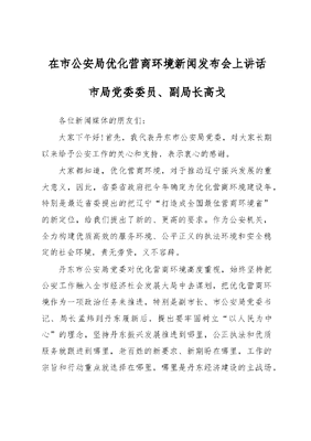 在市公安局优化营商环境新闻发布会上讲话市局党委委员、副局长高戈各位新闻媒体的朋友们:大家下午好!首先,我代表丹东市公安局党委,对大家长期以来给予公安工作的关心和支持,表示衷心的感谢。大家都知道,优化营商环境,对于推动辽宁振兴发展的重大意义,因此,省委省政府把今年确定为优化营商环境建设年,特别是最近省委提出的把辽宁打造成全国最佳营商环境省的新定位,给我们提出了新的、更高的要求。作为公安机关,全力构建优质高效的服务环境、公平正义的执法环境和安全稳定的社会环境,责无旁贷,义不容辞。丹东市公安局党委对优化营商环境高度重视,始终坚持把公安工作融入全市经济社会发展大局中去谋划,把优化营商环境作为一项政治任务来推进,特别是副市长、市公安局党委书记、局长孟炜到丹东履新后,提出要牢固树立以人民为中心的理念,坚持丹东振兴发展推进到哪里,公正执法和优质服务就跟进到哪里,老百姓的新要求、新期盼在哪里,工作的宗旨和行动重点就选择在哪里,哪里是丹东经济建设的主战场,哪里就是丹东公安工作的大舞台,充分表明了公安机关服务振兴发展的鲜明决心和坚决态度。前期,我们在全市范围内组织开展了声势浩大的公共安全隐患大排查大整治四个专项行动,着力解决了一批影响营商环境、服务发展、平安稳定的各类突出治安问题,得到了市委市政府和人民群众的充分肯定。在此基础上,为进一步提升优化营商环境、提升服务发展的水平,让公安改革的红利,更好的惠及群众,按照市委市政府和上级公安机关的相关部署,特别是新一届市公安局党委提出的严实新快深高细七字新要求,坚持民意导向、问题导向,通过召开人大代表、政协委员座谈会、警民恳谈会、网上征求意见等形式,广泛收集社会各界对于优化营商环境建设的措施建议,立足公安机关承担的任务职能,在深入调查研究、反复调研论证的基础上,出台了《丹东市公安局优化营商环境服务经济发展便企利企30条措施和便民利民20条措施》。可以说,这50条措施,既是丹东市公安局贯彻落实十九大精神的实际行动,也是公安机关优化营商环境、服务经济发展对全市人民做出的具体承诺。刚才,政治部光斌主任对便企利企30条措施和便民利民20条措施,进行了详细解读。下面,就如何落实好这50条措施,我要对公安内部各职能部门提两点要求:一个是言必行、行必果。公安机关的一言一行,代表着党委政府形象。民有所呼、我有所应,有诺必践、言出必行。既然我们承诺了,就必须要兑现,不能失信于民。因此,牵头这项工作的相关警种部门,是第一责任部门,各单位一把手是第一责任人,要亲自部署、推动、督促这项工作。同时,各单位要安排一名分管领导和具体民警,专司专职负责这项工作,公开的办理电话,要有专人负责接听,不能成为摆设。对企业和群众个人的需求,要第一时间受理,第一时间解决,第一时间落实,第一时间反馈,确保真正把好事办实办好。第二个就是行不果、必追责。市局将把优化营商环境建设工作、特别是50条措施的落实情况,纳入年度绩效考核,列为各级领导班子、领导干部实效考核的重要内容,对组织有力、成效明显的,要提出表扬;对工作落实不到位、推诿扯皮的,要通报批评,特别是对损害群众利益的,要进行严肃追责。在此,市局党委明确一条,谁破坏营商环境,就砸谁的饭碗,绝不手软。市局督察部门也要加大督导检查力度,一条一条、一项一项的检查落实情况,确保50条措施,真正落地生根,惠及群众。同时,我想对在各位媒体朋友提两点希望和恳求:就是当公安机关优化营商环境的宣传员和监督员。一方面,把公安机关的50项举措,以及工作中取得的重大成果宣传出去、展示出去,做到家喻户晓,更好的回应人民群众的期盼,努力营造全警关心营商环境、人人都是营商名片的浓厚氛围。另一方面,监督好我们的承诺履行情况,定期把情况通报给我们,通过责任倒逼,真正把工作落到实处。最后,我代表丹东市公安局郑重承诺:全市公安机关将认真学习贯彻党的十九大精神,牢固树立大服务意识,以出台便企利企、便民利民50条措施为契机,努力当好优化营商环境、推动振兴发展的参与者、实践者、服务者、守护者,在推进丹东新一轮全面振兴中实践中施展更大作为,不断提升人民群众获得感、幸福感和安全感。谢谢大家!