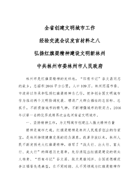 全省创建文明城市工作经验交流会议发言材料之八弘扬红旗渠精神建设文明新林州中共林州市委林州市人民政府林州市是红旗渠精神的发祥地,四有书记谷文昌同志的故乡,总面积2046平方公里,人口109万。林州历届市委、市政府以传承和弘扬红旗渠精神为己任,把争创全国文明城市作为推动两个文明协调发展、增进广大群众福祉的总目标、总抓手,不断提振城市的精气神,不断增强城市的软实力,2016年以第一名的优异成绩再次当选河南省文明城市。一、坚持精神立市,为文明城市创建注入强大精神力量精神是城市之魂。红旗渠精神是林州人民艰苦创业的传家宝,是林州持续健康发展的动力源泉。改革开放以来,林州人民不断发扬光大红旗渠精神,谱写了战太行、出太行、富太行、美太行的辉煌历史篇章,先后涌现出红旗渠建设的领头人杨贵、四有书记谷文昌、航天英雄刘洋、全国道德模范李江福等先进典型,在不同时期、从不同领域为红旗渠精神作出了时代的注解、树立了时代的标杆。我们在创建文明城市工作中,高度重视、充分发挥精神旗帜的引领作用,市委专门作出弘扬红旗渠精神,加快林州发展的决定,利用红旗渠干部学院、红旗渠纪念馆、谷文昌纪念馆、扁担精神纪念馆等重要红色教育阵地,对各级党员干部进行长期有效的思想政治教育;广泛开展红旗渠精神五进活动和红旗渠畔好少年评选等系列活动,并通过新闻媒体、公益广告,让各类先进典型的故事传遍城乡、人人熟知,让劳动模范、道德模范成为人人尊敬、人人学习的榜样,共同打造100万林州人的精神高地。二、突出生态文明,努力建设世界人文山水城市林州坚持以创建全国文明城市为龙头,突出生态优先,开展国家卫生城市、智慧城市、生态示范市等六城联创活动,全力推动世界人文山水城市建设。近年来,市委、市政府坚持以路扩城、以改建城、以绿美城、以水活城,大力实施环保整治、美丽乡村和蓝天碧水工程,完成生态林业建设11.6万亩,依托红旗渠、太行大峡谷等5A级景区,着力打造红色、绿色、蓝色三色旅游品牌,推动林州从旅游资源大市向旅游强市的转变提升。在加快城市建设的同时,注重城乡统筹推进、一体发展,提出建设全域式景区、全域式园区、全域式社区的目标,努力让处处有自然美景、村村有特色产业、家家户户都能够享受到城市社区般的服务,真正把城市建设、管理、创建的成果惠及到每一位老百姓。三、做到建管并重,不断提升城市精细化管理水平在推进文明城市创建过程中,以百城建设提质工程为契机,坚持以创促建、以创促管,进一步完善城市功能,优化城市环境,提高精细化管理水平。在城市建设方面,共投资6.1亿元,推进城市精品大道和黄金通道建设,新建、续建道路13条,改造6条,综合整治背街小巷2.1万米,铺设供热分支管网6.76公里,改造14个棚户区。新增绿化面积186万平方米,城市绿化率达33.7%。在公共服务方面,启用150辆新型公交车辆,建设60个公共自行车租赁站,投放1200辆公共自行车,为市民绿色出行创造良好条件。购置5台道路清扫车,15辆洒水车,机扫面积、洒水面积达530万平方米,为城市干净有序提供有力保障。在精细化管理方面,大力实施网格化管理,以城市管理行政执法局牵头,公安、交通、卫生、工商质监等部门参与,把市区分成三级网格化网络,开展了环境卫生、市容市貌、交通秩序、违法建筑、广告牌匾等专项整治,较为彻底地解决了私搭乱建、占道经营、黑三轮、小广告、空中蜘蛛网等城市顽疾,使整个城市更加秩序井然、设施齐全、生活宜居。四、倡导全民向善,建设人人参与的志愿者之城我们经常教育广大干部和市民群众,红旗渠是靠一砖一石建成的,林州的美誉度是靠每个人的真情热情凝成的。学雷锋志愿服务人人可为、事事可做,最能够体现创建文明城市的群众性广泛性。市文明委、文明办大力推广志愿服务总站—分站—总队—分队层层动员、层层推动的活动模式,率先建成安阳市第一个市级志愿服务总站,建成22个分站,形成有特色的学雷锋志愿服务队182支,特色志愿服务活动项目100多个。在林州的交通路口、大街小巷、社区广场,一年365天,天天能见到助人为乐的小红帽,已经成为一道靓丽风景线。在红旗渠、太行大峡谷、五龙洞、万泉湖等多个景区,1.3万文明旅游志愿者有序疏导游客、清洁景区、开展文明劝导和应急处理,赢得广大游客的广泛赞誉。许多游客在享受到贴心服务之后,主动利用节假日到林州做志愿者,共同把爱心传递下去。创建文明城市,使林州城乡面貌焕然一新,市民素质明显提升,城市知名度不断提高,让红旗渠精神名扬天下。近年来,林州先后荣获全国绿化模范市国家园林城市全国文化先进市等多项荣誉,但我们深知,文明是一座城市的集中体现,文明城市是一项含金量最高的综合荣誉。下一步,我们将认真学习全国、全省会议精神,学习赵素萍部长讲话精神,进一步在弘扬红旗渠精神上持续用