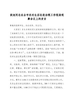 侯旭同志在全市农村生活垃圾治理工作现场观摩会议上的发言尊敬的国辉市长、各位领导、同志们:大家好!首先非常欢迎大家到滦南视察指导工作。刚才看了滦南的几个村,应该说滦南的农村环境整治工作也处在一个初始探讨的阶段,工作中还有很多的欠缺和不足,也欢迎大家提出非常宝贵的意见。去年以来,在市委、市政府正确领导下,在上级相关部门精心指导下,滦南县把改善农村人居环境,作为实施乡村振兴战略的第一场硬仗,坚持政府主导+市场运作+群众参与,扎实开展农村人居环境整治攻坚。下面,就农村生活垃圾治理工作做一简要汇报交流:一、创新思路,全面推行市场化运作。农村垃圾面临清扫难、运输难、处理难、保持难的四难情况,为走出整治、反弹、再整治、再反弹的怪圈,我们下定决心,打破陈旧观念,树立市场思维,将农村环境治理推向市场。一是优中选优,确定市场主体。2017年9月,经过多方对接,采用公开招标的方式,最终以1394万元招募到唐山市东信物业服务有限公司,负责全县农村垃圾清扫、收集和清运,589个行政村全部纳入集中整治范畴,1400万对于物业公司既要买设备,又要清扫,前两年可能会赔钱,但是步入正轨运转起来以后,是有利润的。二是配齐装备,构建框架体系。督促物业公司,完善组织架构,增上设备设施,选聘保洁人员,共购置垃圾桶1.5万个,垃圾压缩车16辆,电动、人力三轮车1500辆,选聘区域经理16人、雇佣保洁人员1560人。原来每个村都有垃圾储存室,在实际运转过程中容易造成二次污染,我们现在每个村都配备,垃圾储存室有垃圾立即清运,有效避免了二次污染。原来计划买37辆车,每天清运一次,但是把底数清出来之后,16辆车每三天清运一次就可以完全保障。三是管干分离,保障运作效果。以镇为单位建立微信群,发现问题,及时反馈,限期整改;制定《农村环境卫生考核细则》,每月对物业公司考核打分,作为拨付环卫费用的主要依据。在此基础上,我们与杭州锦江集团合作,建设垃圾综合处理中心,分拣、压块,最后发电,实现农村垃圾收集、清运、分类、处理一体化。二、聚焦难点,持续开展整治攻坚。这项工作确实有难度我们坚持决心一次下足、措施一步到位、整治一役达标,开展大规模集中整治行动。一是农村街道两面净专项攻坚。全面实施125工程,1就是一个目标,实现各村主副街道、村庄周边无垃圾;2就是分两步走,每镇先确定1个标杆村,一步整治到位,打个样子,然后其他村对标达标、整治提升;5就是五个层面,把关验收,即村自查、镇申报、农工委初验、分管领导踏查、常委会最后验收。凡是各镇认为心里有底的,可以申请由县委常委、人大主任、政协主席每个村、每条街道地现场踏查、现场打分,通过了正式提交给物业公司,通不过的镇委书记当场做检查,目前已有478个村通过验收。二是积陈垃圾专项治理攻坚。组织各镇村集中时间、集中力量,对村内和连村路积陈垃圾进行全面彻底清理。为避免垃圾搬家、就地处置等二次污染,把16个镇分成4个片区,排出时间表、路线图,轮流有序向垃圾填埋场清运。截至目前,各镇村共清运积陈垃圾1.6万车、50多万吨。这些只是集中清运阶段,有人开玩笑前清时代的垃圾还有呢,也确实远远超出了我们预期的想象,刚才在路上交流有领导也问我们,有没有可能物业公司把垃圾扔在半路坑塘里,其实这种问题是不存在的,一是我们加强监督,另外物业公司的业务是全覆盖的,路边、坑塘里的垃圾也是他们清运,所以这么做只能提高他们的运营成本。三、共治共享,建立长效保洁机制。我们发挥社会整体联动的优势,发动全民共建美好家园、共享整治成果。一是调动群众参与。确定每周六为全民清扫日,发动村民出义工,对房前屋后、庭院内外进行清扫保洁;开展除陋习、树新风活动,组织卫生庭院星级文明户评比,典型示范,凝聚合力。群众的理解和参与非常重要。二是逐级压实责任。县级层面,书记、县长挂帅,四大班子领导分包坐镇,这项工作肯定是难,但是只要下决心,没有做不了的事;镇级层面,书记、镇长负总责,班子成员包片、机关干部包村;村级层面,村两委为责任主体,村干部包块、党员包户,逐级签订责任状。农村环境卫生整治与村两委工资挂钩。三是常态督导巡查。县委、县政府督查室真督实查,发现问题,及时整改销号;县电视台开辟专栏,跟踪报道,表扬先进,鞭策后进,形成了农村环境整治的浓厚氛围。同时,我们把连村路建设、街道硬化、绿化美化,作为农村垃圾治理的基础保障。仅去年以来,改造农村公路433公里,硬化农村街道256万平方米,新增造林绿地3万多亩,实现了农村环境洁净美。各位领导,农村人居环境整治是乡村振兴战略的重要内容,是最能给群众带来直接获得感的民心工程。滦南县下步将以这次观摩活动为契机,虚心向兄弟县(市、区)学习,全力以赴抓好农村人居环境整治,为唐山加快三个努力建成、实现