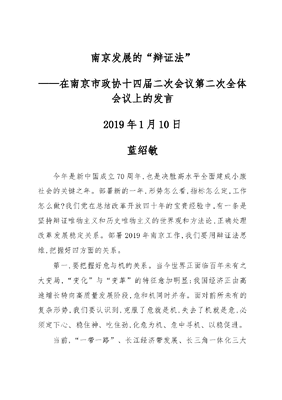 南京发展的辩证法——在南京市政协十四届二次会议第二次全体会议上的发言2019年1月10日蓝绍敏今年是新中国成立70周年,也是决胜高水平全面建成小康社会的关键之年。部署新的一年,形势怎么看,指标怎么定,工作怎么做?我们党在总结改革开放四十年的宝贵经验中,有一条是坚持辩证唯物主义和历史唯物主义的世界观和方法论,正确处理改革发展稳定关系。部署2019年南京工作,我们要用辩证法思维,把握好四方面的关系。第一,要把握好危与机的关系。当今世界正面临百年未有之大变局,变化与变革的特征愈加明显;我国经济正由高速增长转向高质量发展阶段,危和机同时并存。面对前所未有的复杂形势,我们要认识到,克服了危就是机,失去了机就是危,必须定下心、稳住神、吃住劲,化危为机、危中寻机、以稳促进。当前,一带一路、长江经济带发展、长三角一体化三大国家方略叠加南京,城市面临难得的历史性机遇。刚公布的江苏沿江城市轨道交通规划中,南京一下增加四条城际铁路,以南京为中心的米字形铁路网正在形成;人才、资本等高端要素加速向南京集聚,去年34万大学生在南京就业参保。我们要以更大决心、勇气、手笔、力度去谋发展、求突破,提升中心城市首位度,发挥省会城市更大的作用。第二,处理好稳和进的关系。2018年南京地区生产总值增长8%,一般公共预算收入增长11.1%,两项指标均快于全省、高于全国,在副省级城市中进位明显。按照过去惯例,南京新一年计划指标比全省平均水平高1个点,地区生产总值增长7.5%,但是我们今年指标提到7.5%-8%,就是要在变中求稳中有进的信心。时代因奋斗而常新,城市因梦想而行远。有什么样的追求,才有什么样的结果。我们要去做更多看似不能达成的目标,完成看似不能完成的任务,克服看似不能解决的难题。如果没有这种决心、意志和追求,而是自降一格,我们就不能达到理想的发展境界。第三,正确处理二产和三产的关系。2018年,南京服务业增加值占比60.7%。然而在我省,南京的GDP占了全省的13.6%,工业增加值只占了全省的9%;经济总量全省第二位,工业增加值全省第四位。作为中心城市,南京提升服务业占比是必需的,但这一提升应是城市整体实力提高上的增长,而不是二产发展不那么快,三产一枝独秀。中心城市要高度重视制造业占比过快下降。南京的三次产业结构现在是1.9:37.4:60.7,近几年我们要让制造业占比逐步提升,发展一批全省第一、全国前三、全球有影响力的地标产业,像新能源汽车、集成电路、人工智能等。我们今年打算对工业企业设备投资给一个普惠制的政策,给予10%的政府补贴,将来以江宁为代表的六个工业区,工业投资要占到60%左右。第四,把握好强政府与强服务的关系。强政府与强市场双向叠加,是我省的特点。对于强政府的着力点,省委非常明确,强政府要强在服务上,通过政府的服务强来助推企业的实力强。南京要坚持问题导向,转换工作视角,把用户思维、客户体验理念,融入政府治理和服务全链条。打造好营商环境,南京要推动更深层次改革,要有更多的刀刃向内,更多地从群众和企业角度去想问题。去年我们在高铁南京南站建了城市候机楼,就是来自一个企业家的建议,一年就把它做成了,在南站办理值机,可以缩短去机场办理时间1小时。将来的目标,我们应该在新街口都可以把禄口机场的值机手续办了,把方便交给企业,麻烦留给政府,评判交给群众。