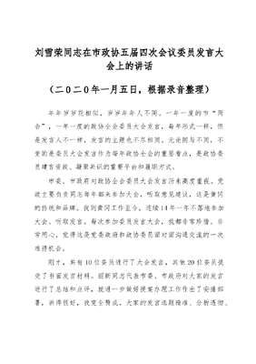 刘雪荣同志在市政协五届四次会议委员发言大会上的讲话(二0二0年一月五日,根据录音整理)年年岁岁花相似,岁岁年年人不同。一年一度的市两会,一年一度的政协全会委员大会发言,每年形式一样,但是发言人不一样,发言的主题也不尽相同。无论同与不同,不变的是委员大会发言作为每年政协全会的重要看点,是政协委员建言资政、凝聚共识的重要平台和履职方式。市委、市政府对政协全会委员大会发言历来高度重视。党政主要负责同志每年都来参加大会,听取意见建议,这是黄冈的传统和品牌。我到黄冈工作至今,连续14年一年不落地参加大会、听取发言。每次参加委员发言大会,我都非常珍惜、非常用心,觉得这是党委政府和政协委员面对面沟通交流的一次难得机会。刚才,共有10位委员进行了大会发言,其他20位委员提交了书面发言材料。丽新同志代表市委、市政府对大家的发言进行了总结和点评,就进一步做好提案办理工作作出了安排部署,讲得很好,我完全赞成。大家的发言选题精准、分析透彻、建议中肯、成果丰硕,涵盖经济社会发展方方面面。听了看了后,我深受启发、深受教育。从中可以感受到委员们调研深入、思考认真,体现了高度的事业心责任感,体现了良好的综合素质和履职能力,也体现了扎实的工作作风。这里面有很多的金点子、金句子,会后我将安排交办,加快成果转化运用。去年的委员发言大会上,我提出政协组织和政协委员要答好三道考题。即,黄冈要在高质量发展中力争上游,我们怎么办?黄冈改革发展稳定需要良好的环境,我们怎么办?人民群众越来越向往更加美好的生活,我们怎么办?一年来,市政协深入动员全市各级政协组织和广大政协委员紧紧围绕这三道考题开展工作,提交了高质量的政协作业。1月3日的《黄冈日报》以《春天,交出一份靓丽的新答卷》为题,用一个通栏两个整版的篇幅进行详细报道,介绍了政协一年来的答题情况。报道对这三道考题有一个精准解读,首先是政治考题,其二是发展考题,其三是民生考题,其四是履职考题。从新闻视角鲜活生动地对政协工作进行了系统回顾,这与政协工作报告互为补充、互相印证。这篇报道很有分量、很有价值,对于我们深入贯彻落实党中央和省委、市委的决策部署,扎实做好各项工作,具有启发和借鉴意义。希望每一位政协委员都认真学习、消化吸收。去年我们答了这三道考题,今年怎么办?要继续作答,明年也要继续作答,持之以恒,久久为功。政治考题、发展考题、民生考题、履职考题,是政协工作的永恒答卷,只有坚持不懈把这几道题答好,一年答得比一年好,我们的工作就能不断迈上新台阶。今天,我着重就学习贯彻党的十九届四中全会精神,谈一谈个人心得体会。党的十九届四中全会作出了关于坚持和完善中国特色社会主义制度、推进国家治理体系和治理能力现代化若干重大问题的决定,这是以习近平同志为核心的党中央,在当今世界面临百年未有之大变局,实现中华民族伟大复兴正处于关键时期,作出的具有重大现实意义和深远历史意义的战略部署。《决定》由15个部分构成,主要内容体现为十三个显著优势的系统总结,十三个坚持和完善的全面部署。坚持和完善人民当家作主制度体系,发展社会主义民主政治是第三部分,分为五个方面,讲了人大工作、政协工作、统战工作、民族区域自治和基层群众自治。特别强调要谋求最大公约数,画出最大同心圆。公约数、同心圆是两个数学概念,用来比喻中国共产党领导的多党合作和政治协商制度,恰如其分,精辟贴切。什么是公约数?公约数是指一个能被若干整数同时整除的整数。如果一个整数同时是几个整数的约数,称这个整数为它们的公约数;公约数中最大的称为最大公约数。对任意的若干正整数,1总是它们的公约数。比如,12、16两个整数,它们的公约数是1、2、4。因为12÷1=12,16÷1=16,12÷2=6,16÷2=8,12÷4=3,16÷4=4,都能同时整除。在1、2、4三个公约数中,4是最大的,就是12、16的最大公约数。从哲学意义上讲,公约数是12与16的一致性和多样性的统一。一致性指它们有共同的公约数,多样性指它们的公约数不只一个。坚持一致性和多样性统一,就是谋求它们的最大公约数。同样道理,来看一看中国共产党和各民主党派的关系,这里面有很多一致性。比如,坚持中国共产党的领导,坚定中国特色社会主义共同理想,热爱祖国、热爱人民,巩固和发展最广泛的爱国统一战线。不论什么党派、什么信仰,组织章程是什么、联系什么界别、从事什么工作,这几条都是共同的,这就是公约数。那最大公约数是什么?就是坚持中国共产党的领导。中国共产党领导是中国特色社会主义最本质的特征,是中国特色社会主义制度的最大优势。党政军民学、东西南北中,党是领导一切的。毫无疑问,这就是最大公约数。什么叫同心圆?是指同一平面上同一圆心而半径不同的圆其特点是圆心相同、半径不同。以一个点为圆心的所有圆都是同心圆,同心圆有无穷个,但圆心只有一个。引申来