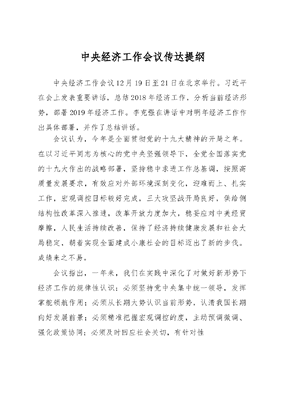 中央经济工作会议传达提纲中央经济工作会议12月19日至21日在北京举行。习近平在会上发表重要讲话,总结2018年经济工作,分析当前经济形势,部署2019年经济工作。李克强在讲话中对明年经济工作作出具体部署,并作了总结讲话。会议认为,今年是全面贯彻党的十九大精神的开局之年。在以习近平同志为核心的党中央坚强领导下,全党全国落实党的十九大作出的战略部署,坚持稳中求进工作总基调,按照高质量发展要求,有效应对外部环境深刻变化,迎难而上、扎实工作,宏观调控目标较好完成,三大攻坚战开局良好,供给侧结构性改革深入推进,改革开放力度加大,稳妥应对中美经贸摩擦,人民生活持续改善,保持了经济持续健康发展和社会大局稳定,朝着实现全面建成小康社会的目标迈出了新的步伐。成绩来之不易。会议指出,一年来,我们在实践中深化了对做好新形势下经济工作的规律性认识:必须坚持党中央集中统一领导,发挥掌舵领航作用;必须从长期大势认识当前形势,认清我国长期向好发展前景;必须精准把握宏观调控的度,主动预调微调、强化政策协同;必须及时回应社会关切,有针对性主动引导市场预期;必须充分调动各方面积极性,形成全局工作强大合力。会议强调,在充分肯定成绩的同时,要看到经济运行稳中有变、变中有忧,外部环境复杂严峻,经济面临下行压力。这些问题是前进中的问题,既有短期的也有长期的,既有周期性的也有结构性的。要增强忧患意识,抓住主要矛盾,有针对性地加以解决。会议指出,我国发展仍处于并将长期处于重要战略机遇期世界面临百年未有之大变局,变局中危和机同生并存,这给中华民族伟大复兴带来重大机遇。要善于化危为机、转危为安,紧扣重要战略机遇新内涵,加快经济结构优化升级,提升科技创新能力,深化改革开放,加快绿色发展,参与全球经济治理体系变革,变压力为加快推动经济高质量发展的动力。会议强调,明年是新中国成立70周年,是全面建成小康社会关键之年,做好经济工作至关重要。要以习近平新时代中国特色社会主义思想为指导,全面贯彻党的十九大和十九届二中、三中全会精神,统筹推进五位一体总体布局,协调推进四个全面战略布局,坚持稳中求进工作总基调,坚持新发展理念,坚持推动高质量发展,坚持以供给侧结构性改革为主线,坚持深化市场化改革、扩大高水平开放,加快建设现代化经济体系,继续打好三大攻坚战,着力激发微观主体活力,创新和完善宏观调控,统筹推进稳增长、促改革、调结构、惠民生、防风险工作,保持经济运行在合理区间,进一步稳就业、稳金融、稳外贸、稳外资、稳投资、稳预期,提振市场信心,增强人民群众获得感、幸福感、安全感,保持经济持续健康发展和社会大局稳定,为全面建成小康社会收官打下决定性基础,以优异成绩庆祝中华人民共和国成立70周年。会议指出,宏观政策要强化逆周期调节,继续实施积极的财政政策和稳健的货币政策,适时预调微调,稳定总需求;积极的财政政策要加力提效,实施更大规模的减税降费,较大幅度增加地方政府专项债券规模;稳健的货币政策要松紧适度,保持流动性合理充裕,改善货币政策传导机制,提高直接融资比重,解决好民营企业和小微企业融资难融资贵问题。结构性政策要强化体制机制建设,坚持向改革要动力,深化国资国企、财税金融、土地、市场准入、社会管理等领域改革,强化竞争政策的基础性地位,创造公平竞争的制度环境,鼓励中小企业加快成长。社会政策要强化兜底保障功能,实施就业优先政策,确保群众基本生活底线,寓管理于服务之中。会议认为,我国经济运行主要矛盾仍然是供给侧结构性的必须坚持以供给侧结构性改革为主线不动摇,更多采取改革的办法,更多运用市场化、法治化手段,在巩固、增强、提升、畅通八个字上下功夫。要巩固三去一降一补成果,推动更多产能过剩行业加快出清,降低全社会各类营商成本,加大基础设施等领域补短板力度。要增强微观主体活力,发挥企业和企业家主观能动性,建立公平开放透明的市场规则和法治化营商环境,促进正向激励和优胜劣汰,发展更多优质企业。要提升产业链水平,注重利用技术创新和规模效应形成新的竞争优势,培育和发展新的产业集群。要畅通国民经济循环,加快建设统一开放、竞争有序的现代市场体系,提高金融体系服务实体经济能力,形成国内市场和生产主体、经济增长和就业扩大、金融和实体经济良性循环。会议指出,今年三大攻坚战初战告捷,明年要针对突出问题,打好重点战役。打好防范化解重大风险攻坚战,要坚持结构性去杠杆的基本思路,防范金融市场异常波动和共振,稳妥处理地方政府债务风险,做到坚定、可控、有序、适度。打好脱贫攻坚战,要一鼓作气,重点解决好实现两不愁三保障面临的突出问题,加大三区三州等深度贫困地区和特殊贫困群体脱贫攻坚力度,减少和防止贫困人口返贫,研究解决那些收入水平略高于建档立卡贫困户的群体缺乏政策支持等新问题。打好污染防治攻坚战,要坚守阵地、巩固成果,聚焦
