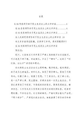 目录在XX党组领导班子民主生活会上的点评讲话1在XX县委领导班子民主生活会上的点评讲话..4在XX党委领导班子民主生活会上的点评讲话..7在人武部党委领导班子民主生活会上的点评讲话14本文系作者原创投稿,仅供学习参考,请勿照搬照抄!在XX党组领导班子民主生活会上的点评讲话同志们:刚才,大家相互之间开展了严肃认真的批评与自我批评,可以说是不遮不掩、坦诚相见,开出了辣味,达到了红红脸、出出汗的目的和要求。这次的民主生活会会议主题明确,程序规范,组织周密,班子成员态度端正,材料扎实,体现了领导带头,坚持了问题导向,吐露了真心、碰撞了思想,下了真功夫,说了真心话,是一次严肃认真、民主团结、求真务实的一次民主生活会。不但认真贯彻了市纪委、市委组织部的要求,聚焦思想政治、精神状态、工作作风及工作实绩方面进行深刻对照检查,而且有理有据,不存在应付,走过场的情况,严格对照全面从严治党、两个维护、严肃党内政治生活,细致查摆了领导班子和班子成员存在的问题。能够参加此次的民主生活会也是让我受到感染,得到启发总的感觉有四个鲜明的特点。一是自我批评开门见山。大家在刚才的发言中,紧密联系个人思想工作实际,聚焦三个方面查摆出了存在的问题和表现,有的还列举了一些典型事例。对班子查摆的问题,大家都能够对号入座、主动认领。应当说,每个班子成员都坚持把自己摆进去,自我批评做到了讲问题实事求是,开门见山,不回避矛盾,触及思想深处,触及问题实质。自我批评的态度是诚恳诚实的,认真揭短、大胆亮丑的勇气是可嘉的,达到了自我检查、自我教育、自我提高的目的。二是问题查摆很全面。班子成员在查摆问题表现后,能够严查危害、深剖根源,紧密结合各自思想和工作实际,从思想、作风、实绩等方面剖析产生问题的思想根源。有的分析原因时,还结合个人的成长经历、工作中的表现和典型事例,从不同的角度进行了深刻剖析,挖掘了自己灵魂深处的病根所在。三是相互批评有辣味。在相互批评的过程中,能够看出大家本着出自公心、对同志负责的态度,坦诚相见,大家推心置腹、开诚布公、有缺点谈缺点,有意见讲意见,有什么问题就提什么问题,当面锣、对面鼓,民主生活会有交流、有交锋,有共识、有共勉,达到了团结-批评-团结的目的。四是整改措施可操作。每位同志都谈了整改方向,前期取得了一定的成效,通过今天的民主生活会,会班子和班子成员又针对存在的突出问题,结合各方面的意见建议,从思想认识、工作作风、廉洁自律等各个方面,制定出了比较具体的整改措施、体现了即知即改的态度和真抓真改的决心。这次民主生活会是新形势下严肃党内政治生活的新开始,不管征求意见,还是对照检查,主要还是要抓好整改,只有整改到位了,我们这次民主生活会的效果才能体现出来,才能算是一次高质量的党内政治生活。在这里我谈几点个人的建议:一是要持续加强学习。民主生活会虽然开完了,但我们还要坚持把学习放在首位,特别是要学好习近平新时代中国特色社会主义思想和党的十九大精神,要防止懈怠思想,班子成员要带头深入基层、深入实际,到一线照镜子、找差距,及时发现和解决问题。进一步坚定理想信念,增强政治定力,牢固树立政治意识、大局意识、核心意识、看齐意识,发挥关键少数示范引领作用,切实解决好党员干部世界观、人生观、价值观总开关问题。坚持在各项工作中把党总揽全局、协调各方落到实处,凝聚起改革发展的强大合力。二是要加大整改力度。各位同志要在前期边整边改的基础上,对这次民主生活会中提出的问题,要拿出切实可行的整改方案,细化具体的整改落实时间表,建立台账,规定完成整改的时间节点。切实把整改作为常态,会后把相关的整改情况及时上报,特别是要围绕此次民主生活会的主题,做好三个方面问题的整改,做到真改、实改、彻底改,真正改出成效。三是要巩固整改成果。建章立制是巩固整改成果的关键。党组要把制度建设作为解决查摆出来的问题的治本之策,本着务实管用的原则,认真梳理现有制度,完善制度体系,运用常态、长效的方法堵塞漏洞,治理源头,切实解决好制度缺位的问题。要加强调查研究,广泛征求意见,在制度出台前进行广泛、科学和充分的论证,保证每项制度规范、理性、管用、有效,实现党的建设制度化、规范化和常态化。我就讲这些,谢谢大家。本文系作者原创投稿,仅供学习参考,请勿照搬照抄!在XX县委领导班子民主生活会上的点评讲话同志们:总的来看,这次民主生活开得很好。常委同志们认真学习贯彻习近平新时代中国特色社会主义思想,严格按照中央、省委、市委的安排部署,广泛征求意见建议,深入开展谈心谈话,反复修改党性分析材料,认真做好批评和自我批评的准备,吐露了真心,碰撞了思想,查找了问题,深挖了根源,下了真功夫,说了真心话,达到了预期效果。一是问题查摆很全面。大家聚焦合格党员标准,对