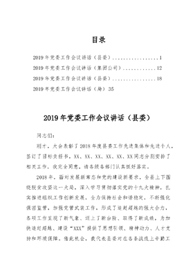 目录2019年党委工作会议讲话(县委)..12019年党委工作会议讲话(集团公司)122019年党委工作会议讲话(县委).182019年党委工作会议讲话(局)352019年党委工作会议讲话(县委)同志们:刚才,大会表彰了2018年度县委工作先进集体和先进个人,签订了目标责任书,XX、XX、XX、XX、XX、XX同志分别安排了相关工作,我完全同意,请各级各部门认真抓好落实。2018年,面对发展新常态和党的建设新要求,全县上下围绕脱贫攻坚这一大局,深入学习贯彻落实党的十九大精神,扎实推进组织工作创新发展,全力保持社会和谐稳定,不断强化保密监管,加强党管武装工作,形成了追赶超越的强大合力,各项工作呈现了新气象、迈上了新台阶、取得了新成绩,为加快追赶超越、建设XXX提供了思想引领、精神动力、人才支持和环境保障。借此机会,我代表县委对在各条战线上辛勤工作的同志们表示衷心的感谢!对做出优异成绩、受到表彰奖励的先进集体和先进个人表示热烈的祝贺!下面,我就做好2019年党委各项工作,讲三个方面的意见:一、以站在高处的胸怀和气魄,切实增强做好党委各项工作的责任感和使命感党的十九大对推进新时代新发展做出了战略部署。走好新征程,实现新目标,我们必须始终坚持站在全局、谋在高处、走在前列,切实把提高党委各项工作科学化水平,上升到巩固党的执政地位、强化党的执政能力的高度,统筹推进党的思想、组织、政法、统战、保密、武装等各项工作,不断增强各级党组织的凝聚力和战斗力。第一,要站在增强四个意识的高度来认识。中国特色社会主义最本质特征和最大优势是中国共产党的领导,我们最大的政治就是坚持党的领导。我们要站在强化四个意识的高度,坚定政治立场,提高政治站位,履行政治责任,遵守政治纪律和政治规矩,真正把四个意识变为思想自觉、党性原则、纪律要求和实际行动,坚决维护党中央权威和党的集中统一领导,以更大的决心、更大的力度、更实的举措,坚定不移加强和改进党委各项工作,确保党的路线方针政策在X落地生根。第二,要从推进全面从严治党的高度来谋划。党的十九大提出了新时代党的建设的总要求,部署了推进新时代全面从严治党的各项工作。我们要按照十九大部署和省市要求,坚持把党的政治建设摆在首位,着力用习近平新时代中国特色社会主义思想武装全党,全面加强党的政治、思想、组织、作风、纪律和制度建设,抓住主要矛盾,创新工作机制,加强薄弱环节,解决突出问题,层层传导压力,强化追责问责,努力提升全县党的建设科学化水平。第三,要从保障新时代加快追赶超越的高度来落实。党委各项工作是加快经济社会发展的方向引领、力量支撑和政治保障。当前,我县正处于脱贫摘帽的攻坚期,经济社会发展的转型期。县委十九届X次全会对2019年全县经济社会发展和党的建设进行了全面部署,做出了具体安排。全县各级党组织和广大党员干部要紧盯追赶超越目标,围绕脱贫攻坚工作大局,把党的建设融入到经济社会发展的各领域、各环节,着力抓重点、补短板、破难点、创亮点,最大限度地调动各方面的积极性、主动性、创造性,努力营造风清气正的政治生态,形成心齐劲足的发展氛围,凝聚追赶超越的强大合力。二、以舍我其谁的勇气和担当,统筹推进党委各项工作2019年是深入学习贯彻习近平新时代中国特色社会主义思想和党的十九大精神的重要一年,是新中国成立70周年,也是决胜全面建成小康社会的冲刺之年,是全面贯彻省委十一届三次全会部署的落实之年。做好2019年党委各项工作,意义重大影响深远。各级各部门要强化政治担当、履行政治责任,突出工作重点,强化关键举措,全力推进重点工作落实。第一,关于党建工作:要深入贯彻全面从严治党各项要求,推动党建工作全面加强、全面提升、全面过硬。一要着力锻造三支铁军。立足改革创新、转型发展,着力增强八种能力,切实把县级各套班子建设成为站位全局、引领发展、狠抓落实的创业铁军;立足脱贫攻坚主战场,聚焦年度脱贫目标,切实把镇办班子建设成为担当负责、作风优良、执行有力的攻坚铁军;立足建强基层堡垒,抓好村级两委会换届,选优配强村级班子,切实把村级班子建设成为群众信任、服务有力、纪律严明的实干铁军。二要统筹推进党的建设。扎实推进党的建设五位一体布局,深入开展不忘初心、牢记使命主题教育,实现两学一做学习教育常态化、制度化;深入推进党建领航·脱贫攻坚,不断深化党支部+三变改革+集体经济+贫困户模式,建强基层堡垒、发展集体经济、助推脱贫攻坚,加快发展步伐。三要形成良好作风导向。扎实落实三项机制,认真组织实施追赶超越擂台赛电视问政,形成督查考核问责、推动工作落实的闭合回路,着力整治官僚主义、形式主义新问题,树立正确用人导向,营造良好政治生态,