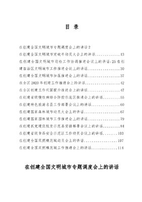 目录在创建全国文明城市专题调度会上的讲话2在创建全国文明城市突破年动员大会上的讲话.13在创建全国文明城市迎检工作协调推进会议上的讲话.25在创建自治区文明城市工作推进会议上的讲话..30在创建全国文明城市加压推进会上的讲话..37在全区2020年创建工作推进会上的讲话42在全区创建工作巩固提升推进会上的讲话..47在创建省级慢性病综合防控示范区推进会上的讲话55在创建特色旅游名县工作部署会议上的讲话60在创建国家森林城市动员大会上的讲话.67在创建国家园林城市工作推进会上的讲话..79在创建抓党建促脱贫示范县安排部署会议上的讲话84在创建省级食品安全示范区工作动员会议上的讲话.103在创建全国双拥模范城动员会上的讲话..107在创建全国双拥模范城工作推进会上的讲话.114在创建全国文明城市专题调度会上的讲话今天的会议,既是专题调度会、也是升温加压会,主要任务是盘点工作、梳理问题、部署任务,进一步动员全市上下凝心聚力、精准发力,确保全面打赢创建全国文明城市突破年攻坚战,确保省检、国检再创佳绩。这里,我强调三点意见,讲三句话。第一句话:要树牢归零心态,进一步认清形势、鼓劲加压。去年,在全市上下的共同努力下,创城工作首战告捷、胜利开局。今年以来,各级各部门按照突破年部署要求,围绕大改造、大整治、大提升,深入实施完善基础设施、优化城乡环境、强化精细管理、深化道德涵养、提升服务水平五大行动,创城工作呈现出城乡环境明显改观、公共秩序逐步改善、城市管理日趋改进、社会支持不断加大、群众认同日益提升的向好态势。成绩值得肯定,但问题不容忽视,特别是从刚才专题片和通报的情况来看,当前创建工作还存在不少短板,有的还比较突出。主要表现在以下四个方面:一是创建热度有所下降。去年下半年迎检时的那种奋发热情、高昂干劲和进取态势有所减退、有所降温,创新点不多,精气神不足,一些工作不紧不慢、不温不火,创建亮点不显、起色不大、出彩不够。二是项目进度总体滞后。突破年行动方案计划实施的八大改造、八大整治、七大提升行动中,安排的很多项目都还在路上,大多没有按照时间节点完成目标任务,严重影响了创建的整体成效。三是投入力度大多减弱。无论是经费投入、人力投入还是精力投入,都有所弱化。有的工作抓抓松松丢丢,紧一阵松一阵,抓得紧了就动一下;有的工作推而不动或催而慢动,时断时续,对难点、焦点问题,统筹协调不够;有的工作往往一处绊脚、整体停滞,矛盾问题推着转,长时间解决不了。四是发动广度仍然欠缺。群众发动覆盖面还不够宽,各类主体参与面还不够广,群众参与度还不够,机关干部职工带动作用发挥不明显。产生这些问题的根源,既有客观因素,也有主观原因,但更多的还是主观原因,归结起来有:一是骄傲自满情绪抬头。客观地说,通过一年多的创建,*无论是软环境还是硬环境,与过去相比,都有很大改观、很大提升,得到市民和来宾的交口称赞。在一片赞扬声中,一些同志沾沾自喜,甚至陶醉过去,认为现在干的不错了、在全省已经第一了,没必要再那么拼、再那么苦了。没有深刻认识到,创建是一个长期过程,成绩只属于过去,尤其是我们创建工作的死面死角还较多,与群众的期盼差距还不小。我们没有丝毫值得骄傲的地方或躺下来不干的理由,只有把表扬当作鼓励,把荣誉当作鞭策,戒骄戒躁、慎始慎终,付出更多努力,才能巩固已取得的创建成果。二是盲目乐观心态作祟。一些同志觉得,去年好像也没有费多大劲、吃多大苦,就拿到那么好的名次,今年只要按照去年的路子、参照去年的做法,按部就班干,成绩肯定不会差。殊不知,你去年没有拼命干,但全市有一大帮人在拼命干。没有深刻认识到,创建竞争十分激烈,我们的优势还远不是胜势。去年测评得分紧跟我市的**、*以及我省的*、*、*等城市,虽然总分落后我们,但他们各有优势,与我们差距不大,甚至有很多基础工作比我们还扎实,特别是今年以来,他们都在铆足干劲往前追。面对追兵越赶越近的严峻形势,我们丝毫不能有盲目乐观情绪,只有虚怀若谷、脚踏实地,向先进地区学习,向高标准推进,才能百尺竿头更进一步,否则就可能会大起大落。三是消极厌战心理滋生。创城工作周期是三年,不说是一场马拉松,至少是一场中长跑,需要总体部署、战略安排、均衡用力、全面协调。一些单位和同志缺乏打持久战的耐力和毅力,抓工作时紧时松,检查来了,抓一下,检查过了,丢一边;有的习惯于搞突击,临时抱佛脚。没有深刻认识到,文明城市创建是