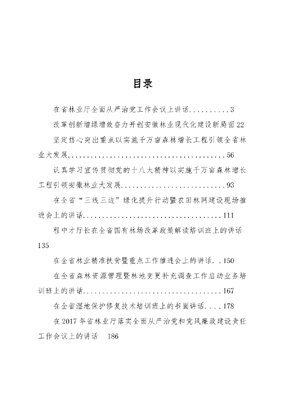 目录在省林业厅全面从严治党工作会议上讲话.3改革创新增绿增效奋力开创安徽林业现代化建设新局面22坚定信心突出重点以实施千万亩森林增长工程引领全省林业大发展..56认真学习宣传贯彻党的十八大精神以实施千万亩森林增长工程引领安徽林业大发展93在全省三线三边绿化提升行动暨农田林网建设现场推进会上的讲话111程中才厅长在全省国有林场改革政策解读培训班上的讲话135在全省林业精准扶贫暨重点工作推进会上的讲话..150在全省森林资源管理暨林地变更补充调查工作启动业务培训班上的讲话167在全省湿地保护修复技术培训班上的书面讲话.178在2017年省林业厅落实全面从严治党和党风廉政建设责任工作会议上的讲话186在省林业厅全面从严治党工作会议上讲话省林业厅党组书记厅长程中才2018年3月2日同志们:为全面落实新时代党的建设总要求,厅党组决定召开这这次全厅全面从严治党工作会议,主要任务是认真学习领会习近平新时代中国特色社会主义思想,深入贯彻落实党的十九大、省委十届六次全会和省纪委十届三次全会精神,总结回顾2017年全面从严治党工作,部署安排2018年重点任务,进一步压紧压实责任,强化政治担当,以永远在路上的执着推动全面从严治党向纵深发展,奋力谱写安徽林业改革发展和党的建设新篇章。刚才,齐新同志带领大家学习了习近平总书记在十九届中央纪委二次全会上的重要讲话精神。总书记站在新时代党和国家事业发展全局的高度,深刻阐述了党的十九大关于全面从严治党的战略部署,系统总结了党的十八大以来全面从严治党的重要经验,深入分析了党面临的风险和挑战,明确提出了当前和今后一个时期全面从严治党的总体要求和主要任务。总书记的讲话登高望远、居安思危,切中要害、振聋发聩,具有极强的政治性、思想性、针对性,为我们推动全面从严治党向纵深发展提供了强大思想武器和行动指南。我们一定要认真学习领会,坚决抓好贯彻落实。计资处、人教处、林科院、规划院4个处室单位作了发言,实际上是一次年度党建述职,也是表态安排,讲的都很好。会上通报了去年全厅5名违纪人员受到党纪政纪处理情况,表明了厅党组从严治党、从严管理干部的鲜明态度和坚定决心,希望大家从中受到警醒、受到教育。刚才我代表厅党组与厅机关各处室、厅直各单位主要负责人签订了落实全面从严治党和党风廉政建设责任书,这就立下了军令状,军中无戏言,说到就要做到,否则就要军法从事,严肃追责问责。刚刚黄昕晖同志代表省纪委驻厅纪检监察组作了一个很好很重要的讲话,着重就落实监督责任提出了明确要求,希望大家认真领会,抓好落实。下面,我代表厅党组,讲三点意见。一、2017年全面从严治党工作取得显著成效过去的一年,厅党组严格按照中央和省委的部署要求,认真履行全面从严治党的主体责任,带领全厅各级党组织和广大党员干部,高举中国特色社会主义伟大旗帜,坚持以习近平新时代中国特色社会主义思想为指导,认真学习宣传贯彻党的十九大精神,积极落实省第十次党代会部署,深入推进机关党的建设,取得了显著成绩。(一)加强政治建设,严肃党内政治生活一是严明政治纪律和政治规矩。扎实推进两学一做学习教育常态化制度化,认真开展讲政治、重规矩、做表率专题教育和专题警示教育,组织党员干部赴小岗村开展党史教育实践、赴合肥市预防职务犯罪警示教育基地和蜀山烈士陵园开展党性党风党纪教育等四个一活动,教育引导全厅各级党组织和广大党员干部树牢四个意识、坚定四个自信、做到五个纯粹,坚决维护以习近平同志为核心的党中央权威和集中统一领导,在思想上政治上行动上同以习近平同志为核心的党中央保持高度一致。二是严肃党内政治生活。认真学习党章和《关于新形势下党内政治生活的若干准则》《中国共产党党内监督条例》等党内法规,按照省委部署要求,组织指导全厅各级党组织开好讲重作专题警示教育民主生活会和组织生活会。厅党组以上率下,广泛征求意见、深刻查摆问题、开展谈心谈话,严肃开展批评与自我批评,共征求意见建议80条,班子成员间相互批评提出意见20条,并对查摆出的问题制定整改责任清单,逐一抓好整改。厅党组成员深入机关处室和直属单位实地调研党建工作,参加并指导厅直单位领导班子专题民主生活会,督促问题整改。三是加强政治文化建设。认真学习贯彻习近平总书记关于塞罕坝机械林场感人事迹的重要指示精神,在全省林业系统开展学习牢记使命、艰苦创业、绿色发展塞罕坝精神的活动,开展向廖俊波同志学习和学习原山精神、做合格林业干部等主