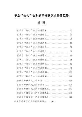 节后收心会和春节升旗仪式讲话汇编目录在节后收心会上的讲话12在节后收心会上的讲话2..21在节后收心会上的讲话3..28在节后收心会上的讲话4..46在节后收心会上的讲话5..50在节后收心会上的讲话6..58在节后收心会上的讲话7..70在节后收心会上的讲话8..78在节后收心会上的讲话9..82在节后收心会上的讲话10.85在节后收心会上的讲话11108在节后收心会上的讲话12118在春节升旗仪式上的讲话1130在春节升旗仪式上的讲话2134在春节升旗仪式上的讲话摘编1..137在春节升旗仪式上的讲话摘编2..138在春节升旗仪式上的讲话摘编3..140在春节升旗仪式上的讲话摘编4142在节后收心会上的讲话1同志们:一元复始,万象更新。今天,我们带着春节的余味,迎着春季的气息,踏着春天的步伐,满怀发展豪情、创业激情,在这里隆重召开大会。会议的主要任务是:客观总结去年成绩,全面部署今年工作,隆重表彰先进典型,号召动员全县上下围绕三年大变样战略目标,学先进、比先进、赶先进、当先进,奋勇争先,奋发图强,为我县新一年的发展创造一个良好的开局、崭新的开端、难得的开始、火红的开头。今天大会的召开,意味着我们又将开始新一轮的耕耘播种,又将开始新一年的拼搏努力,又将开始新一程的奋进跨越。借此机会,向同志们并通过你们,向全县人民致以新春祝福,祝大家在新的一年里,身体健康,家庭幸福,事业顺利,鼠年大吉!现在,我就去年政府工作情况,和新年工作安排,从三个方面谈点具体意见:一、总结成绩,坚定信心,逆势而上促发展去年以来,在市委、市政府和县委的正确领导下,我们按照一年强基础、两年求突破、三年大变样的战略部署,紧紧围绕工业进入全省第一方阵、建设全省美丽县城、办好殷实民生、营造风清气正的政治生态四大目标,大力实施七大指挥部项目推进机制,圆满完成了各项目标任务,经济社会呈现加快发展的良好态势。全年预计实现地区生产总值XXX亿元,增长X;财政总收入XX.X亿元,增长XX.X;公共财政预算收入XX.X亿元,增长XX.X。一年来的工作,主要表现在五条路上:第一,过去一年,我们走上了产业优化的升级路。一是农业提档升级。全县完成粮食播种面积XXX.X万亩,实现总产XX.X万吨,增长X.X,改造农田水利设施XXX余处,新增市级以上农业产业化龙头企业XX家、省级著名商标X个,全县农业产业化组织带动农户达XX.X万余户,约占全县总农户数的XX。二是工业提质升级。全县新增规模以上工业企业XX家,完成规模以上工业增加值XX.X亿元,增长XX.X;完成工业固定资产投资XX.X亿元,增长X.X。电子信息、装备制造、电气设备等新兴产业发展势头强劲,成功获批省级小微企业创业园、省级钢结构产业基地,全面建成了国检监管区、海关保税仓库、XXX亩的园区生活配套区等功能设施,园区发展框架基本形成。三是服务业提速升级。全县电商服务网络基本形成,医疗器械、文化产品等X个基地相继开业,培训网创人员XXXX人次,新建村淘点XXX个,电商交易额达XX.X亿元;新发展社会消费品零售总额限上企业、重点服务业企业X家,社会消费品零售总额实现XX.X亿元,增长XX。第二,过去一年,我们走上了城乡变样的示范路。一是打造了美丽县城。全面建设了集天然浴场、水上运动、生态景观等为一体的青岚湖森林公园,建成了青岚湖景观游步道、中山南大道高铁段、沿江路、中山大道等工程,形成了湖城一体、水天一色的城市新景观;扎实推进了城区治脏、治乱、治堵、治差、治违工程,继续保持了违法建设零增长。二是建设了美丽乡村。整合资金XXXX余万元,重点打造了XX个美丽乡村示范点,精心实施了XX个大项目、XXXX个小项目,美丽乡村示范点已经成为村庄整治的典范和样板。三是保护了美丽生态。按照四个减法、两个加法的要求,进一步加大了水质保护力度,军山湖整体达二类水质,青岚湖稳定在三类水质;完成造林绿化任务X.X万亩,新增国家级生态乡镇X个、省市级生态村XX个