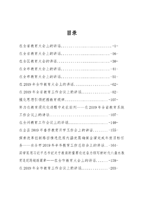 目录在全省教育大会上的讲话..-1-在全省教育大会上的讲话.-16-在全区教育大会的讲话-30-在全市教育大会上的讲话.-41-在全市教育大会上的讲话.-51-在2019年全市教育大会上的讲话.-62-在2019年全省教育工作会议上的讲话-82-强化思想引领把握教育规律.-107-努力在教育现代化进程中走在前列——在2019年全省教育系统工作会议上的讲话-107-在全州教育工作会议上的讲话..-140-在全县2019年春季教育开学工作会上的讲话..-155-探索改革创新路径推进优质内涵发展确保全面完成年度目标任务——在全市2019年半年教育工作总结会上的讲话..-164-深学笃用习近平总书记关于教育的重要论述奋力续写新时代六盘水教育追赶跨越新篇章——在全市教育大会上的讲话-178-在2019年全市教育工作会议上的讲话..-203-在2019年全省教育工作暨全面从严治党工作会议上的讲话-232-在2019年全市教育工作会议上的讲话..-262-在2019年全市教育工作综合会议上的讲话.-296-在全省教育大会上的讲话(2019年2月26日)中共江西省委书记刘奇这次全省教育大会的主要任务是:以习近平新时代中国特色社会主义思想为指导,深入学习贯彻全国教育大会特别是习近平总书记重要讲话精神,总结我省教育事业发展成就与经验,研究部署当前和今后一个时期全省教育工作。长期以来,教育部对我省教育工作给予了有力指导和关心支持。今天,教育部副部长翁铁慧同志又亲临会议指导并作了讲话,对我省教育工作给予了充分肯定,对我们进一步推进教育改革发展提出了明确要求,针对性、指导性很强,大家要认真学习贯彻。党的十八大以来,在以习近平同志为核心的党中央坚强领导下,我们坚决贯彻中央决策部署,坚持把教育摆在重要战略位置,全面加强党对教育工作的领导,大力实施教育强省战略,推动全省教育改革发展取得新成绩。一是教育优先发展地位持续巩固。坚持教育事业优先规划、教育投入优先保障、教育资源优先配置,全省教育经费总量从2012年的775亿元增加到2018年的1374亿元,增长77.29%,成为财政第一大支出项目,有力推动了教育事业发展。二是立德树人工作扎实有效。建立健全省领导联系高校制度,扎实开展文明美丽校园创建、高校领导双体验日等活动,推出弘扬井冈山精神五个一举措,编写红色文化教材,打造红色育人实践基地,探索形成了彰显江西特色、大中小幼一体化的育人体系。三是教育均衡发展稳步推进。学前教育基本实现每个乡镇都有1所公办中心幼儿园,义务教育全域通过国家教育督导评估,高中阶段教育普及率达到90.5%,职业教育持续发展,高等教育质量实现新突破,普通高校由2012年的88所增加到102所。四是教师队伍建设全面加强。全省专任教师数量由2012年的51.21万人增加到2018年的58.37万人,增长14%。在全国率先建立长期从教教师荣誉制度,开展两届感动江西教育年度人物评选,全省尊师重教氛围日益浓厚。五是教育贡献力和群众满意度明显提升。围绕服务经济社会发展,大力推进产学研用深度融合,成功举办2018国际产学研用合作会议,先后实现了国家技术发明一等奖、国家教学成果一等奖、教育部人文社科一等奖的新突破。加大教育精准扶贫力度,提前完成24个贫困县农村学校营养餐改善计划,人民群众教育获得感进一步增强。这些成绩的取得,得益于习近平新时代中国特色社会主义思想的科学指引,得益于以习近平同志为核心的党中央的坚强领导,离不开教育部的指导帮助,倾注了全省人民的智慧心血,也凝结着全省教育系统广大干部职工的辛勤汗水。在此,我代表省委、省政府,向关心支持我省教育事业发展的国家有关部委、社会各界人士表示衷心感谢!向长期奋斗在教育战线的同志们表示崇高敬意!习近平总书记在全国教育大会上的重要讲话,站在党和国家事业发展全局的高度,全面总结了党的十八大以来我国教育事业改革发展取得的显著成就,深刻分析了教育工作面临的新形势新任务,科学回答了我国教育改革发展的重大理论和实践问题,为推进新时代教育事业发展提供了强大思想武器和行动指南。我们要深入学习贯彻,以更大力度、更实举措,加快推进教育强