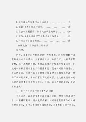 1.在区政协工作务虚会上的讲话.-3-2.镇2019年务虚工作会议-30-3.在全市质量提升工作推进会议上的讲话.-38-4.在2019年全市组织工作务虚会上的讲话.-49-5.广电工作务虚会发言..-60-在区政协工作务虚会上的讲话同志们:刚才,各委办以提质增效为总要求,以找准2019年度履职着力点为总目标,大家畅所欲言,各抒己见,达到了凝聚智慧,统一思想的目的。各位副主席对分管工作作了点评,并就进一步做好明年重点工作提出意见,很有针对性和指导性。半天的会议,经过大家会前的精心准备和会上的相互交流,取得了较好的效果,请办公室认真进行梳理,把这些建设性的意见吸纳到常委会工作报告中去。下面,结合大家的发言,我讲三点意见:一、关于今年工作怎么看的问题今年以来,区政协各委办结合自身实际,积极拓展履职平台、创新履职载体、健全履职机制,切实增强政协工作的针对性和实效性,各项工作均取得明显成效,主要有以下四个特点。一是履职内容贴得紧。各委办紧贴上级要求、区委中心工作和政协职责定位,落实年初制定的专题协商、专项调研、专项视察和民主监督的履职任务,所做的各项工作得到区委、区政府及相关部门的充分肯定,所提意见建议得到充分吸纳。如社法民宗委、经科委联合开展营商环境建设民主监督和专题协商议政活动,创立营商环境体验团,从招商引资、办企便利度、建设项目审批、网上审批互联、税收征管等六方面监督营商环境提升成果,引起了区委李书记的高度重视,李书记到会听取委员发言并在《优化营商环境建设调研报告》上作出长篇批示。城建资环委围绕老旧小区加装电梯的调研报告区委李书记也十分重视,专门排出半天时间听取区政协的调研情况汇报,并领办此项政协提案。二是履职平台载体新。各委办从搭建平台、履职手段和制度建设等方面入手,不断探索创新政协履职的平台、形式和渠道,在社会上取得了较好的反响。如各专委会根据《关于加强政协委员工作室建设的实施意见》,打造了特色鲜明、形式多样、功能各异的委员工作室,经验做法得到省政协葛慧君主席等领导充分肯定。委员工委在整合政协讲坛、议政沙龙等平台,成立区政协委员讲习所,得到浙江日报等主流媒体的点赞。港澳台侨外事委牵头举办凝聚侨心侨力讲好中国故事跨境协商会,将请你来协商工作与远程跨境连线有机融合,得到了与会的省政协马光明副主席的肯定。经科委举办了创新·提升·发展微论坛活动,邀请政协委员与社会各界专家、学者、企业家等一起互动,为委员们开拓了一个思想交流的新区域。三是履职实践成果实。提案委突出抓实会前培训和提案征集引导等前期工作,九届二次会议以来,共收到委员以提案形式提出的意见、建议304件,立案266件,立案率为87.5%,初步实现提案工作量增质提。办公室从加强社情民意信息员队伍建设上着力,强化选题、采编、反馈等环节培训指导,全年共编发社情民意80期,其中,省政协采用8期,省领导批示2期;全国政协采用5期,中办采用一期。学习文史委相继编辑了《瓯潮逐浪》、《江心屿的传说》等书籍,《五马街传说》也即将完成出版工作,充分地发挥文史的存史、资政、团结、育人的社会功能。文教卫体委以书画院搬迁新址为契机,进一步理顺运行模式,提升工作层次。四是履职主体意识强。坚持为民履职理念,搭建为民服务的平台,优化服务群众的方式和载体,充分发挥政协委员的主体作用。区政协法律服务团成员已经连续两年坚持每月在工人文化宫开展法律咨询活动,并增加了为企业健康体检活动和送法进社区进乡村活动,为2300余名市民群众给予帮助。政协名师公益学堂今年已连续开展了8次送教育下基层活动,共有1000多人次参与活动。特别是在本月10日举行的政协委员服务日活动,有130多名政协委员参与现场活动,内容涉及文艺演出、法律咨询、书法创作、涉外涉侨服务咨询、食品安全咨询、送医送药送温暖和基层慰问等。在肯定成绩的同时,也存在一些问题需引起大家的重视:一是工作开展平衡不够;二是工作完成质量不够;三是工作安排统筹不够。二、关于明年工作干什么的问题九届区政协一次以来,我们每年都有一个工作主题,也就是对新一年政协的工作任务目标进行定位。我们将去年定为基础夯实年,既通过修订完善各种规章制度等方式,提升政协工作制度化、程序化和科学化水平;将今年定位为拓展深化年,既通过拓展深化政协各项履职载体和平台,力争在履职实效和能力建设等方面有一个新的提升,从两年的实践来看,我们基本实现了上述目标。2019年,是九届区政协承上启下的关键一年,根据全国和省市政协的部署要求,结合刚才各位副主席和同志们的发言,我们把区政协明年工作的主题为提质增效年,区政协组织和广大政协委员