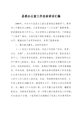 县委办公室工作总结讲话汇编200*年,中共××县委办公室在县委的正确领导下,高举邓小平理论伟大旗帜,认真贯彻落实三个代表重要思想,紧紧围绕县委工作中心,充分发挥办公室职能作用,不断强化三服务意识,全面加强干部队伍建设,努力提高智力服务水平,圆满完成了各项目标任务,取得了显著成绩。一、强化智力服务,当好参谋助手(一)信息工作卓有成效。信息工作坚持求快、求真、求全、求精,充分发挥党委信息的主渠道作用。紧扣县委工作中心,不断拓宽信息渠道,延伸信息触角,坚持把领导关注和干群关心的热点、难点、焦点问题作为信息工作服务的主攻方向。信息的时效性、针对性、准确性不断增强,为领导掌握情况、科学决策、指导基层工作、解决各种问题提供了参考依据。办公室全体信息工作人员紧紧围绕各级党委领导的需求和县委工作中心齐心协力上报信息,在省、市继续保持名列前茅。全年共上报信息1000多条,被省委办公厅、市委办公室分别采用条、条。编发《××信息》期。全年无重大信息迟报、漏报现象发生。为畅通信息渠道,进一步建立健全党委信息工作网络,对全县63个乡镇、个县级部门分别确定了信息工作分管领导和信息员。县委信息中心以优质高效的工作质量和服务水平多次受到上级领导好评。(二)督查工作注重实效。通过人员调整,进一步充实了督查室力量。按照年初制定的《关于做好2002年督促检查的意见》,切实加大督促检查力度。坚持对县委重大决策的落实情况、全县主要工作目标运行情况进行重点督查;对热点、难点、焦点问题进行跟踪督查;对减轻农民负担、企业产权制度改革、农村税费改革、处法、全县社会稳定、合金会清欠兑付等情况进行专题督查。全年完成县委领导批示件件,开展专题督查个,编发《督查通报》期,上报市委办公室督查材料篇,被市委办公室采用单篇篇,综合篇,位居全市前列。上报省委办公厅督查材料篇,采用篇。对省、市委交办事项办结率达到100%,做到事事有着落,件件有回音。由于强化了督查工作责任制,实行目标管理,注重督查实效,有力保证了县委各项决策的贯彻落实和政令畅通。(三)调研工作不断加强。调研工作围绕县委中心工作和领导决策,针对全县经济发展中的主要矛盾和问题有的放矢,超前性和综合性得到充分发挥。如在全县争创三个一流活动和企业改制等工作中,坚持深入到各乡镇、机关、企事业单位进行调研,形成了有价值的调查报告,为县委领导总揽全局、科学决策提供了深层次、高质量的服务。办公室全年撰写或协助领导撰写的调研报告、理论探讨文章、经济工作材料被市级以上报刊采用篇。编发《内部参考》期,内参性、服务性、可读性受到领导好评。(四)办文办会规范运作。公文处理严格按照程序运作,规范了各级办文行为,坚持科学化、制度化、规范化,使乱办文、倒办文现象得到纠正和控制。办公室工作人员在文稿拟草过程中,深刻领会县委领导意图和要求,全面了解实际情况,认真思考,细心操作,保证文稿观点鲜明,文字精炼,表达准确,层次清楚,能准确把握政策要求和体现县委工作思路。全年共承办县委文件100多个、函件(报告、请示)个。编发《工作通报》期、《县委办公会议通报》期。办会会前加强预见性和计划性,做好通知、报到、食宿安排、材料等准备工作;会中灵活机动安排做好茶水、记录等服务工作;会后督查及时,贯彻有力,落实到位,确保会议意图的实现。全年承办(协办)市、县级各种会议100多个,拟写领导讲话100多篇。(五)综合协调落到实处。一是积极协调好办公室内部工作。各科室互相配合,互相支持,分工协作,步调一致,使办公室整体战斗力得以充分发挥。二是努力协调好部门单位工作和下级工作。与各部门单位之间互相尊重,大事讲原则,小事讲风格,遇事常通气、常商量、常配合,共同妥善处理各种事务。对下协调坚持以诚待人、以理服人,主动加强联系,加强指导,努力把不同意见统一到党的政策、县委决策和工作目标上来。三是认真做好信访和重大突发事件处理工作。信访工作坚持为民服务、为民分忧,认真实施《信访条例》,高度重视初信初访的处理,切实推行逐级上访制度,对来访群众热情接待,耐心细致做好群众工作,努力把矛盾化解在基层,消除在萌芽状态,遏制集体上访和越级上访。对信访来函严格按照程序操作,及时将情况上报或反馈。重大突发事件坚持急事急办,及时上报,全年协助领导处理重大突发事件起。四是机要、档案、保密、网络建设等工作迈上台阶。机要工作充分发挥密码主渠道作用,积极为县委、基层和群众提供服务。档案工作按标准完成了年度文书档案、财务档案、综合档案的立卷归档任务,获得了县级主管部门颁发的《合格证》。保密工作进一步完善了保密制度,加强了工作人员的保密责任,全年无丢失文件和失密、泄密事件发生。党政信息网络为文秘人员提供了大量信息,现代办公自动化初见成效。二、强化后勤管理,做到保障有力行政后勤工作千头万绪,较为繁琐,