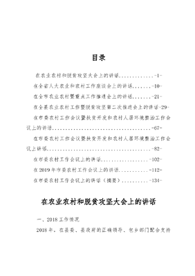 目录在农业农村和脱贫攻坚大会上的讲话.-1-在全省人大农业和农村工作座谈会上的讲话.-10-在全市农业农村暨重点工作推进会上的讲话.-21-在全县农业农村工作暨脱贫攻坚第二次推进会上的讲话-29-在市委农村工作会议暨扶贫开发和农村人居环境整治工作会议上的讲话.-67-在市委农村工作会议暨扶贫开发和农村人居环境整治工作会议上讲话-82-在市委农村工作会议上的讲话-102-在2019年市委农村工作会议上的讲话..-112-在市委农村工作会议上的讲话(摘要).-134-在农业农村和脱贫攻坚大会上的讲话一、2018工作情况2018年,在县委、县政府的正确领导、包乡部门配合支持下,全中心以脱贫攻坚为统揽统领,聚焦精准扶贫精准脱贫,农业农村和脱贫攻坚工作取得了较好工作成效。减贫305户1070人,5个贫困村全部达标退出,剩余贫困户60户111人,贫困发生率从2015年底的13.8%降至0.8%。(一)落实主体责任,下足绣花功夫,脱贫攻坚取得明显成效。夯实产业发展基础,积极完善各村基础设施建设,全年累计投资1490余万元,完成各类基础设施和公共服务设施项目10个,产业发展项目3个,水、电项目2个进一步夯实了村级经济发展基础,初步形成了光伏、生态农业、设施蔬菜、油用牡丹、黄花菜等多业并举的新格局和生猪、肉牛、肉驴、肉羊等新型经营主体。以直接帮扶、委托帮扶、股份合作等模式带动贫困户439户1480人发展产业,实现贫困人口人均增收532元,确保易地搬迁户和特殊困难户有了稳定的收益。(二)深化农村集体产权制度改革,盘活村集体资产,村集体经济活力显现。17个行政村全部建成村级股份经济合作社,初步建立健全归属清晰、权责明确、保护严格、流转顺畅的现代产权制度,使农民真正吃上了定心丸;李木庄、火留、李家、永丰、桥上、曹村等6个村村级集体股份经济合作组织承接了经营主体,分别与陕西远途信息科技有限公司和陕西汤姆森电力科技有限公司,发展光伏产业,并建立了利益联结机制,以股份合作形式带动贫困户231户817人增收。(三)铁腕治污常抓不懈,定期巡查形成高压态势,清新马家成效显著。对辖区养殖场、企事业包括机关单位使用烟煤锅炉等污染源进行果断取缔,共拆除烟煤炉32个。街道食堂饭店采取停业整顿的形式限期更换了燃气炉。取缔煤炭销售点3家,增设洁净煤销售点1个。通过污染物清洁活动,对10个规模性养殖场,1个肉鸡养殖专业村进行了集中整治。建立健全道路垃圾、三堆治理制度,村内村外道路及公共服务场所清扫管护制度,秸秆禁烧、粪污熟化处理管护制度等,为清新马家建设奠定了坚实的基础。(四)创新社会管理,落实保障机制,推进大局和谐稳定。一是信访稳定工作。全年化解矛盾纠纷15起,办结群众来信来访20件,化解率100%。基本做到早发现、早处置。二是安全生产工作。将安全生产工作纳入了日常化管理,全年集中对食堂、药品经营、农资门店、交通运输、建筑工地、中小学食堂、烟花爆竹、森林防火、石油经营、校园周边安全隐患专项排查12次,下发整改通知书10份,发放宣传资料800余份,有效遏制了不安全事故的发生。三是平安创建工作。落实了一村一警工作制度,完善治安中心户长和红袖章队伍长效机制,定期不定期开展治安巡逻,有效防范了各类违法犯罪活动的发生,全年组织开展法制宣传8次,印发法律宣传资料1000余份。全中心公众安全感达到95.5%以上,社会治安满意率达到95%以上,平安知晓率达到96.5%以上,为百姓营造了良好的生产、生活环境。同志们,2018年,可以说是极其不寻常的一年,也可以说是全中心上下克难攻坚、奋力进去,取得丰硕成果的一年,成绩的取得,是乡村干部职工、帮扶单位和广大群众共同努力结果,在这里我代表中心党工委、中心向大家表示衷心的感谢。二、2019年工作思路及目标:2019年,是新中国成立70周年,又是决胜全面建成小康社会关键之年。更是聚焦追赶超越,践行五个扎实,全面落实五新战略任务,全力以赴抓好脱贫摘帽质量提升,蓄力乡村振兴战略开局之年。按照中心党工委统一部署,全中心农村农业工作总体思路是:坚持以脱贫攻坚为统揽统领,以脱贫攻坚巩固提升为主线,围绕稳定增收,提升产业质量和规模为重点,坚持政策支持力度只增不减、工作力度只增不减,帮扶措施只增不减,帮扶力量只增不减。紧盯796户2862人巩固提升,实现2019年度6户19人的减贫任务,不断促进农民增收农村发展,高质量促进马家社会经济持续发展。三、2019年重点工作任务(