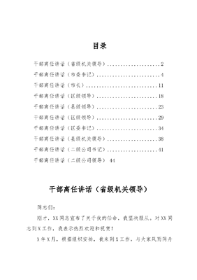 目录干部离任讲话(省级机关领导)..2干部离任讲话(市委书记)4干部离任讲话(市长)11干部离任讲话(区级领导)..18干部离任讲话(县级领导)..23干部离任讲话(区级领导)..29干部离任讲话(区委书记)..34干部离任讲话(县级机关领导).38干部离任讲话(二级公司书记).41干部离任讲话(二级公司领导)44干部离任讲话(省级机关领导)同志们:刚才,XX同志宣布了关于我的任命,我坚决服从。对XX同志到X工作,我表示热烈欢迎和祝贺!X年X月,根据组织安排,我来到X工作。与大家风雨同舟X年,这期间,自己始终本着认真做事的态度,忠诚和热爱X事业,感受到X工作的艰辛,但我无怨无悔;也感受到上级领导、班子集体和X全体同志的信任与支持。此刻,既有对工作的眷恋,也有对同志们的依恋不舍。第一句话,衷心感谢。X年来,我和同志们一道,经历了艰苦努力,付出了艰辛劳动,X由零到一、从小到大、由弱变强,我们确确实实为X事业做了一些事情。如果说有成绩的话,要归功于总局党组的正确领导,归功于前任领导班子和许多老领导、老同志打下的良好基础,归功于与我合作共事的领导班子全体成员的紧密配合,归功于X全体干部的鼎力支持和辛勤努力。我要诚心诚意地向大家表示衷心感谢!第二句话,深表歉意。一是给大家的工作强度和压力太大了。大家发扬白加黑、5+2的苦干精神,没日没夜地工作、加班加点地工作,许多同志多年没有休假、许多同志带病坚持工作,吃了很多苦,受了很多累,替我和班子成员担负了很多压力,承受了很多委屈,令我的内心十分不安。二是很多事情没有做完、没有做好。由于各方面的原因,有很多事情,我和班子成员看到了、想到了、也实施了,但还没有和没来得及做好,留下了不少遗憾。三是就我本人而言,有时说话比较生硬,有时批评同志很重,甚至有意无意伤害到大家,在此真诚向大家道歉。不过有一点向大家解释一下,不管这些批评是否伤害到大家,都是出于工作考虑,没有任何个人私怨。大家都是我的好同事好朋友、好兄弟好姐妹。我相信,路遥知马力,日久见人心。第三句话,真诚祝愿。根据总局党组的决定,我离开X后,将由XX同志主持X全面工作。XX同志群众基础好,工作经验丰富,善于带班领队,善于驾驭全局,善于在复杂的情况下开创工作新局面。我希望,大家一定要传承和发扬X的好传统,像关心、爱护、支持我一样,关心、爱护、支持XX同志,X的干部历来就想干事、会干事、干得成事而又能共事、不出事。因此,我真诚祝愿XX同志能够团结带领X全体干部,奋发有为,干事创业,不断取得新的成绩。同时,请同志们放心,在新的岗位上,我一定会努力工作,不辱使命,开创新局面,以优异成绩回报组织、回报大家。请大家继续关心我、支持我,我永远不会忘记大家。再次谢谢大家!本文系作者原创投稿,仅供学习参考,请勿照搬照抄!干部离任讲话(市委书记)尊敬的X部长,同志们:刚才,X部长宣布了省委的决定,X部长代表省委作了讲话X部长的讲话,充分肯定了近年来XX所取得的成绩,对XX未来发展提出了新的更高的要求,立意高远、重点突出、针对性强,希望大家认真学习,深入贯彻落实。最近,组织上决定调我到省里工作,并决定由XXX同志接任XX市委书记,这是对XX工作的肯定、对XX领导班子的肯定、对XX干部队伍的肯定,体现了省委对XX发展的高度重视、大力支持和关心厚爱。我完全拥护省委的决定。XX同志是一名具有高知识背景的领导干部,他省级机关的工作经历,积累了宏观视野和战略把握的功底;他XX、XX两市政府的主政经历,积累了领导统筹工作的本领和适应性。我们XX作为一个X城市,工作干劲要向X学习,发展思路要向苏南看齐,而XX同志的工作经历,为做好XX工作创造了最好的条件和可能。我完全赞同XX同志任市委书记,希望同志们像过去支持我一样,全力支持XX同志的工作。我相信,在以XX同志为班长的市委坚强领导下,XX的改革发展一定会取得新的更大突破,XX的明天也一定会更加美好!时光真是转瞬即逝。20XX年X月X日,我到XX工作,与同志们见面的情形仿佛就在昨天。此刻,却要在这里和大家告别,面对一张张熟悉的面孔,面对一起打拼一起奋斗的战友、同事,我的心中暖流涌动、百感交集。我们讲,党的事业是铁打的营盘,党的干部是流水的兵,干部一任接着一任干,新老更替是个正常的过程。虽然自己有长期作战的思想准备,有在XX多干一些时间的主观愿望,但实际上我