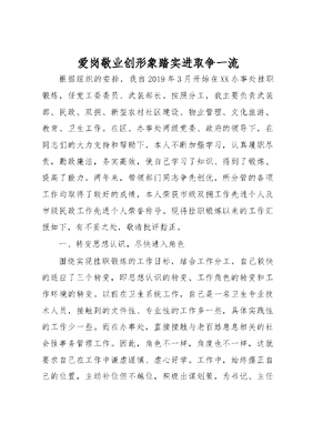 爱岗敬业创形象踏实进取争一流根据组织的安排,我自2019年3月开始在XX办事处挂职锻炼,任党工委委员、武装部长。按照分工,我主要负责武装部、民政、双拥、新型农村社区建设、物业管理、文化旅游、教育、卫生工作。在区、办事处两级党委、政府的领导下,在同志们的大力支持和帮助下,本人不断加强学习,认真履职尽责,勤政廉洁,务实高效,使自己学习了知识、得到了锻炼、提高了能力。两年来,带领部门同志争先创优,所分管的各项工作均取得了较好的成绩,本人荣获市级双拥工作先进个人及市级民政工作先进个人荣誉称号。现将挂职锻炼以来的工作汇报如下,有不妥之处,敬请批评指正。一、转变思想认识,尽快进入角色围绕实现挂职锻炼的工作目标,结合工作分工,自己较快的适应了三个转变,即思想认识的转变、工作角色的转变和工作环境的转变。以前在卫生系统工作,自己是一名卫生专业技术人员,接触到的文件性、专业性的工作多一些,具体实践性的工作少一些。而在办事处,直接接触与老百姓息息相关的社会性事务管理工作。因此,角色不一样,角度也不一样,这就要求自己在工作中谦虚谨慎、虚心好学。工作中,始终摆正自己的位置,主动补位但不越位,积极出谋划策,为书记、主任当好助理。努力克服工作、生活中的困难和问题,安心、静心、专心工作和学习。认真遵守区委关于下派挂职干部各项规章制度和管理规定,做到工作、学习上高标准、严要求,生活上低标准、艰苦朴素。正确处理好学习锻炼和完成各项工作的关系,自觉做到慎独、慎行,用实际行动树立挂职干部的形象。二、加强理论学习,提高自身素质在思想上能够同区、办事处两级党委、政府保持高度一致自律上同党风廉政的规定、准则保持高度一致,自觉以习近平新时代中国特色社会主义思想武装头脑并指导实践。坚持把学习作为加强个人修养、提高综合素质的不竭源泉,始终放在首位,持之以恒,常抓不懈,在积极参加集体学习的同时,抽时间认真开展自学,向书本学,向同事学,向实践学,使自己的工作思路进一步开阔,能力进一步增强。一是认真学习了党的各项方针、政策,重点学习了党的十九大和十九届二中、三中四中全会精神,。努力把科学的理论内化为毫不动摇的执着追求,外化为坚定自觉的实际行动。通过学习,自己的理论素养有了新的提高,理想信念更加坚定,政治敏锐性和政治鉴别力进一步增强,始终在思想上、政治上、行动上同党中央保持高度一致。二是扎实学习了履职所需的专业知识。学习省、市、区重要会议和文件精神,着力吃透下情,通过督查、调研等机会,系统全面地掌握了解各社区、各科室的工作实践,并联系实际进行了深入思考,注重把学习成果转化到以文辅政的工作实践中来,不断提高服务决策的水平,增强驾驭工作的能力。三是深入学习了党风廉政建设方面的相关规定,深刻认识权为民所用、情为民所系、利为民所谋的真实内涵,增强了大局意识、责任意识、廉洁自律意识和防腐拒变的能力。三、围绕本职工作,认真履行职责挂职以来,我积极做好自己分管的武装、民政、文化旅游教育、卫生工作,不断完善目标管理体系,切实做到了思想认识到位、工作部署到位、措施落实到位,有效促进了各项工作的开展和落实。完成好武装部工作:开展民兵组织整顿工作,着眼建设全面过硬的战略预备力量,按照突出重点、提高质量、推进转型的思路,重点抓好基干民兵的重点分队建设。认真开展民兵训练,积极参加市级点验。开展基层武装部规范化建设工作。认真落实上级部门的要求,加强了基层武装部的全面建设,做到了政治合格,组织健全,职责明确,设施完善,制度健全,资料齐全,全面达到了基层武装部三室一库的建设标准,顺利通过了上级的检查验收,并多次迎接上级领导的检查,得到一致好评。开展兵役登记和征兵工作。兵役登记工作充分搞好了调查摸底,加大了宣传力度,做到了早入手,早发动,及时准确地完成了上级交给的任务。按照区人武部的统一安排,组织开展了报名参军人员的健康体检、家访、政审等工作,圆满完成了工作任务。面对农村兵员难以征集的趋势,武装工作正受到多方面的考验,但我会努力做到在干中学,使我办事处的民兵工作有新的起色,坚决完成上级交给的各项工作指标和任务;加强自身理论知识和操作技能的学习,积极参加市、区组织开展的专武干部集训,取得了理论知识考试全市第一名的好成绩。四、履行一岗双责,严格廉洁自律长期以来,自己能坚持做到常修为政之德,常怀律己之心常思贪欲之害,常弃非分之想,自觉遵守领导干部廉洁从政的各项规定,事事处处以是否符合科学发展观,是否体现党员先进性来要求自己,自觉将清清白白做官,老老实实做人,踏踏实实做事作为处事为人的基本准则,力戒浮躁之心,浮夸之风和浮虚之能。在实际工作中,注意团结同志,充分发扬民主,虚心听取不同意见,不断总结经验,努力改进工作方法,积极开展批评和自我批评。同时按照履行一岗双责的职责和要求,自己对所分包的村,部门和人员严格要求