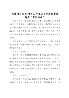 在集团公司2019年工作会议上作表态发言两点深切体会深切体会到,工作报告政治站位高、目标定位准、思路谋划新、工作部署实,充满深沉的忧患意识,展现强烈的使命担当,既有战略思考又有务实安排,既讲重点任务又有保障措施,进一步提升了我们对全面可持续发展、两个三年、两个十年战略部署的理解和认识,更加坚定了我们攻坚克难的信心和决心。深切体会到,当今世界正处于百年未有之大变局,创新驱动风起云涌,科技革命形势逼人,能源革命蓄势待发,支撑引领重任在肩。简介三大平台近年来,☆认真贯彻落实党组决策决策,逐步构建了以经济、高效生产清洁油品为目标的清洁炼油技术平台,以绿色、低碳、高附加值为目标的新兴资源能源技术平台,以节能、环保、长周期运行为目标的公用技术平台三大技术平台,一个具有光荣传统、丰厚积淀的老院,在转型、搬迁后正焕发出勃勃生机。坚定一个表态石化发展,科技先行。我们必须担当重任,勇攀高峰,推动建设技术先进、装备优良、队伍精干、管理高效的世界一流能源化工科学研究院,为中国石化全面可持续发展再立新功。强调四大举措大力推进原创和颠覆性技术创新,提升对中国石化发展的支撑引领能力。习近平总书记指出,关键核心技术要不来、买不来、讨不来。引进消化吸收再创新这条路我们已经走了几十年,今后要支撑引领产业发展,必须直面高新技术获取日益困难的严峻现实。科技工作要认真落实党组部署,围绕实现四个技术创新,着力提升支撑引领能力。一是瞄准前沿、潜心探索,以坚实的基础研究催生更多原创性、颠覆性技术创新。二是开阔眼界、拓展领域,以工匠精神推动各类平台化技术创新。三是开放合作、善于借鉴,以他山之石促进传统技术跨界创新。四是关注市场、服务企业,以实际需求引发问题导向性技术创新。持续深化科研体制机制改革,充分激发科技人员创新创效活力。身处新时代,要为中国梦和石化梦的实现贡献科技工作者的力量,就要继续深化科研体制机制改革,消除束缚科技人员创新创业的有形和无形桎梏,让一池春水变为涌动的一江春潮。一是进一步完善做实创新团队负责人制。二是加快探索科技创新模式转变。三是积极探索经营模式多样化。四是深入研究建立符合应用型研究院特点的激励约束机制。全面落实人才强企工程,实现人力资本价值最大化。没有人才,一切归零。科技事业的兴衰成败、科研院所的生存发展,关键在人才。我们要认真贯彻落实集团公司组织人事工作会议、人才强企工程推进会和党组关于科技工作的重要部署,围绕人力资本增值,夯实人才强院工程。一是营造从战争中学习战争的人才成长环境。二是探索建立生聚理用的人才管理体系。三是落实不拘一格用人才的理念。四是强化战略人才培养。充分发挥党建优势,为科技创新提供坚强保障。认真学习贯彻习近平新时代中国特色社会主义思想,以党的政治建设为统领,突出抓责任、抓质量、抓实效,融入中心、下沉重心、凝聚人心,将党建工作与科技创新一体化推进,实现穿透运行、有机融合。一是压实党建责任。二是扎实推进组织力提升工程。三是深化党风廉洁建设。四是强化思想政治引领。推进五位一体以习近平新时代中国特色社会主义思想为指引;认真学习贯彻集团公司工作会议精神;大力实施自主创新、重点跨越、绿色低碳、引领新兴、差异特色、支撑一流的科技发展战略;满怀豪情地拥抱四大革命、跨越四大关口;勇当创新发展的引领者、推动者、践行者。